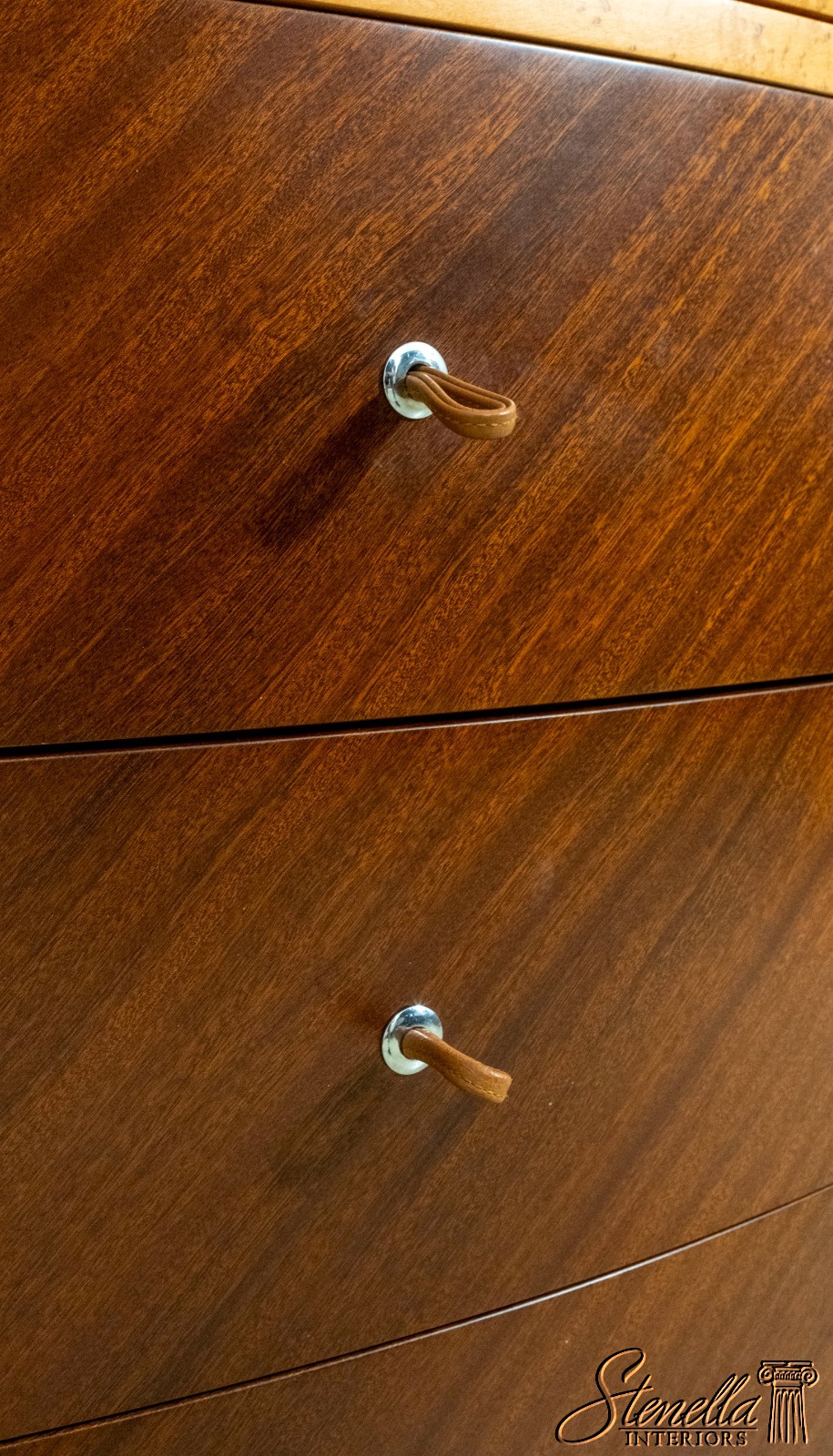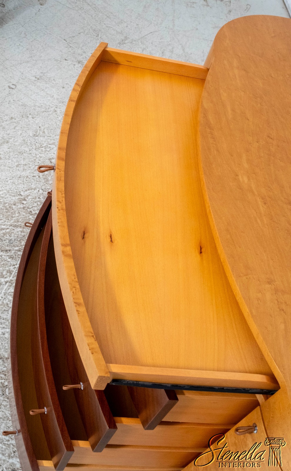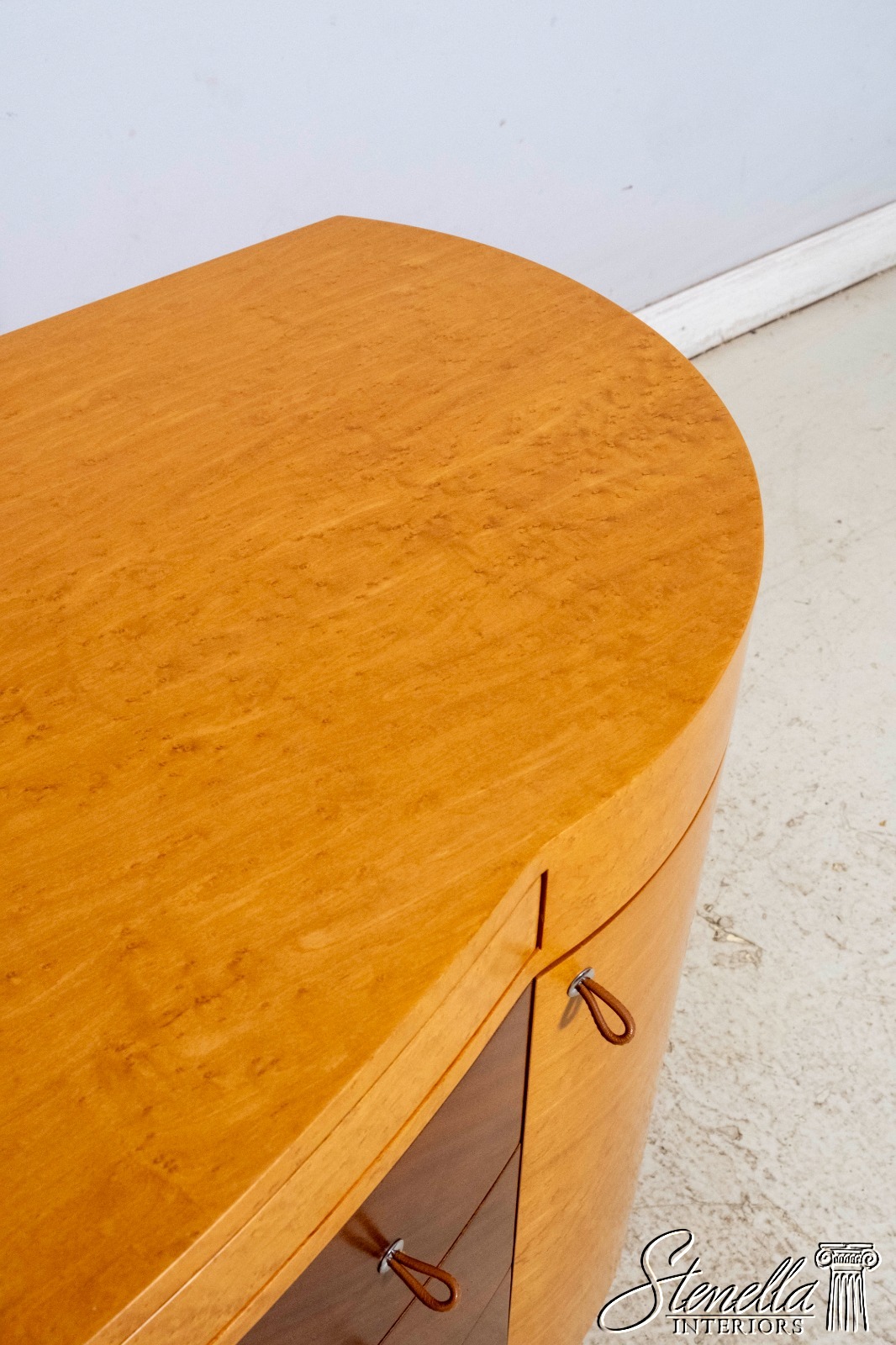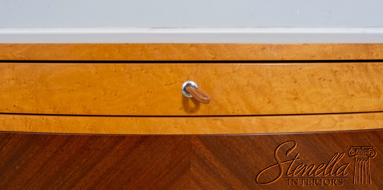 Details: Adjustable Shelves Makes Great Dresser, Console Or Used Under TV High Quality Construction Large Impressive Cabinet Nice Inlay Work Throughout 5 Drawers - Leather Pulls Stunning Birdseye Maple Case w. Mahogany Drawer Fronts Traditional Style Maple Tapered & Curved Legs Rounded Side Cabinets Un-Marked As To Manufacture Serpentine Front Offered @ Fraction Original Retail Cost