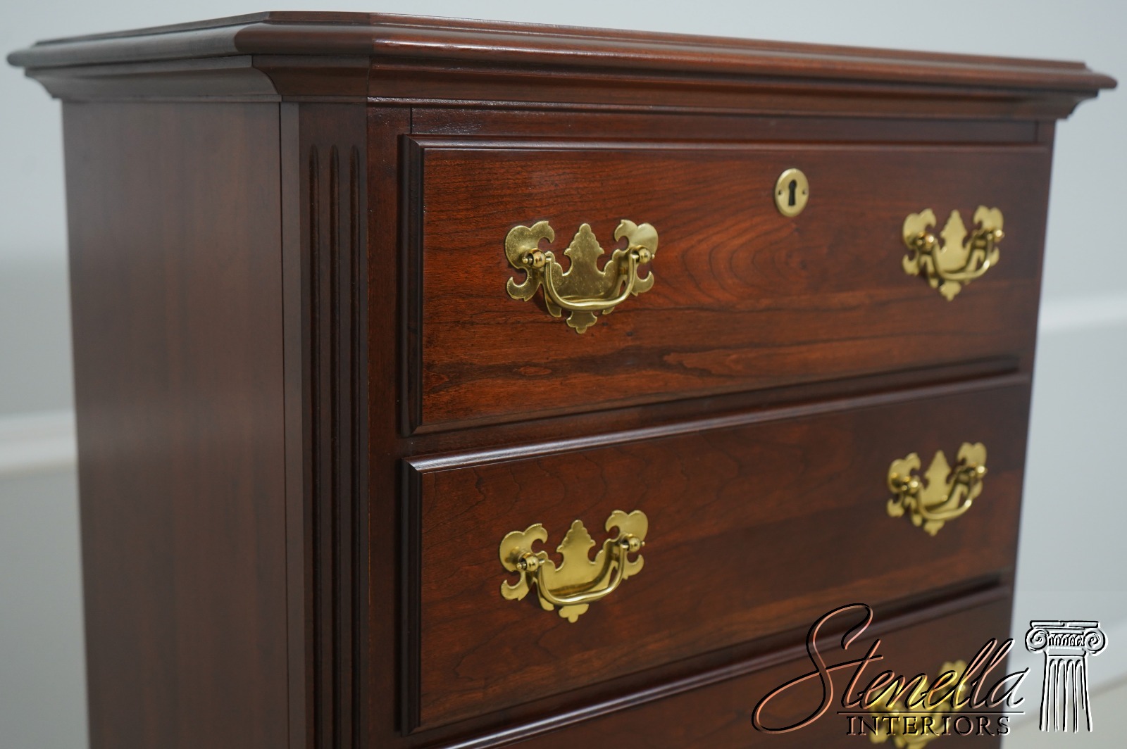 Details: Cherry Bracket Feet Quality Construction 18 C. Design Chippendale Style Traditional Style Solid Brass Hardware Fluted Column Sides
