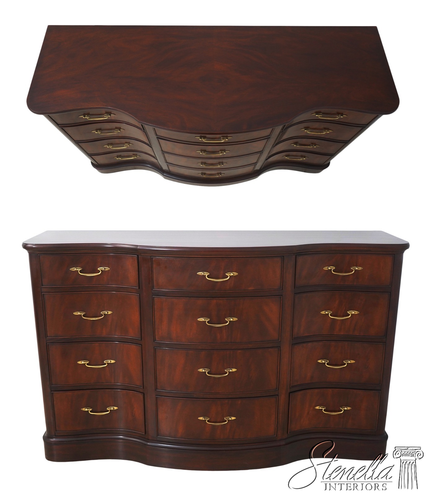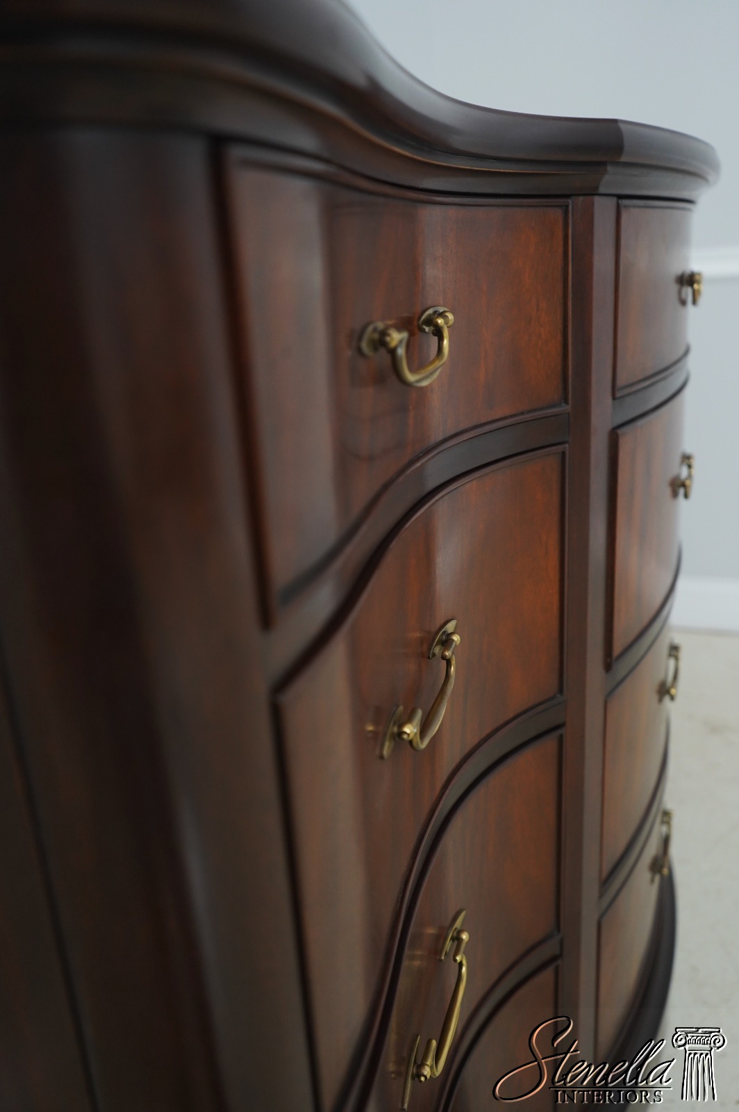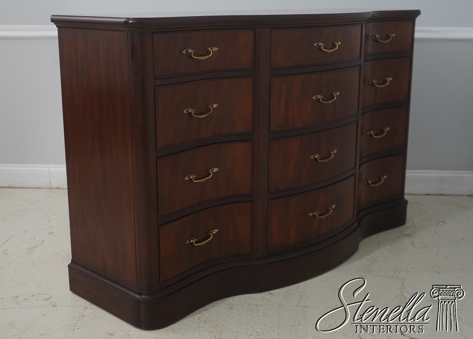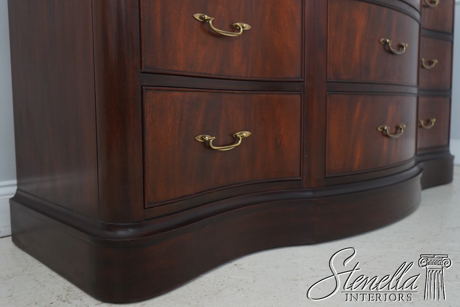 Details: Finish no.29 Mahogany Modern Design High Quality Construction Nice Figural Mahogany Large Impressive Dresser See Other Offerings For Matching Bedroom Pieces Solid Brass Hardware Bow Front Felt Lined Drawer Extremely Heavy & Well Constructed Offered @ Fraction Original Retail Cost