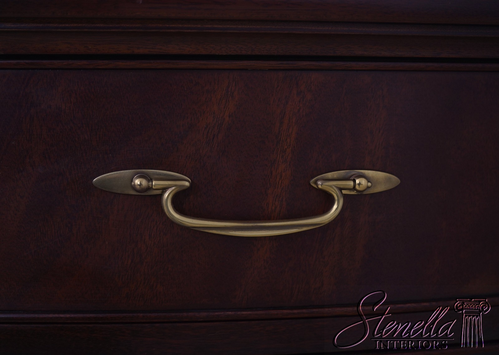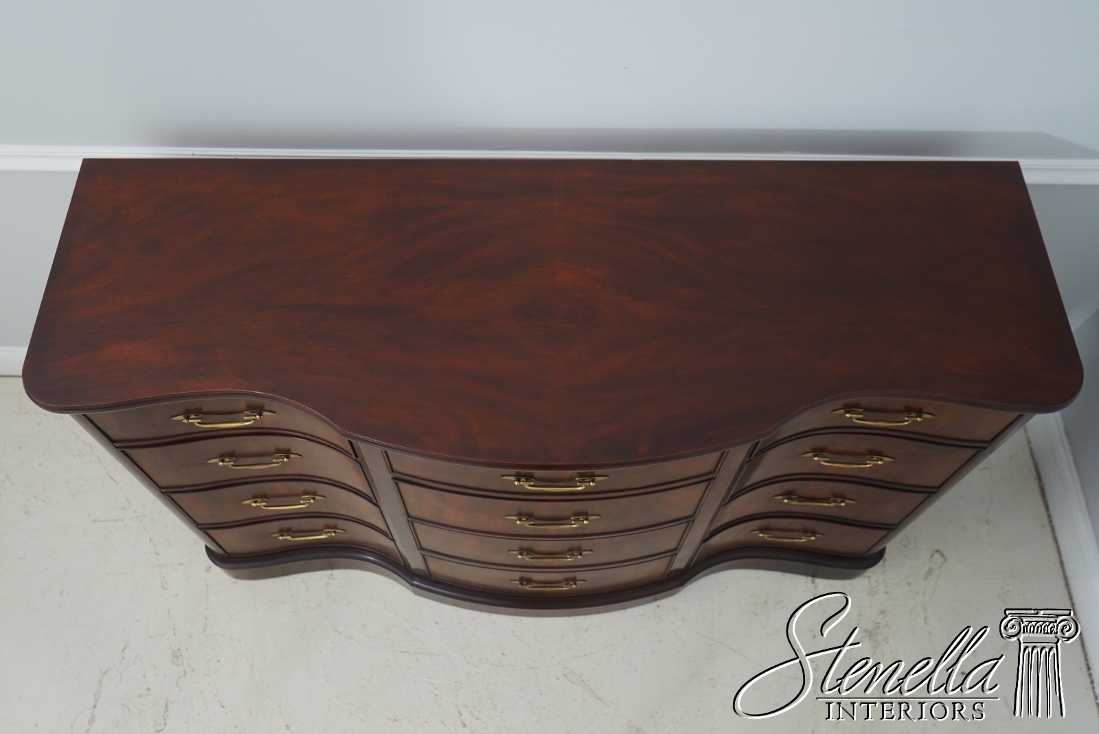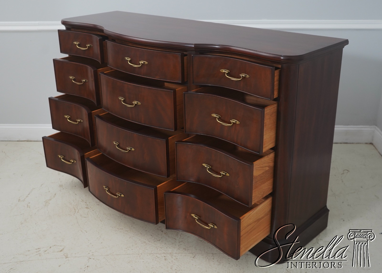 Details: Finish no.29 Mahogany Modern Design High Quality Construction Nice Figural Mahogany Large Impressive Dresser See Other Offerings For Matching Bedroom Pieces Solid Brass Hardware Bow Front Felt Lined Drawer Extremely Heavy & Well Constructed Offered @ Fraction Original Retail Cost