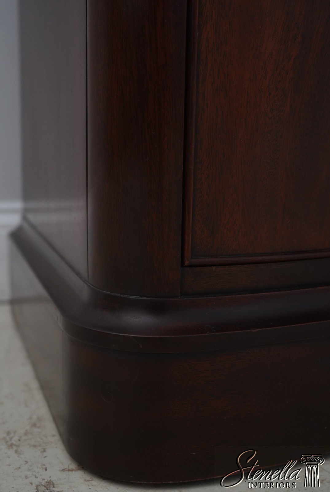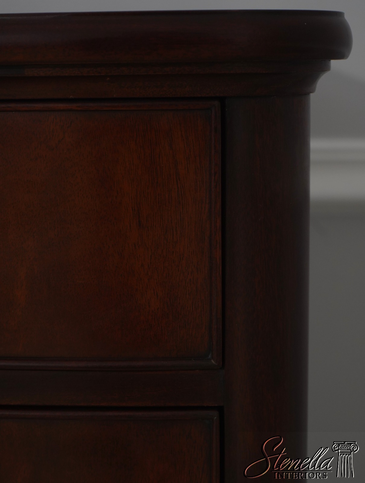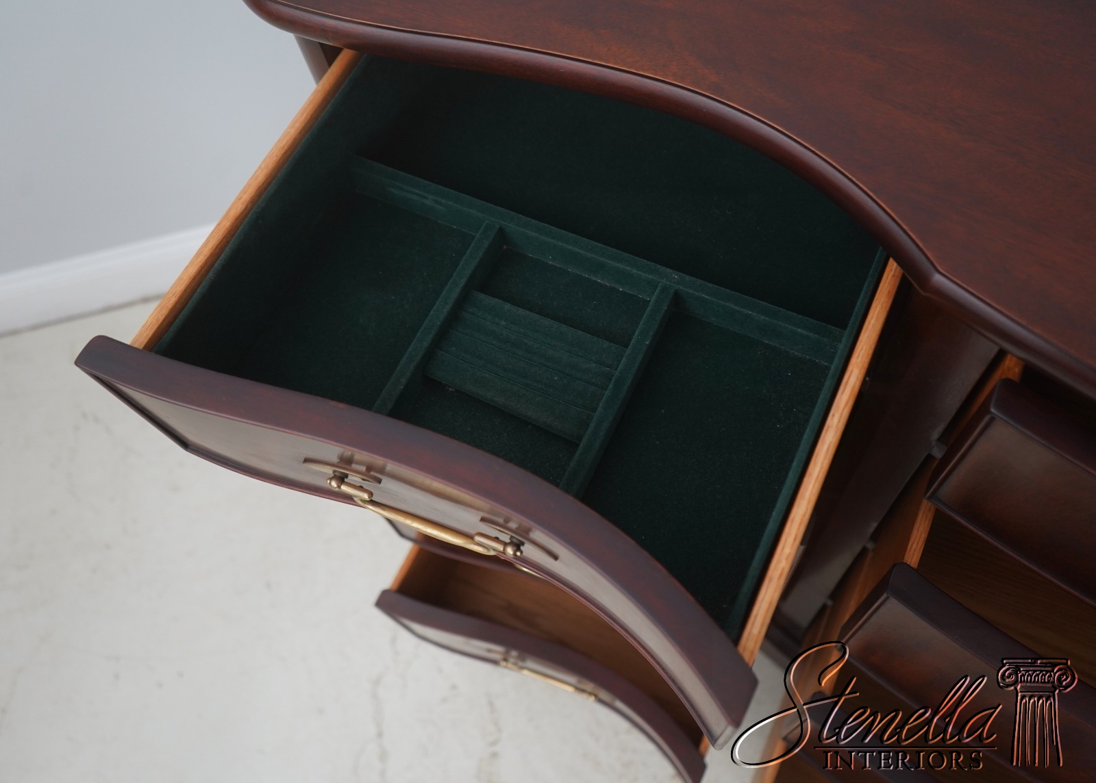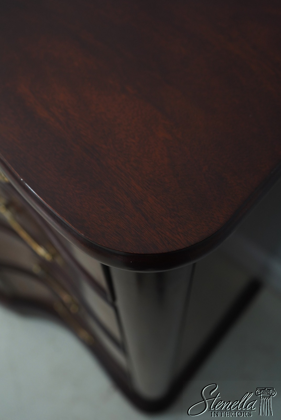 Details: Finish no.29 Mahogany Modern Design High Quality Construction Nice Figural Mahogany Large Impressive Dresser See Other Offerings For Matching Bedroom Pieces Solid Brass Hardware Bow Front Felt Lined Drawer Extremely Heavy & Well Constructed Offered @ Fraction Original Retail Cost