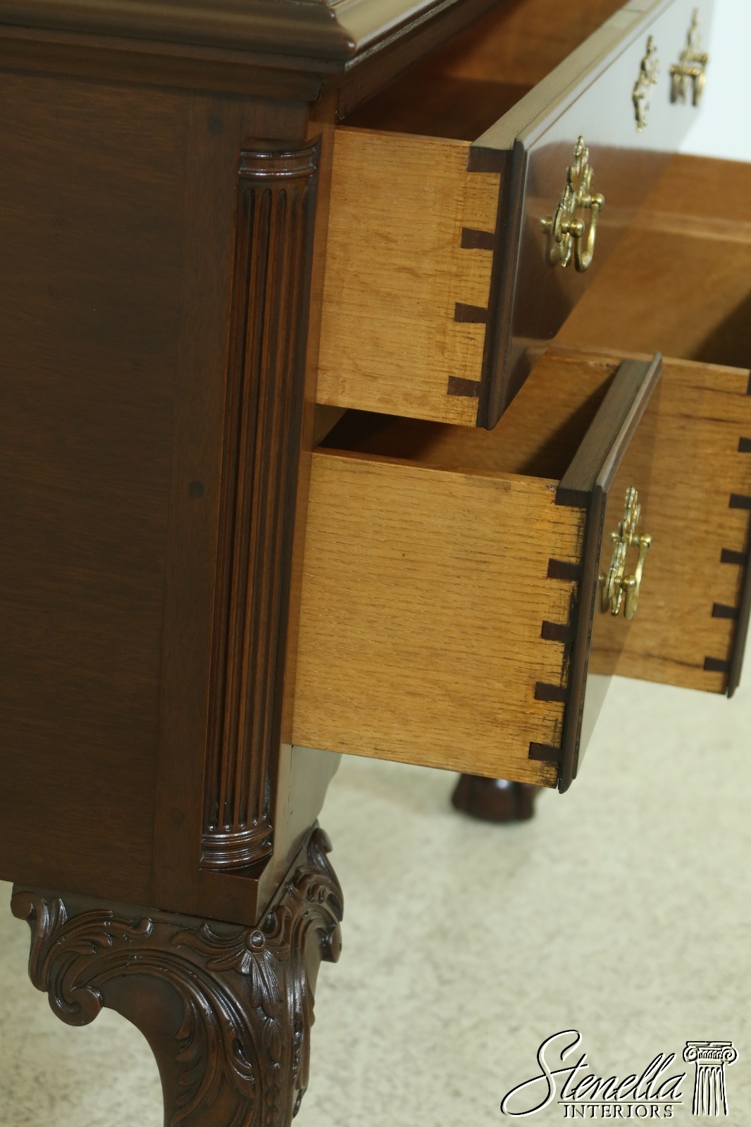 Chippendale style with fluted columns, carved cabriole legs with claw-and-ball feet. Adorned with acanthus leaf carvings. Brass hardware. One drawer over three drawers.