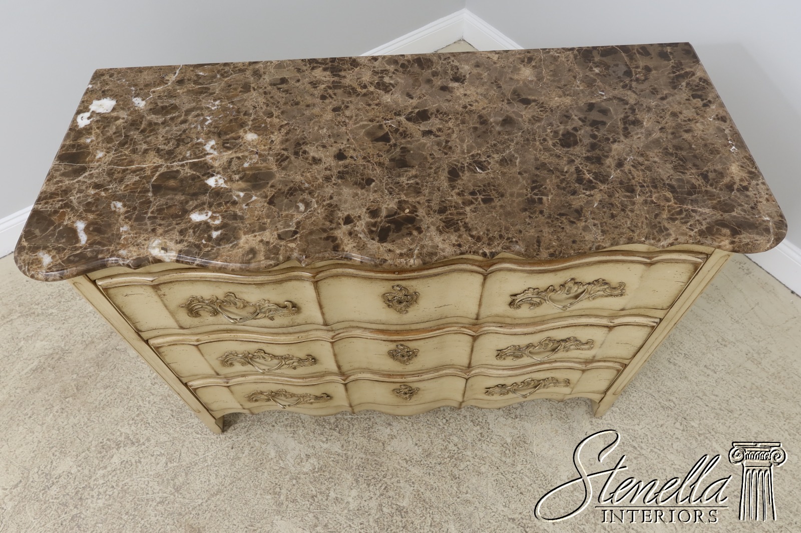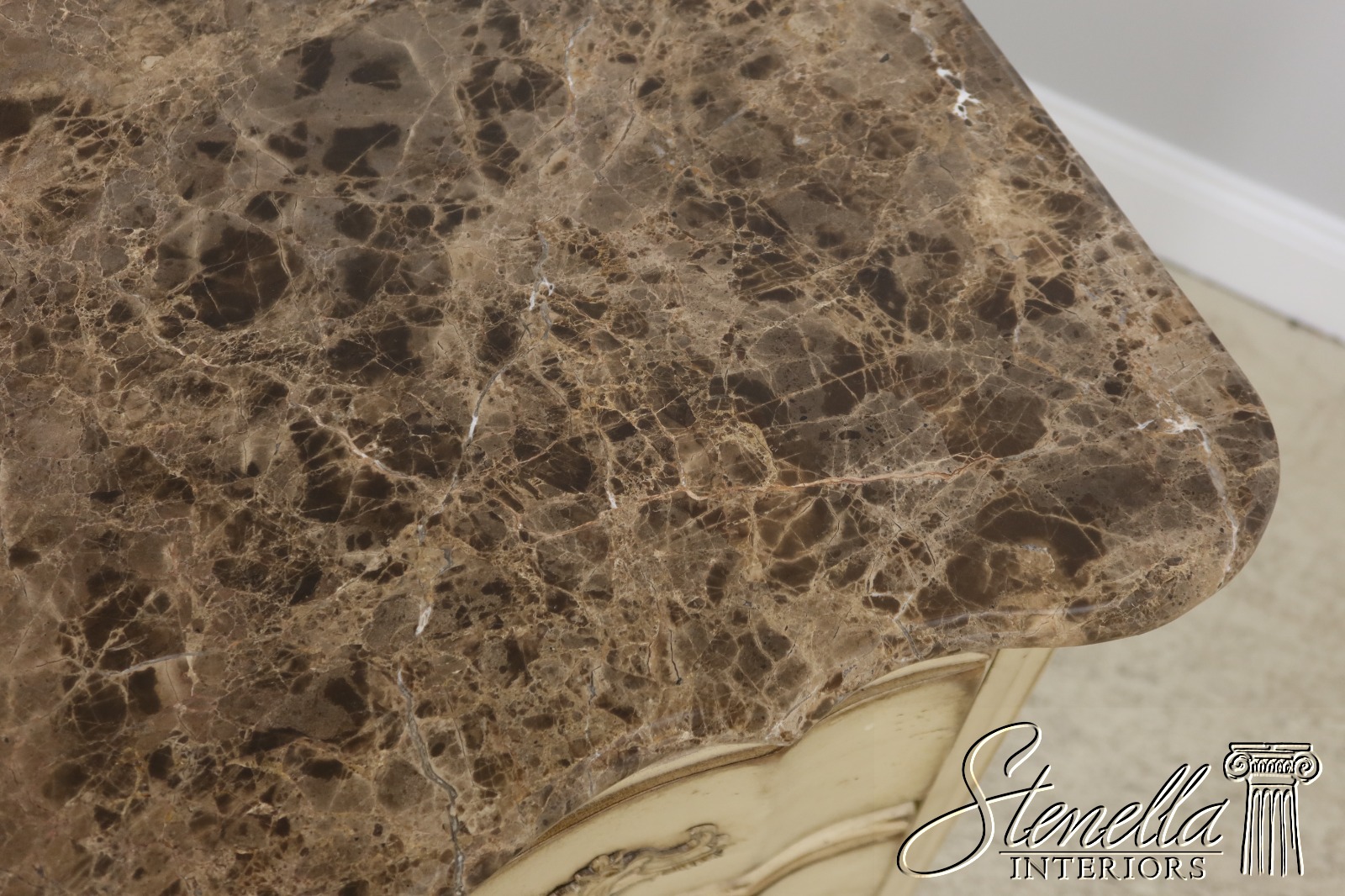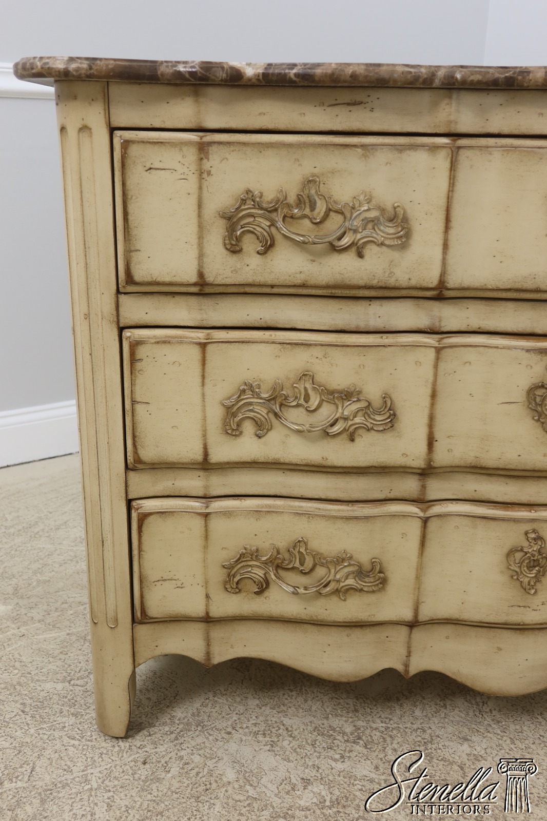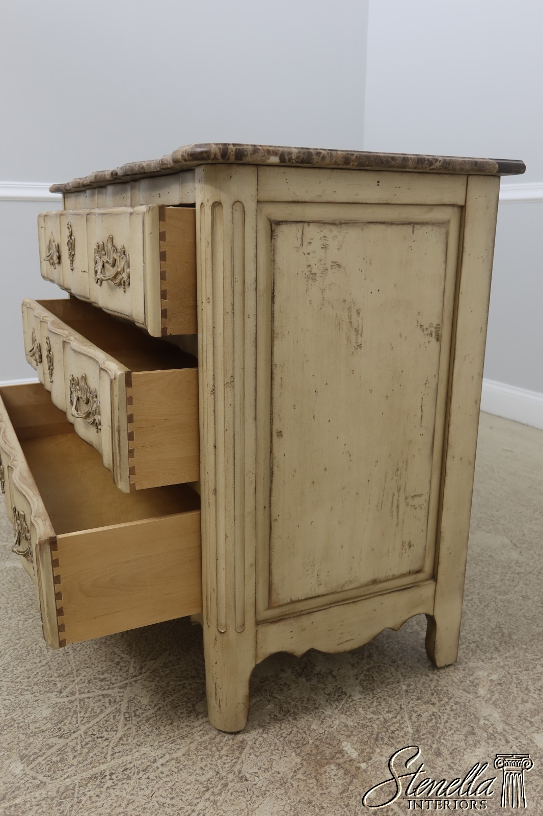 Details: Raised Panel Sides Dovetailed Drawer Construction High Quality Construction Factory Distressed Painted Finish Beveled Edge Marble Top Only Used For Display In Spare Bedroom See Other Offerings For Matching Bedroom Pieces & Matching Chest Offered @ Fraction Original Retail Cost
