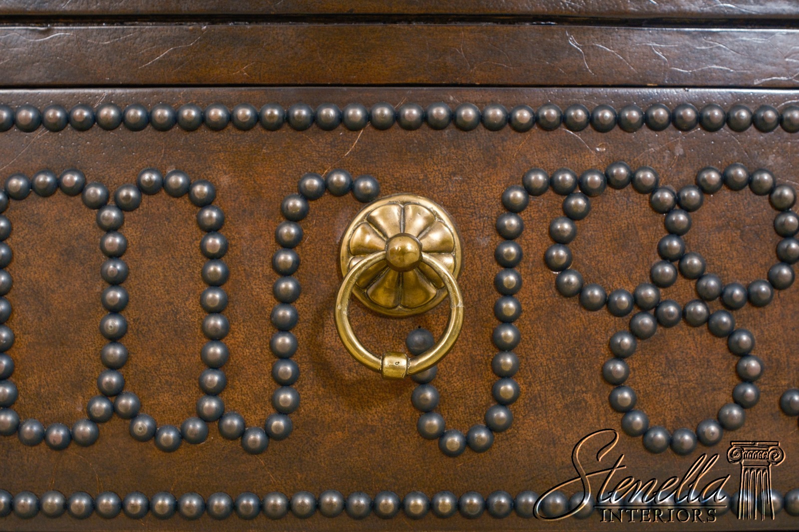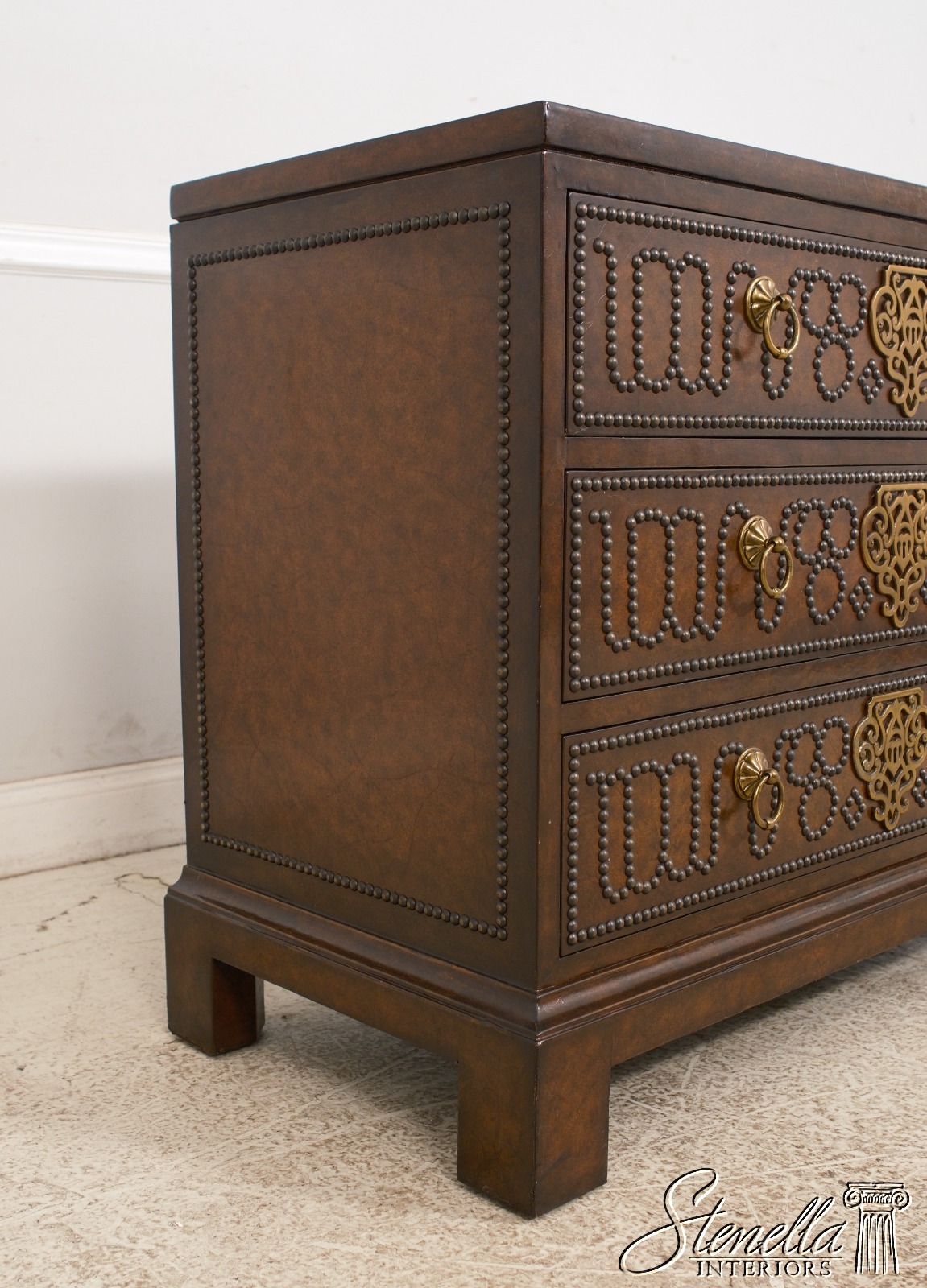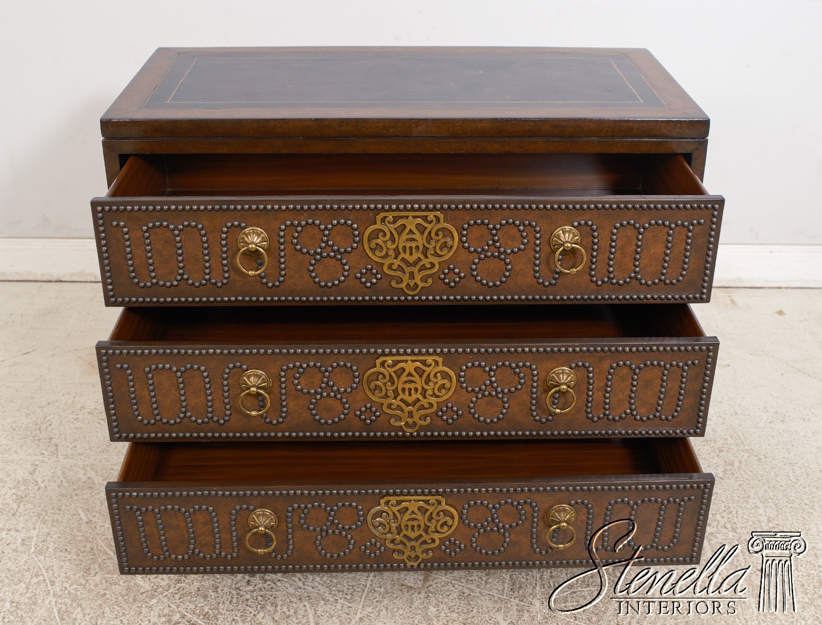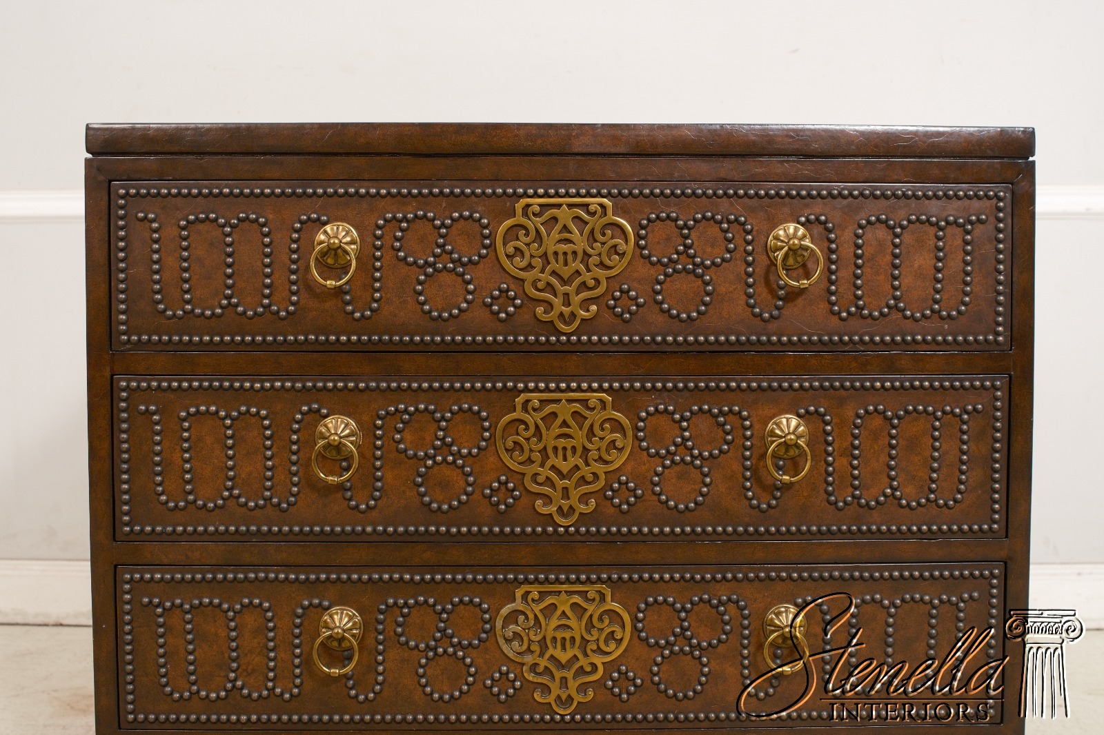 Details: Brass Studded Trim Quality Construction Leather Drawer Fronts & Sides Leather Wrapped Banded Top Top Center Is Tortoise Marble Overlay w. Brass Trim Stunning Decorator Chest Offered @ Fraction Original Retail Cost