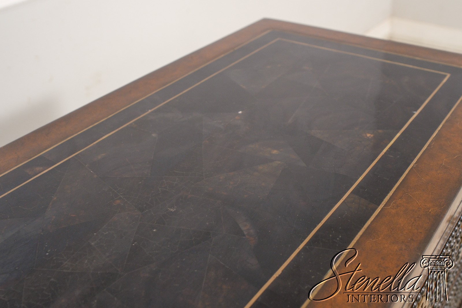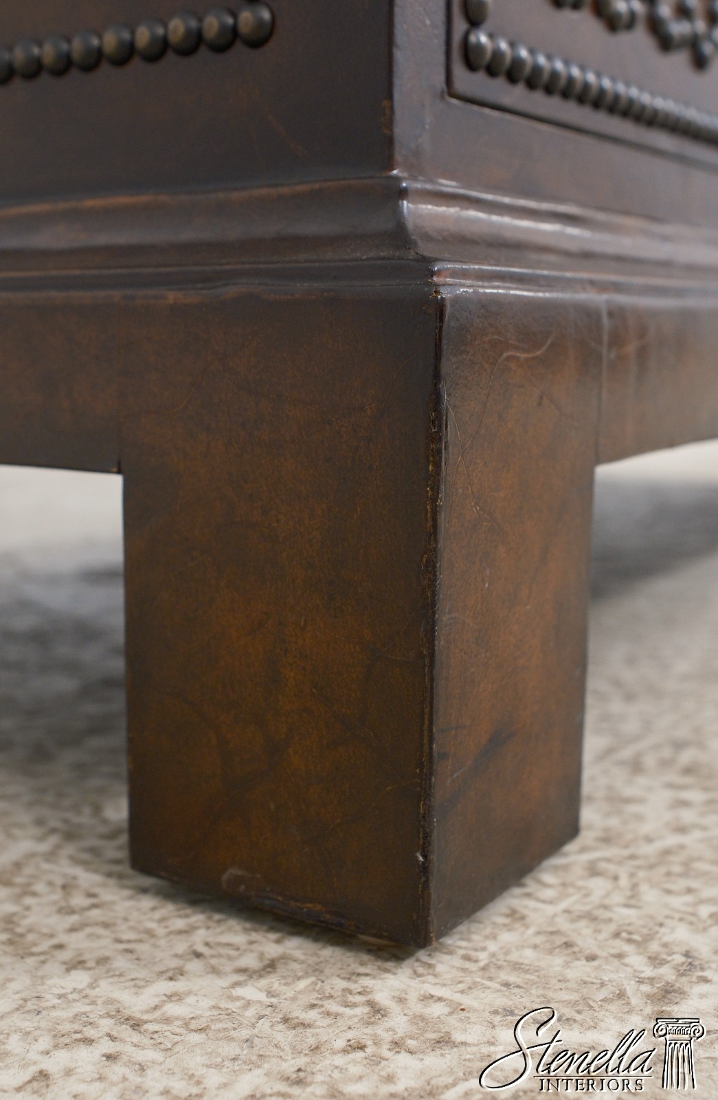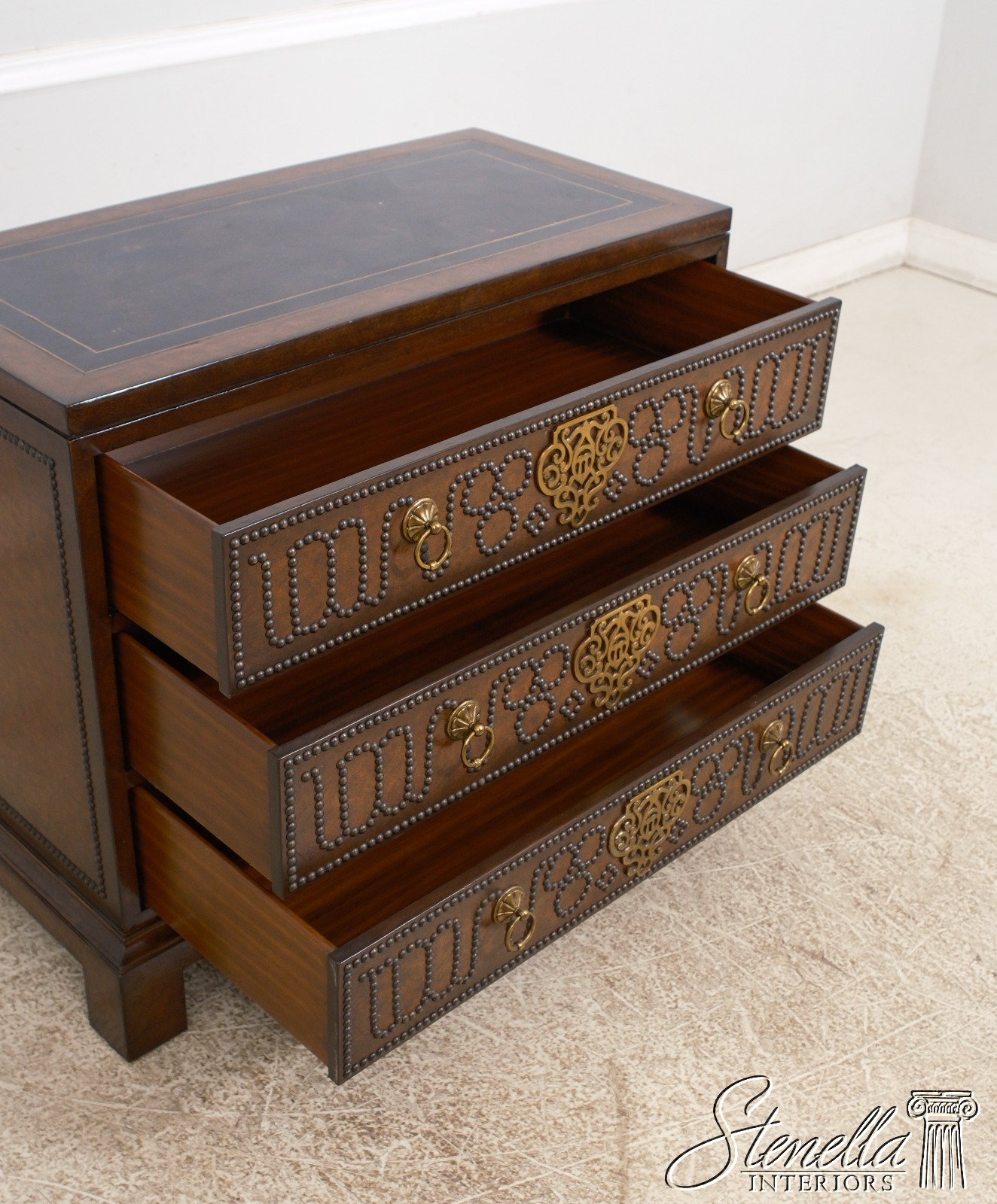 Details: Brass Studded Trim Quality Construction Leather Drawer Fronts & Sides Leather Wrapped Banded Top Top Center Is Tortoise Marble Overlay w. Brass Trim Stunning Decorator Chest Offered @ Fraction Original Retail Cost