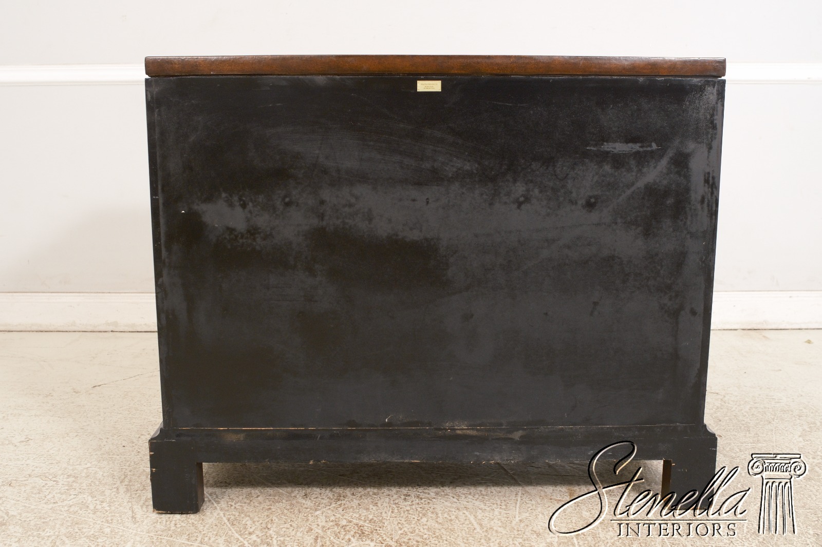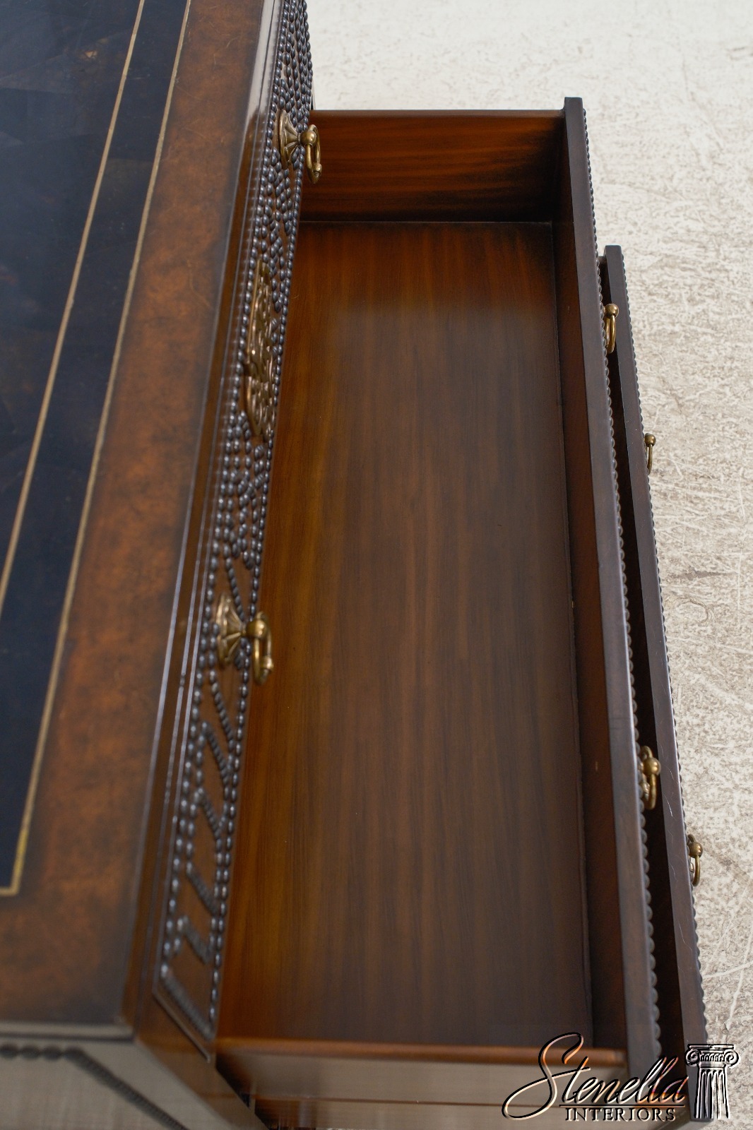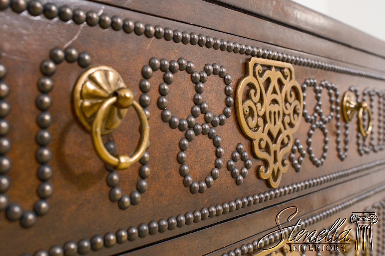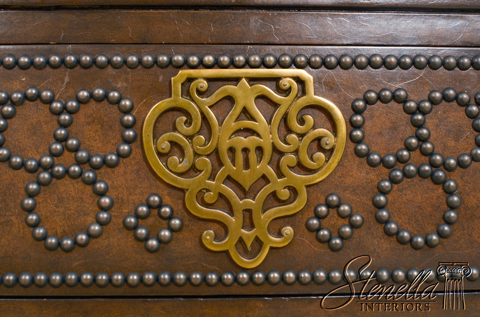 Details: Brass Studded Trim Quality Construction Leather Drawer Fronts & Sides Leather Wrapped Banded Top Top Center Is Tortoise Marble Overlay w. Brass Trim Stunning Decorator Chest Offered @ Fraction Original Retail Cost