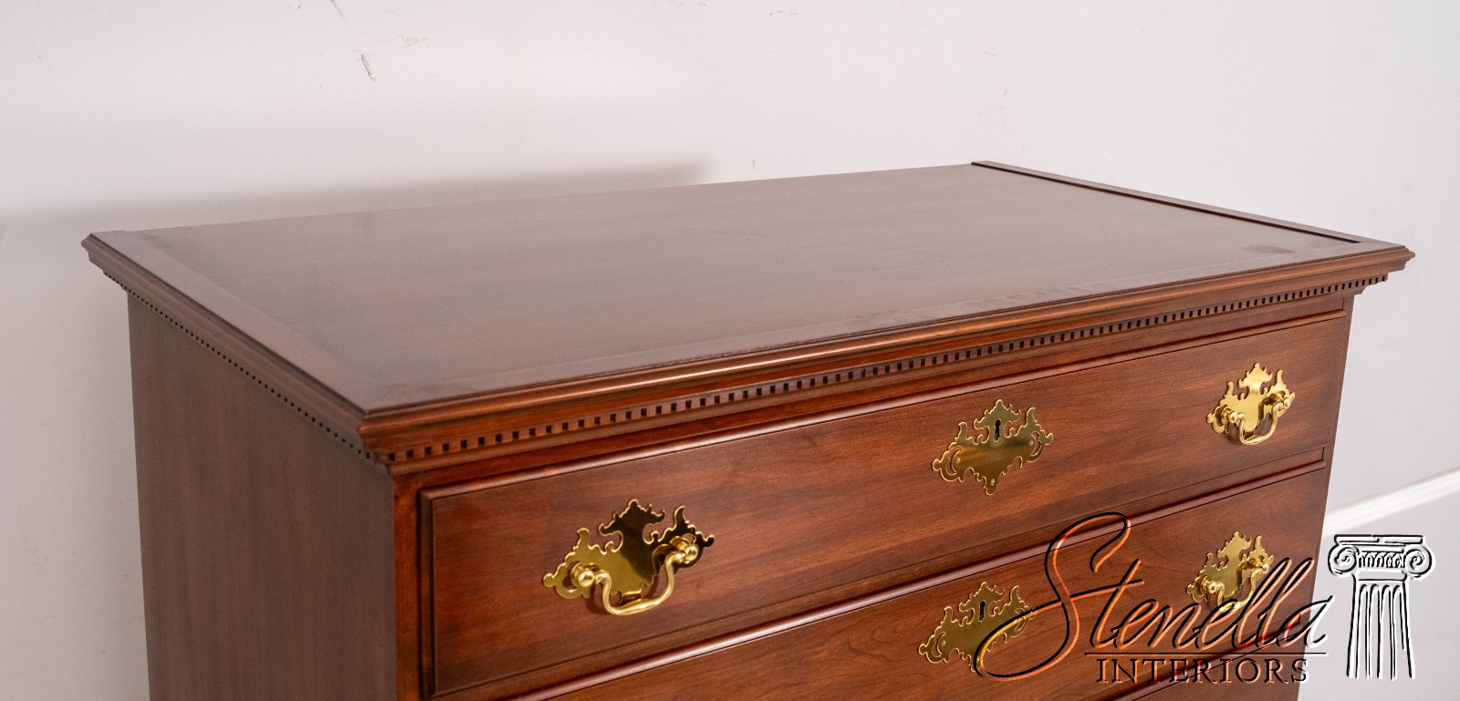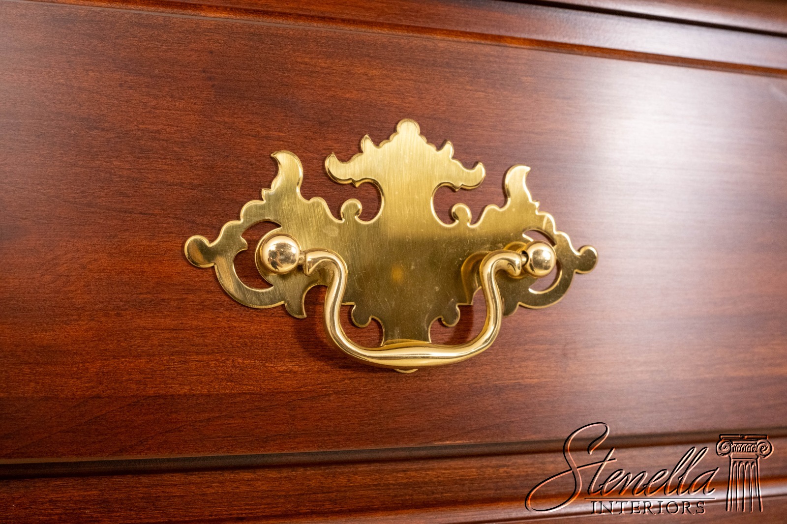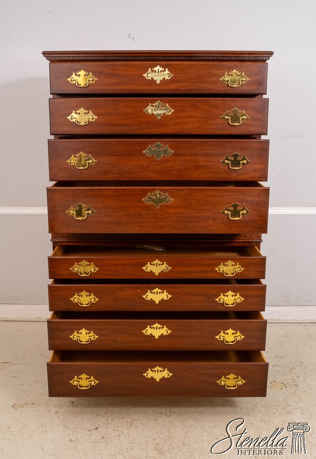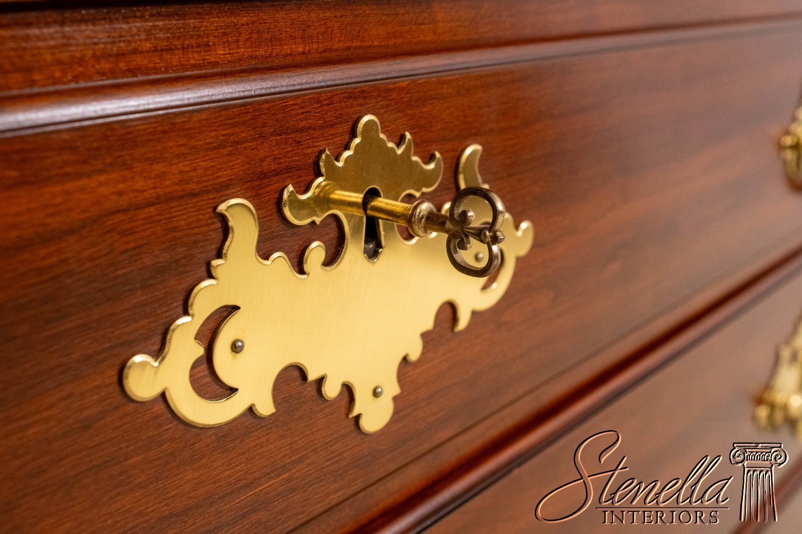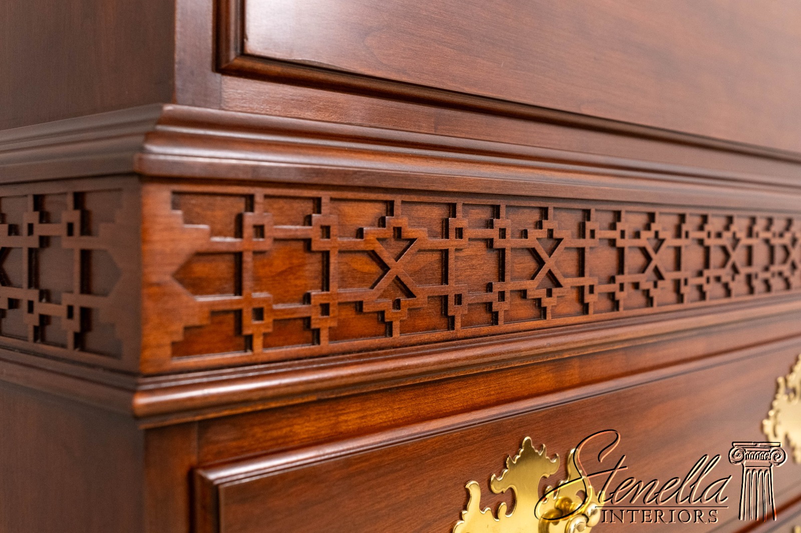 Details: Finish no.24 Model 177 Cherry Bracket Feet Dovetailed Drawer Construction 2 Piece Construction High Quality Construction Fine Carved Details Large Impressive Chest Nice Inlay Work Throughout Rich High Sheen Finish Key Locking w. Key 18 C. Design Chippendale Style Perkins Chest Traditional Style Solid Brass Hardware Offered @ Fraction Original Retail Cost