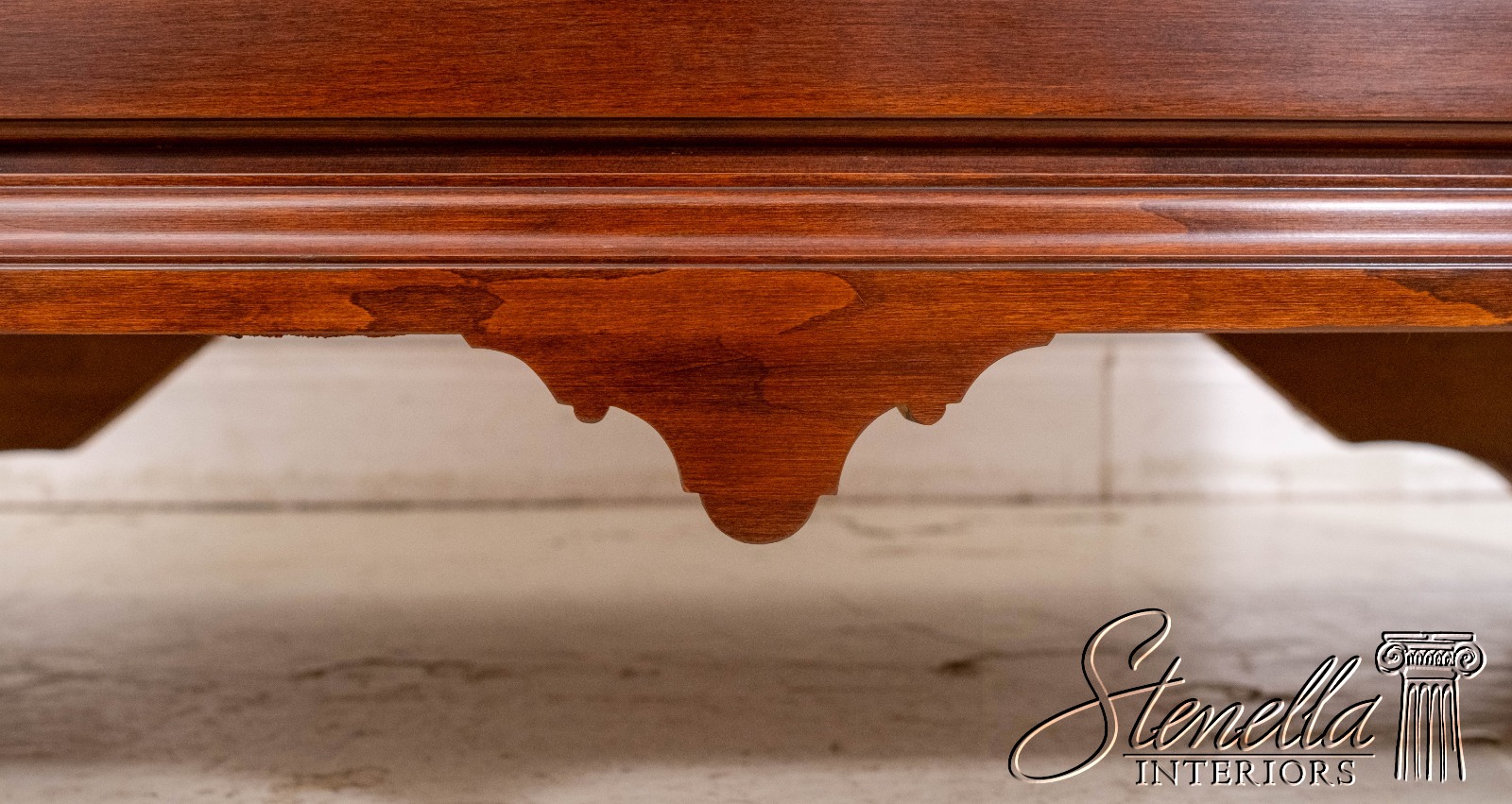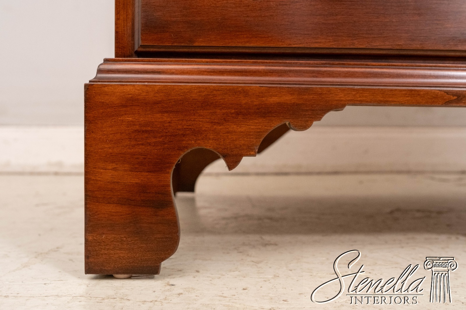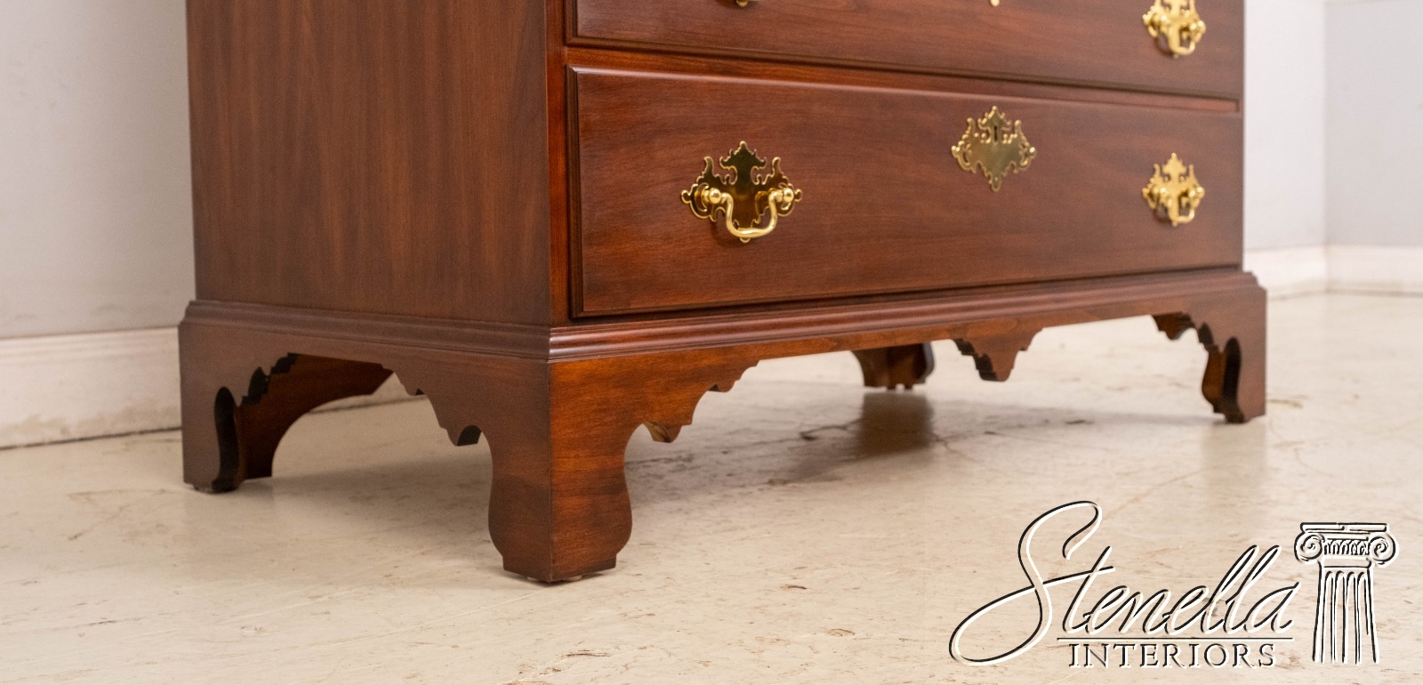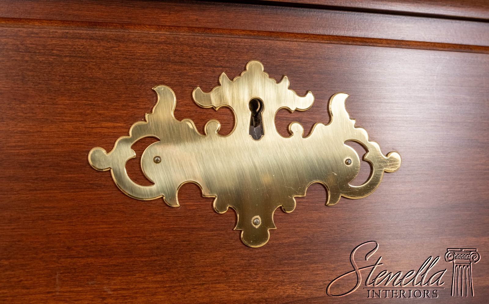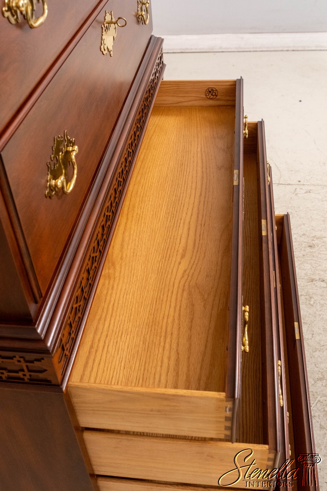 Details: Finish no.24 Model 177 Cherry Bracket Feet Dovetailed Drawer Construction 2 Piece Construction High Quality Construction Fine Carved Details Large Impressive Chest Nice Inlay Work Throughout Rich High Sheen Finish Key Locking w. Key 18 C. Design Chippendale Style Perkins Chest Traditional Style Solid Brass Hardware Offered @ Fraction Original Retail Cost