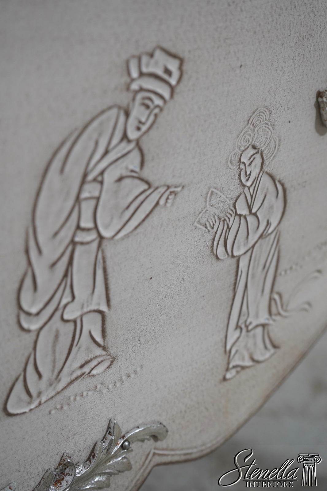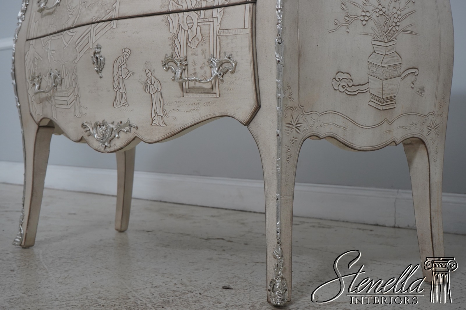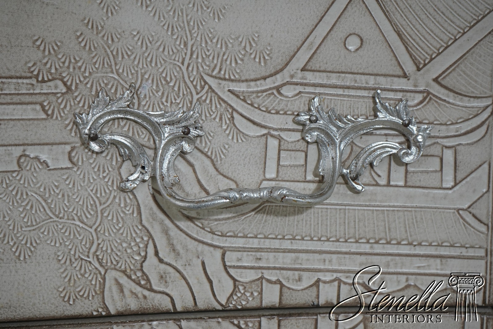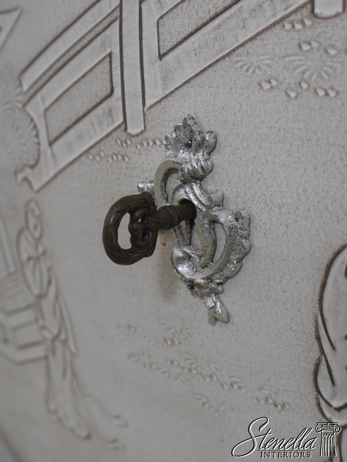 Details: Gorgeous Decorator Chest Nice Carved Details Quality Construction French Style Silver Finish Ormolu Mounts Stunning Chinoiserie Etched Carved Details Throughout Off White Painted Finish Un-Marked As To Manufacture