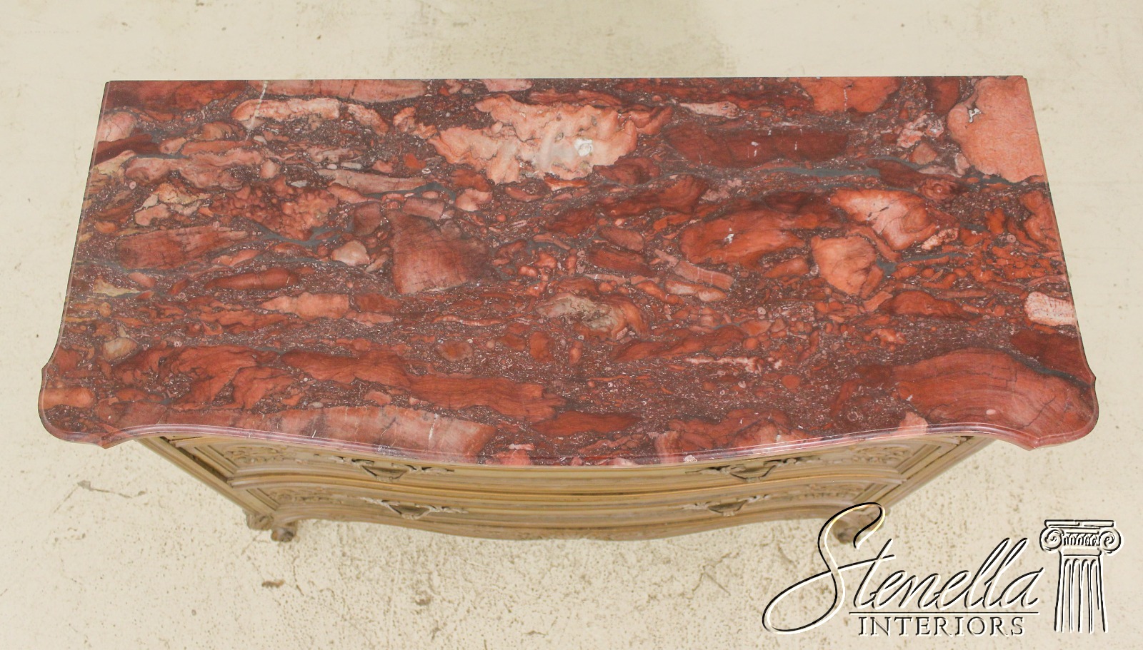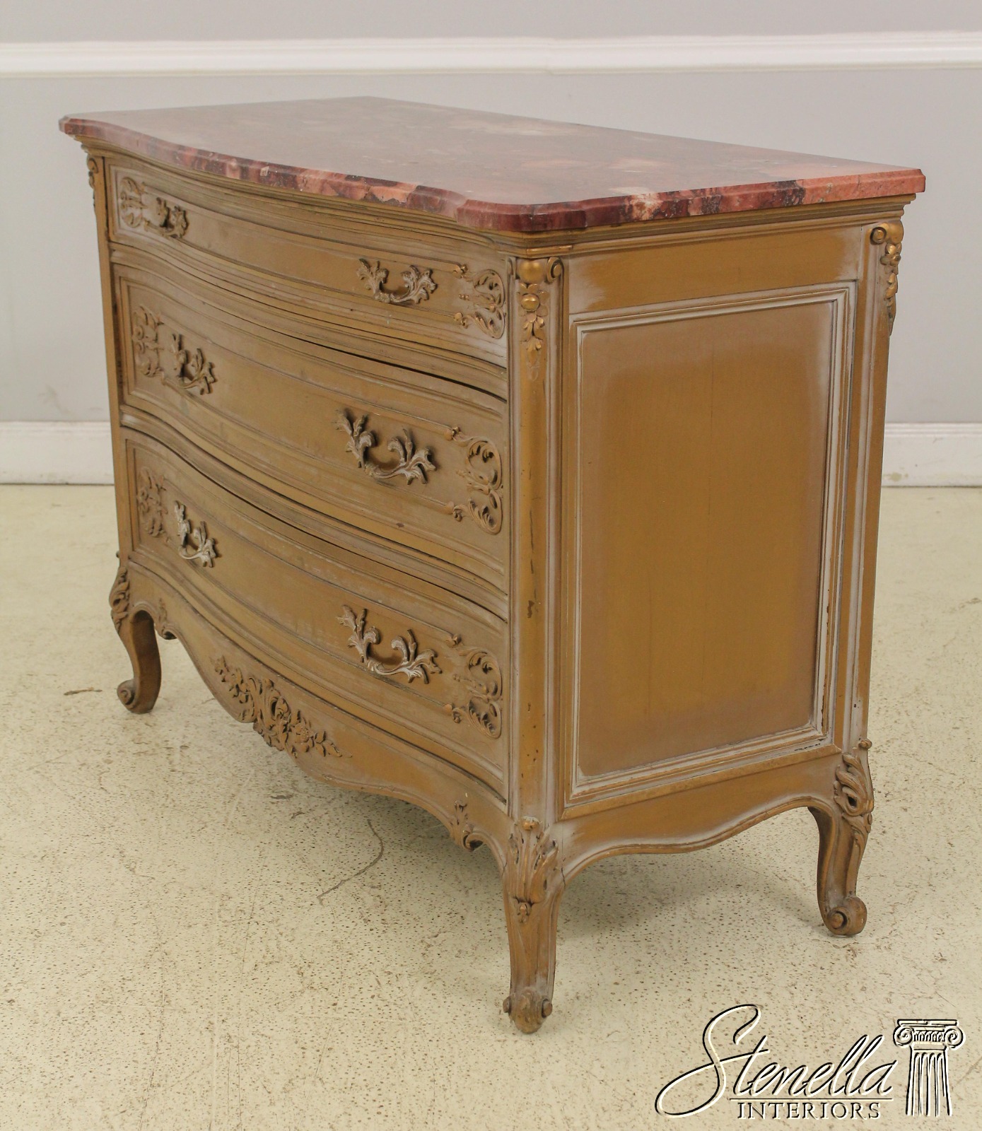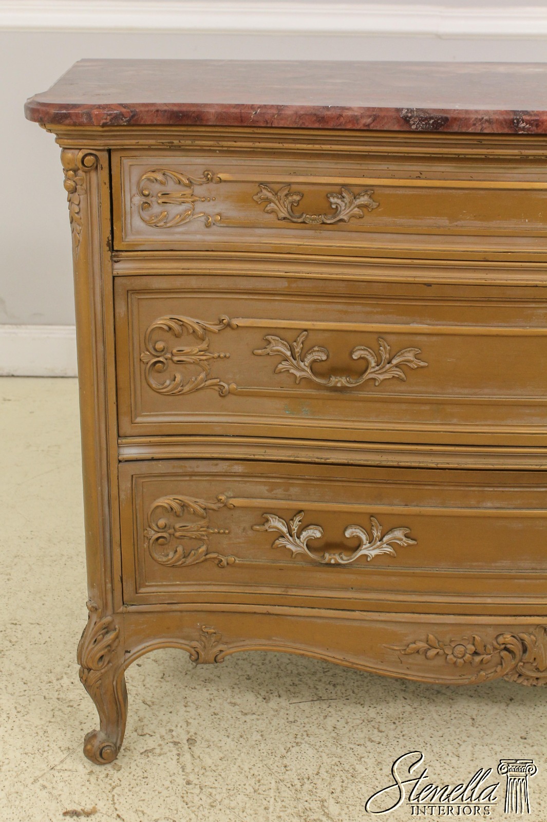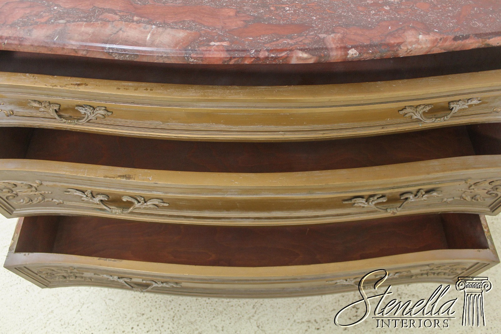 Details: Dovetailed Drawer Construction Fine Carved Details French Style Gorgeous Rose Color Marble Top w. Beveled Edge Gold Finish Antique Distressed Finish Nice Stylish Vintage Chest