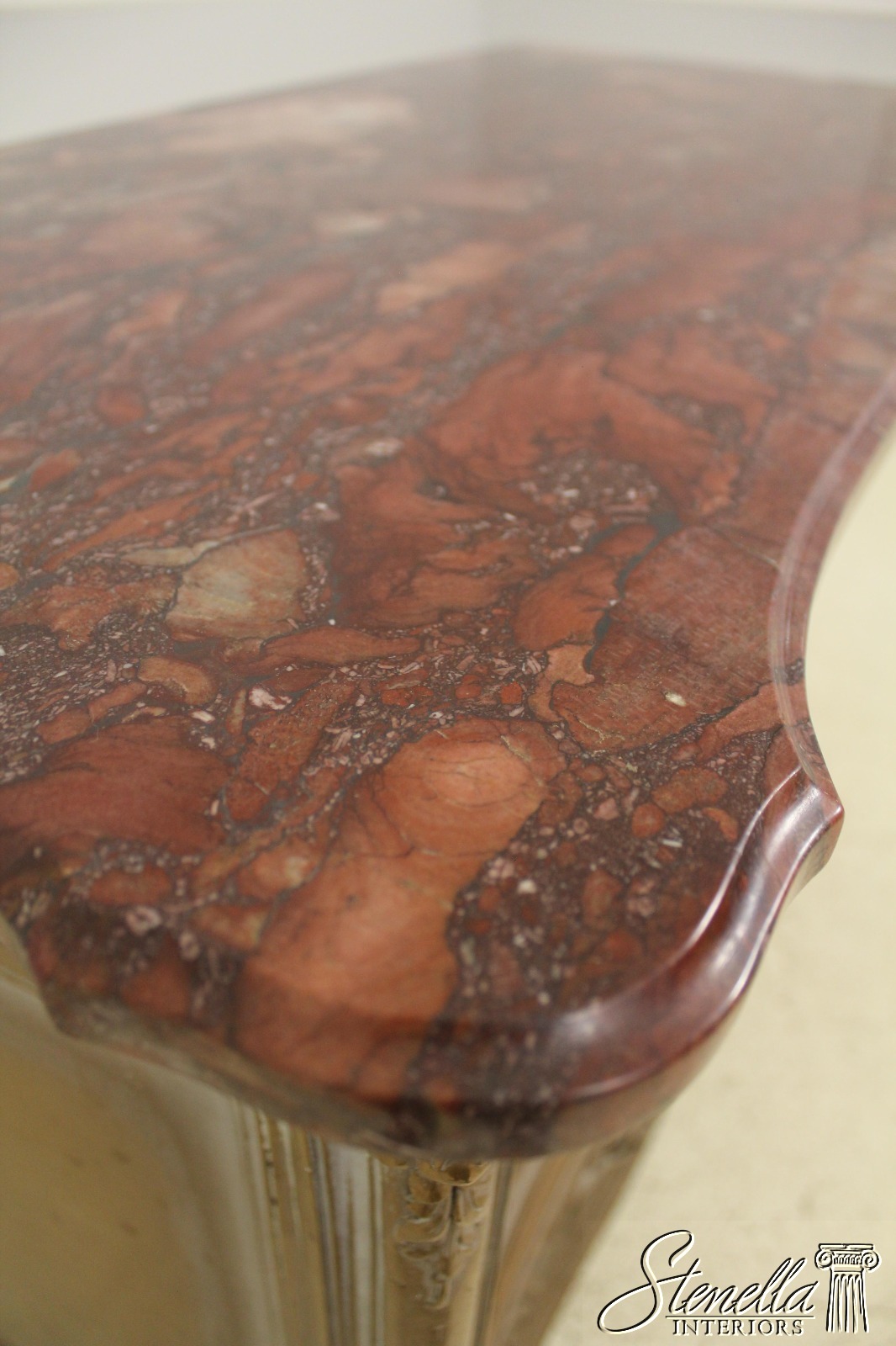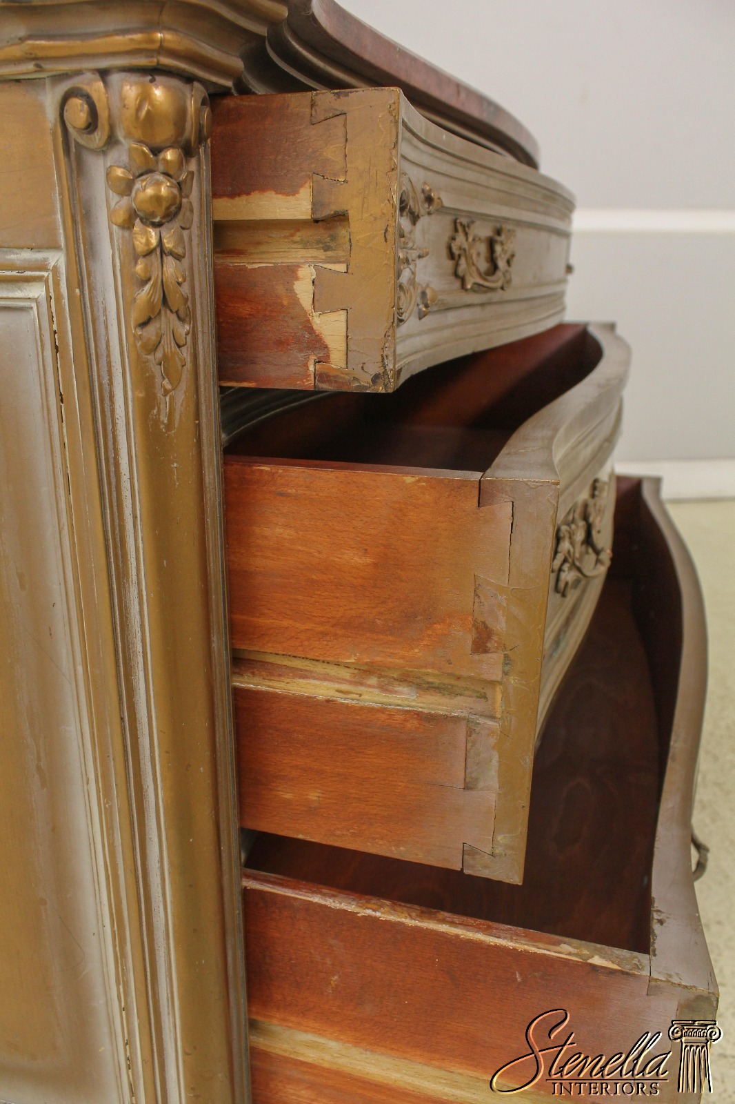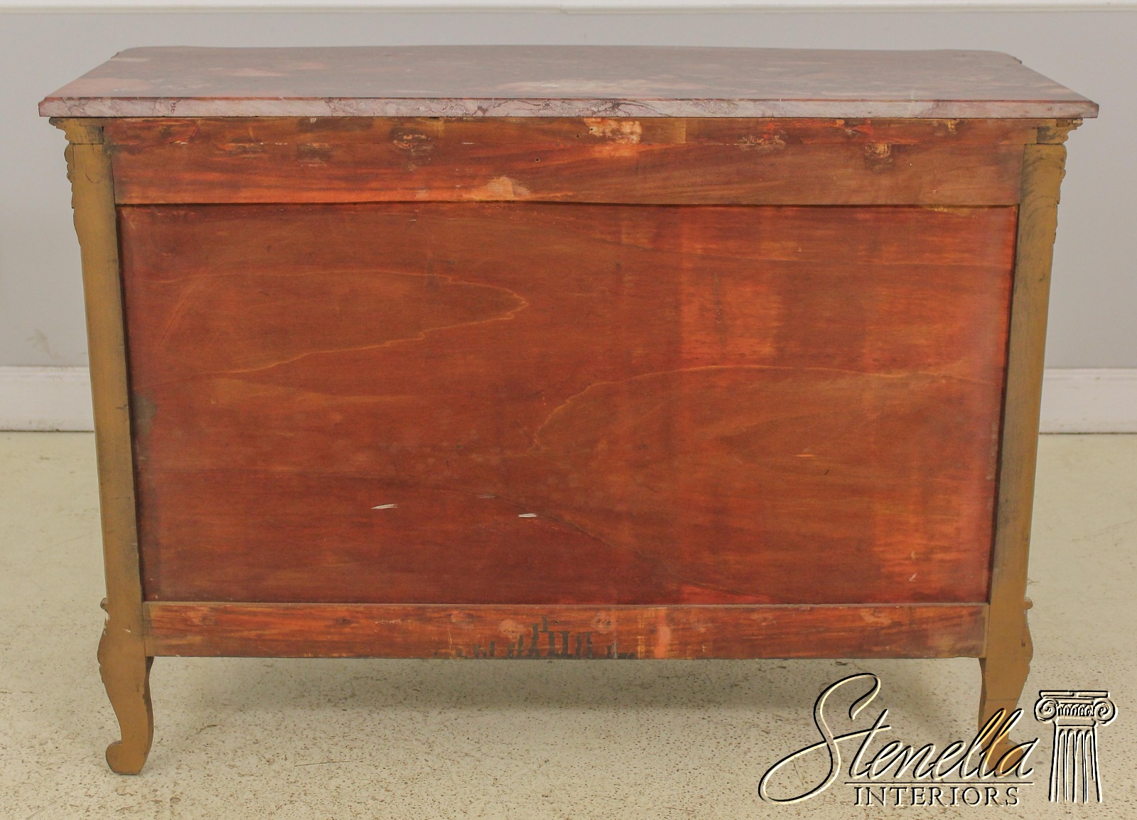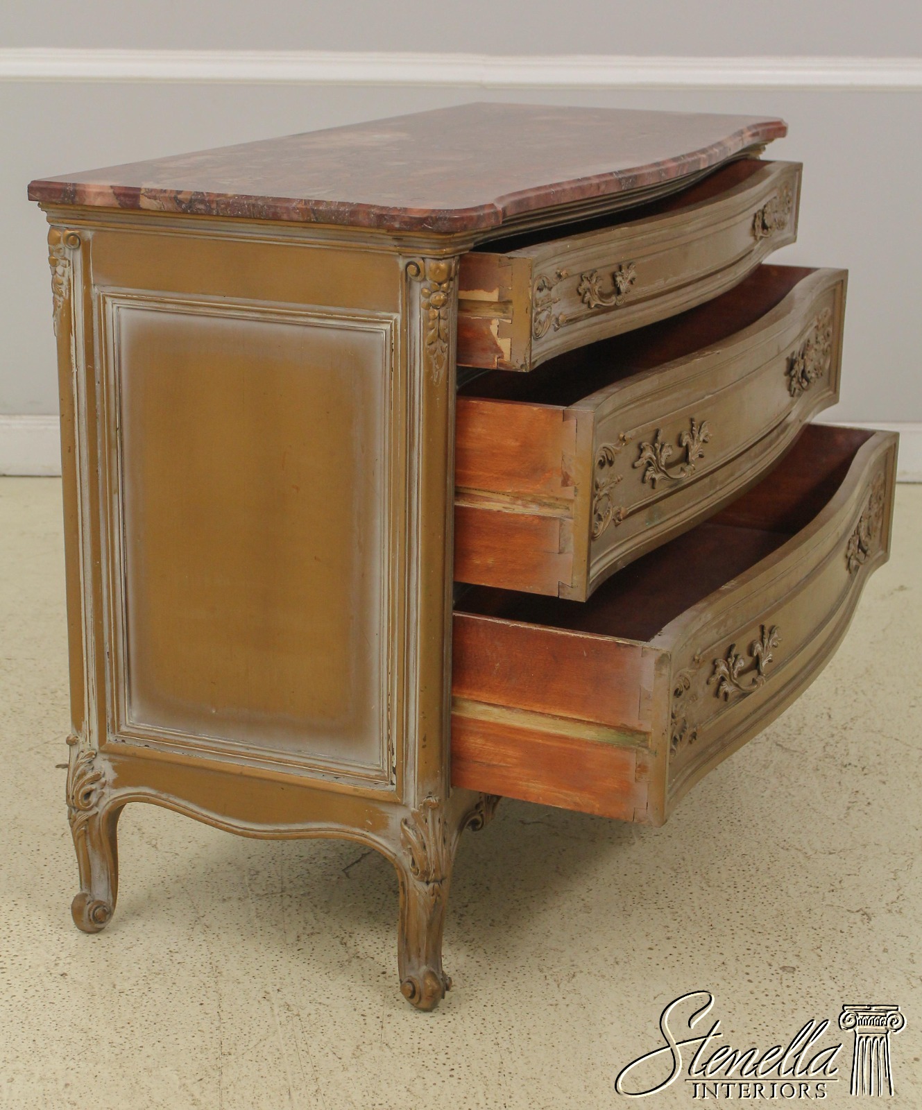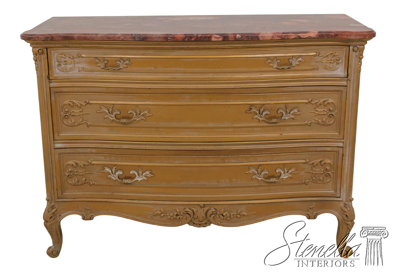 Details: Dovetailed Drawer Construction Fine Carved Details French Style Gorgeous Rose Color Marble Top w. Beveled Edge Gold Finish Antique Distressed Finish Nice Stylish Vintage Chest