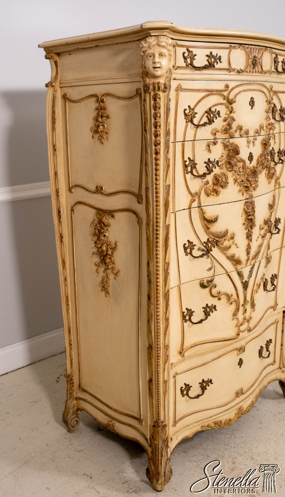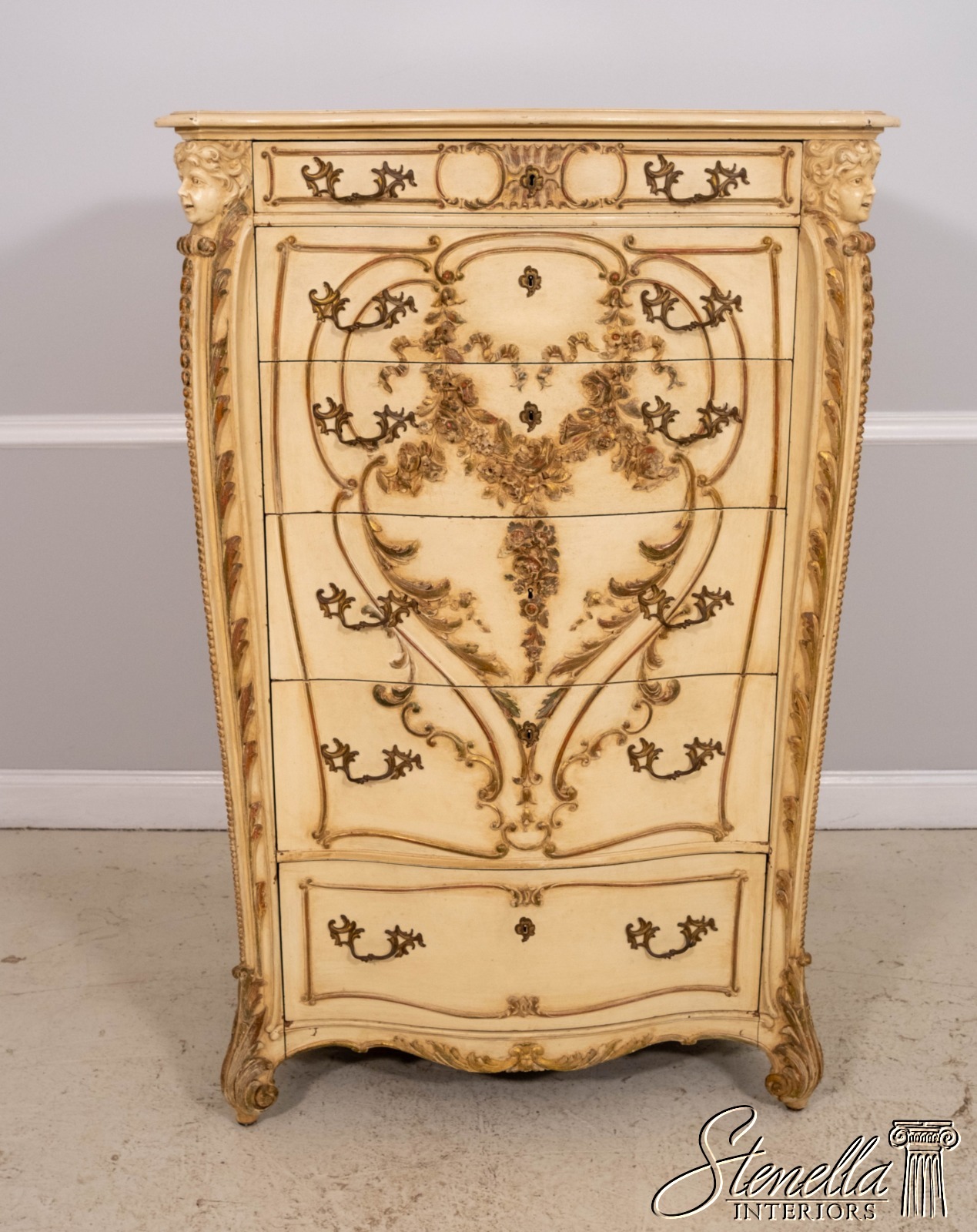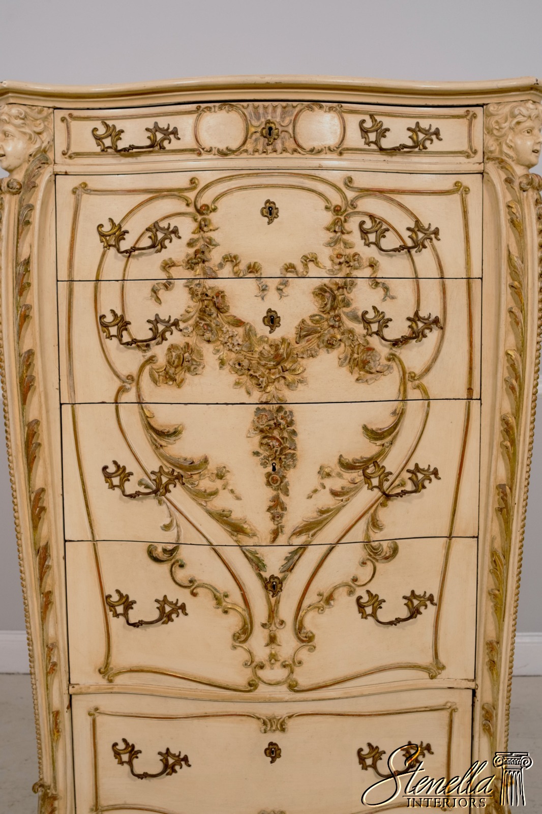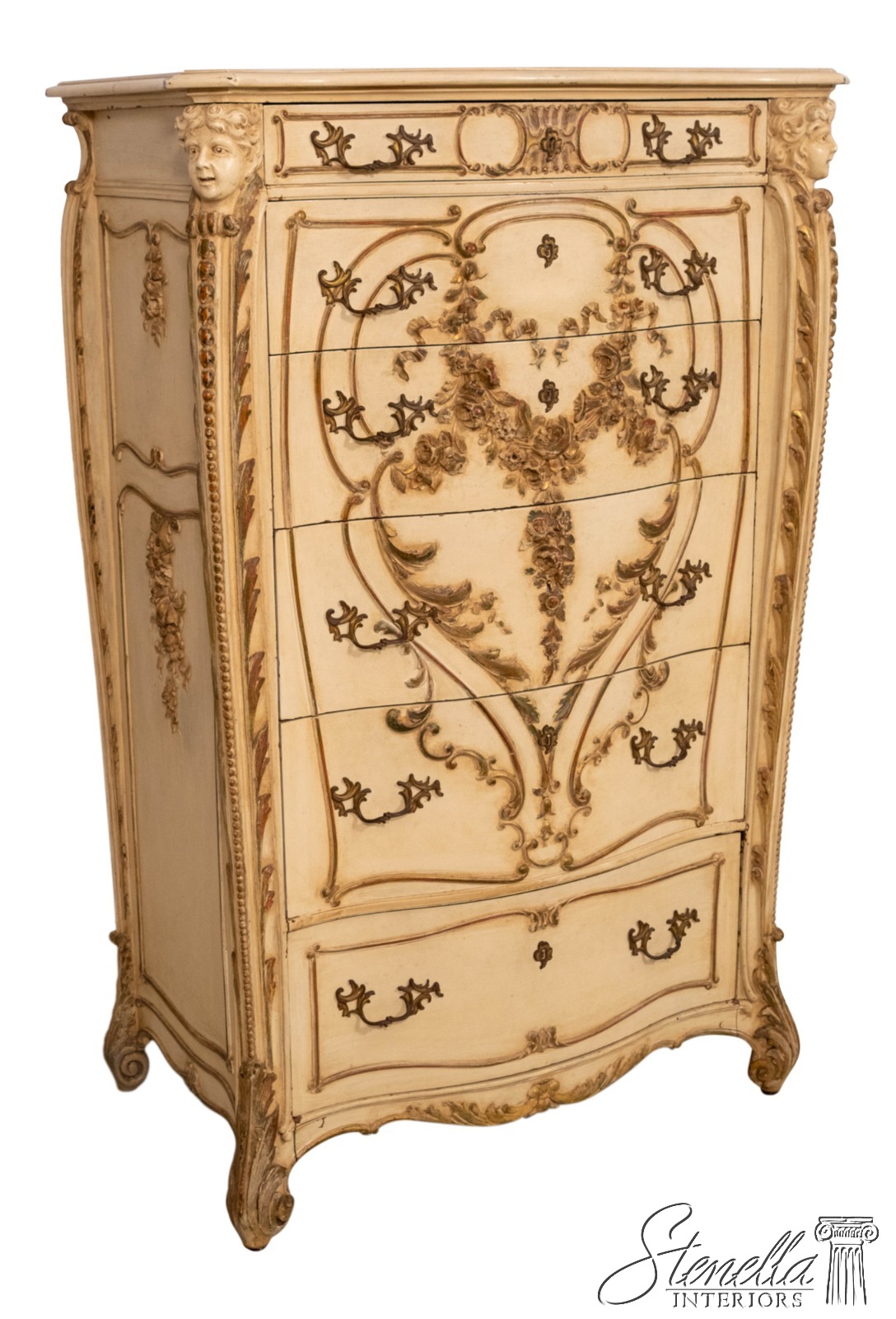 LF71213: Antique 19th Century Cherub Carved Painted High Chest Of Drawers