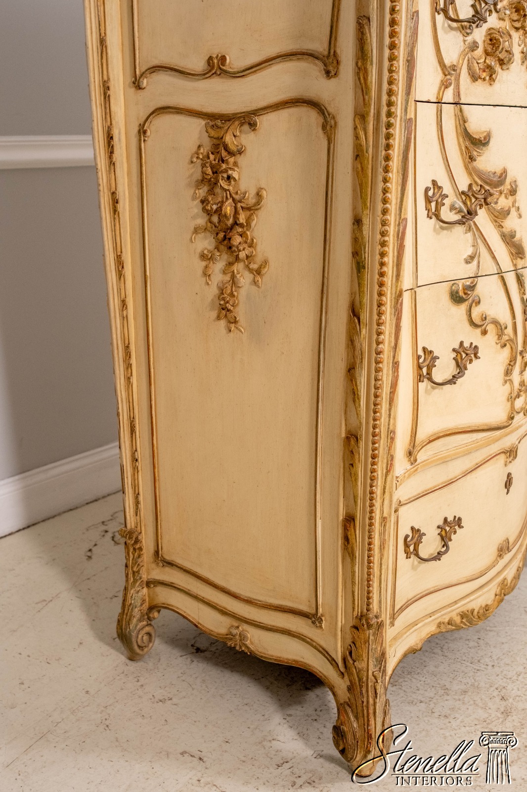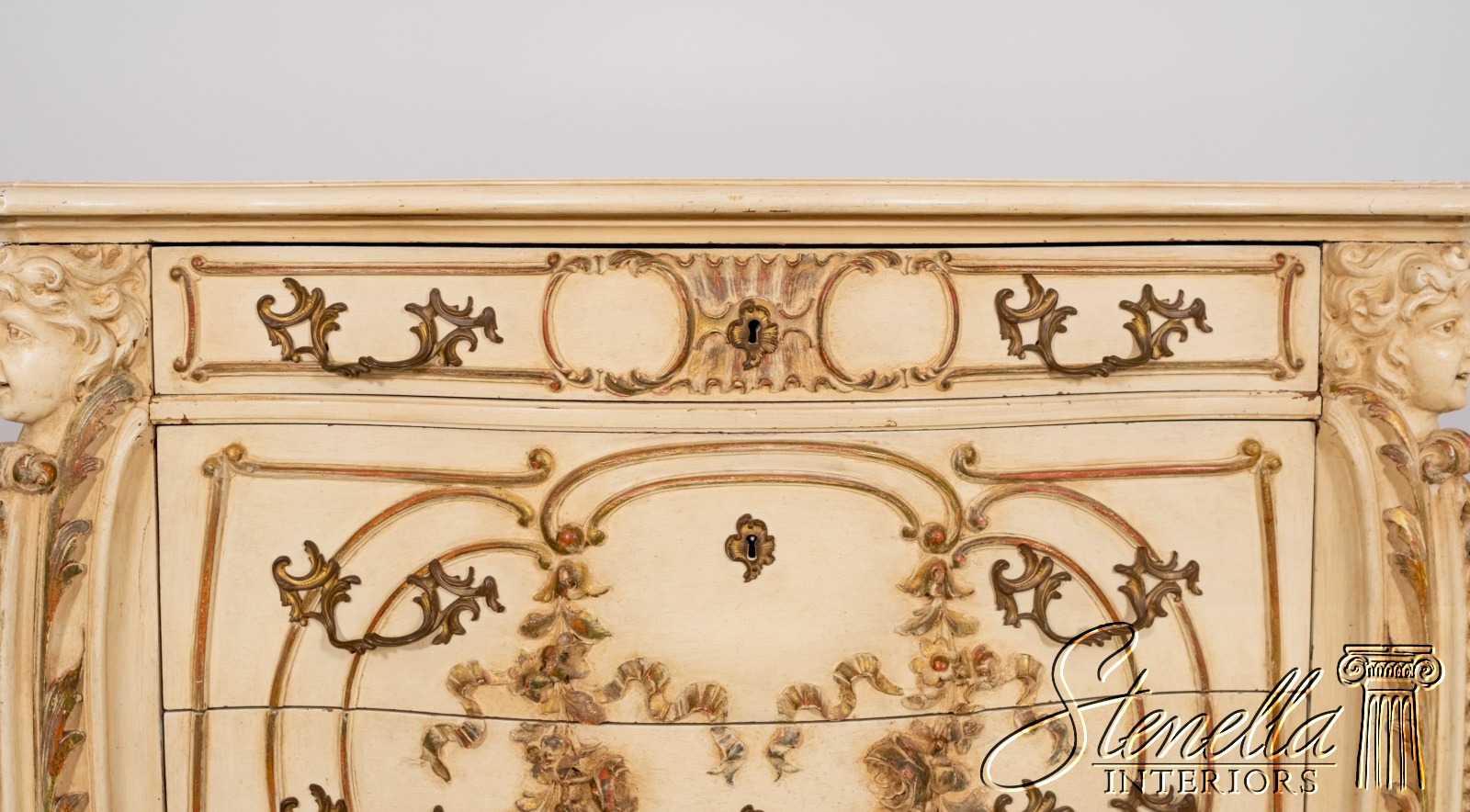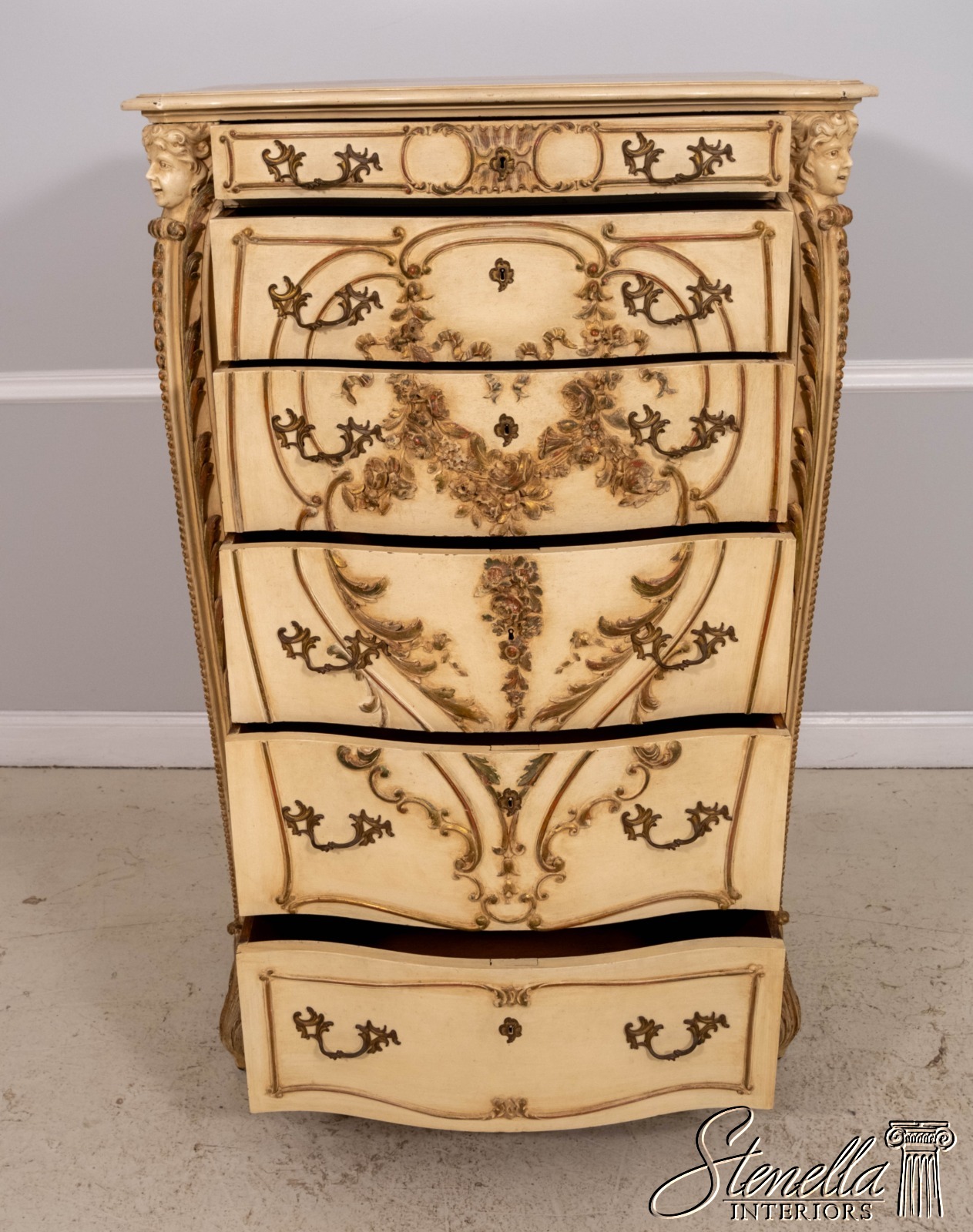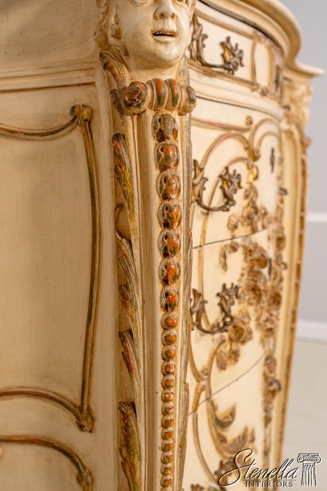 LF71213: Antique 19th Century Cherub Carved Painted High Chest Of Drawers