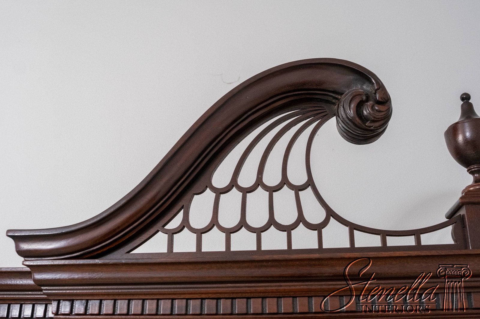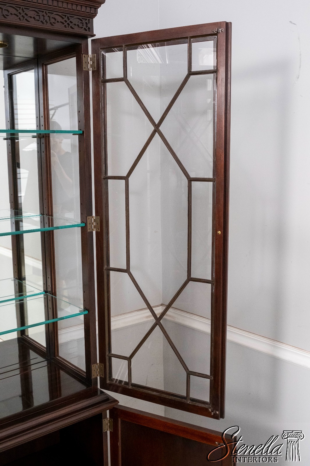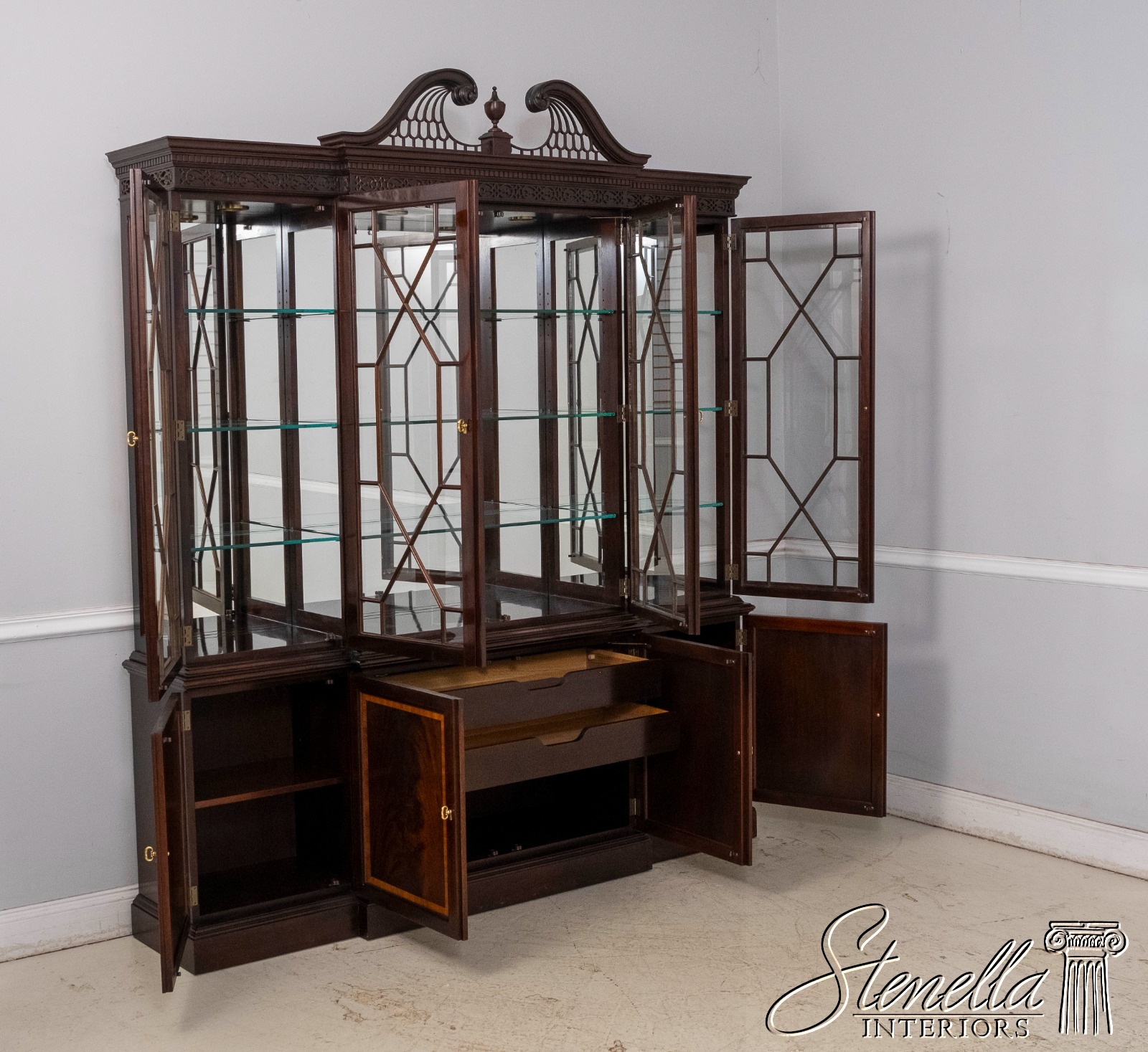 Details: Model 4799 Finish no.1 Mahogany Fine Carved Details High Quality Construction Large Impressive Cabinet Lighted Interior Mirrored Back Nice Inlay Work Throughout Pediment Top w. Finial Individual Pane Glass Door 18 C. Design Chippendale Style Gorgeous Figural Mahogany Front Dentil Crown Molding Solid Brass Hardware Felt Lined Top Drawer Pierced Broken Arch Pediment Offered @ Fraction Original Retail Cost