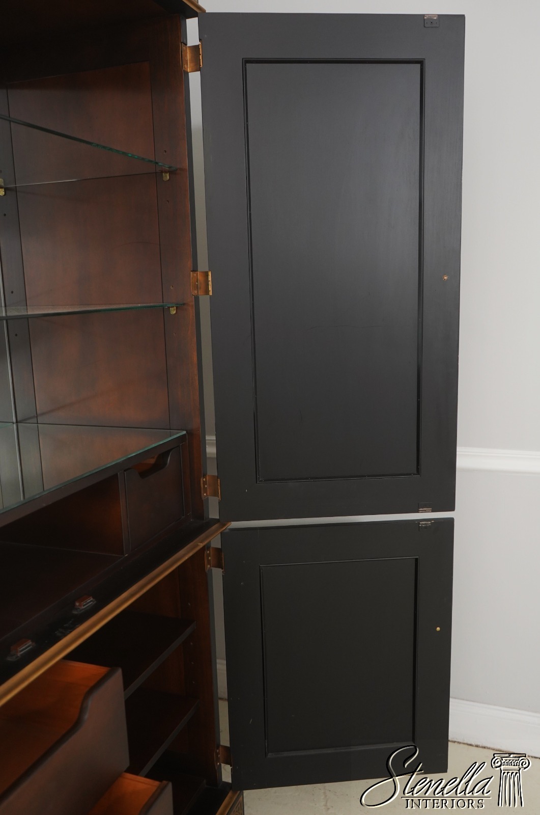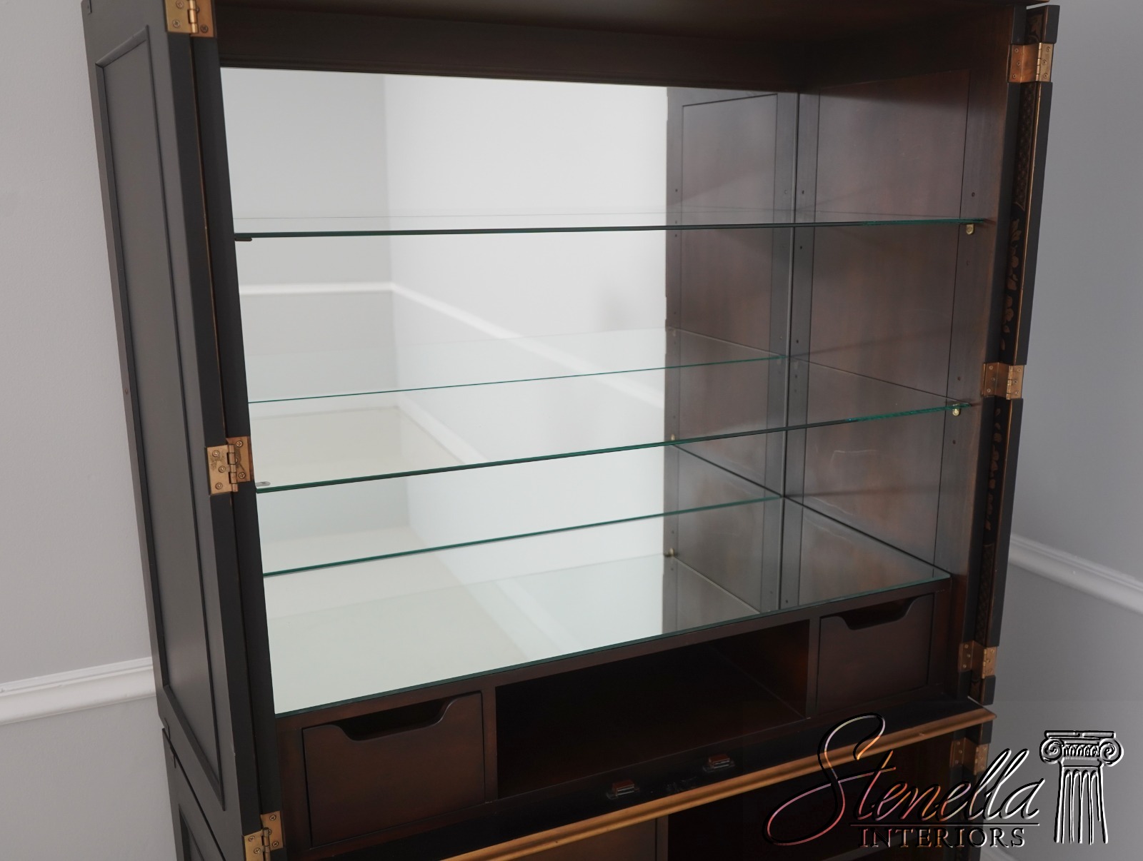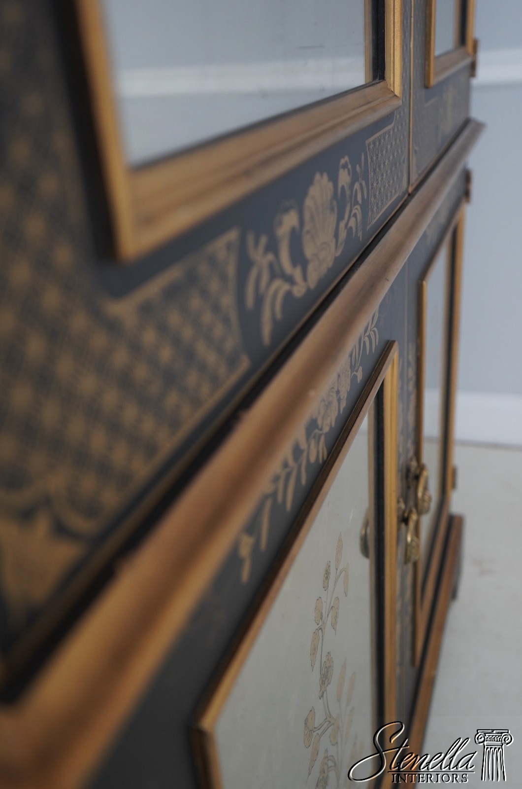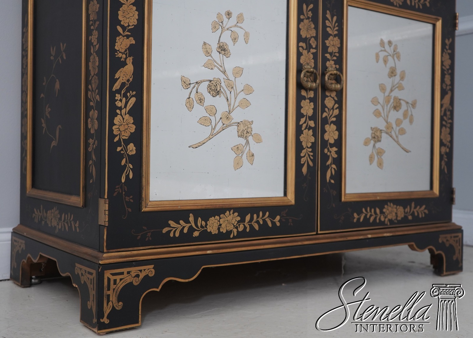 Details: Glass Adjustable Shelves Mirror Back Interior High Quality Construction Large Impressive Cabinet Stunning Eglomise Mirror Glass Front Doors Gorgeous Hand Painted Chinoiserie Finish Offered @ Fraction Original Retail Cost