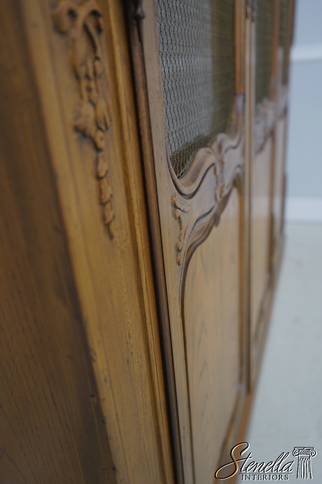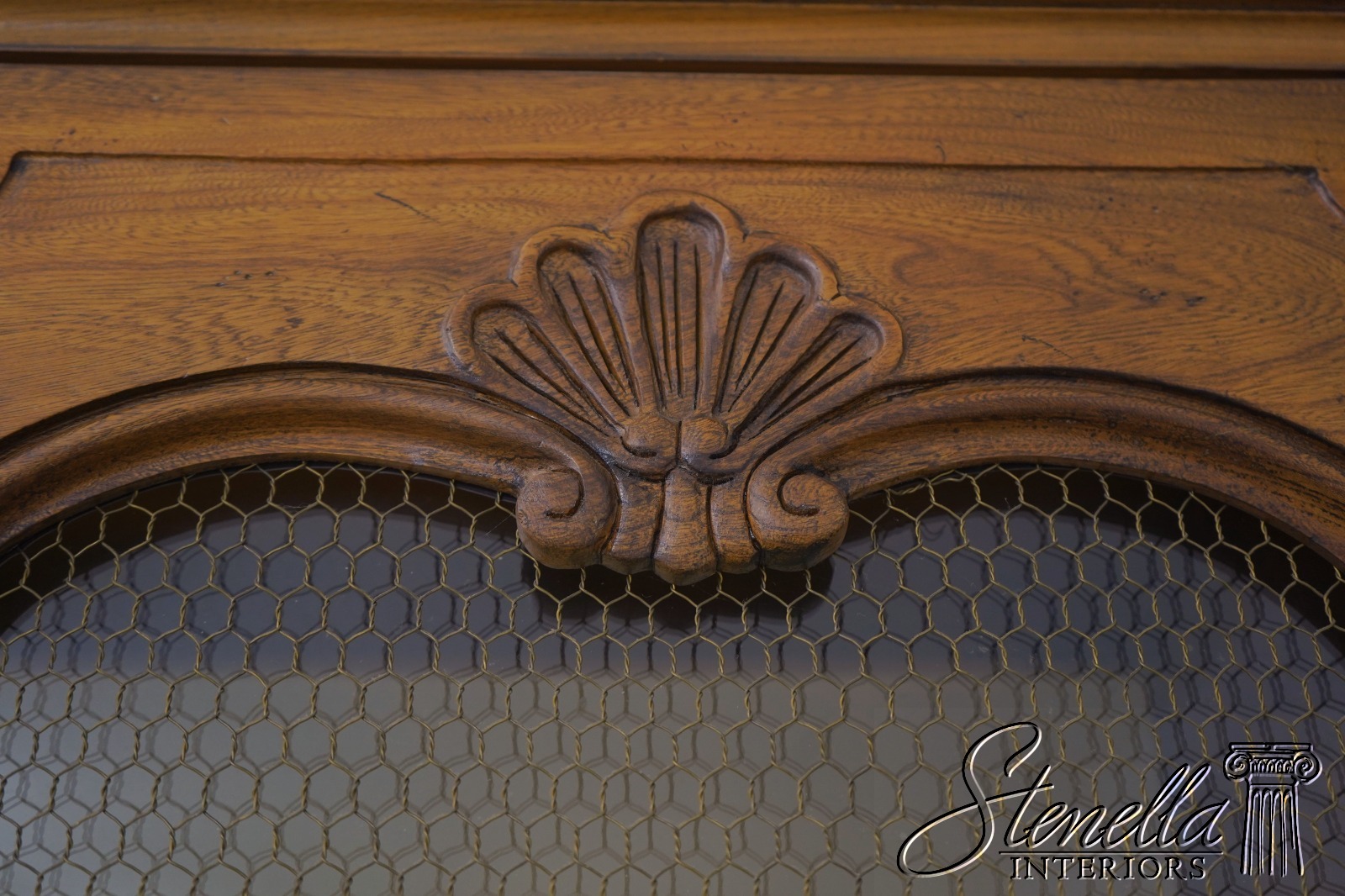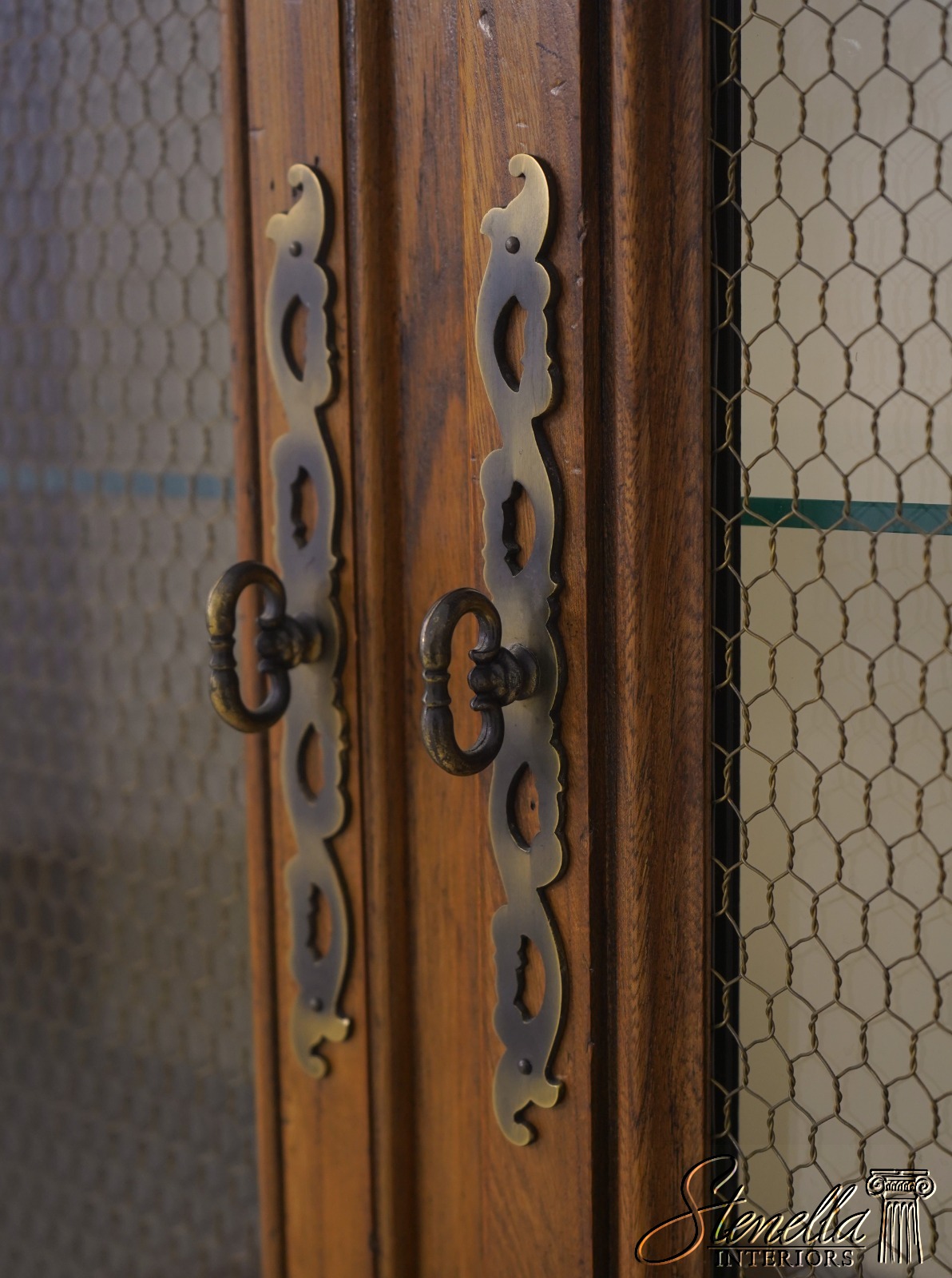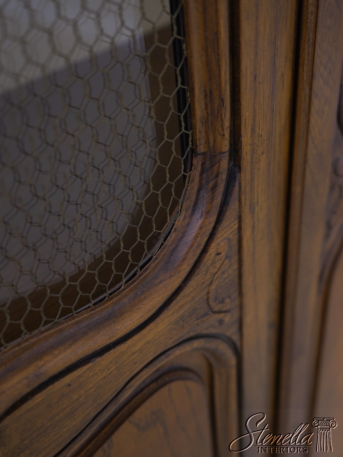 Details: Glass Adjustable Shelves Country French Style Dovetailed Drawer Construction Large Impressive Cabinet Lighted Interior Wire Mesh Doors Over Glass Felt Lined Silverware Drawer Paint Decorated Back Panel