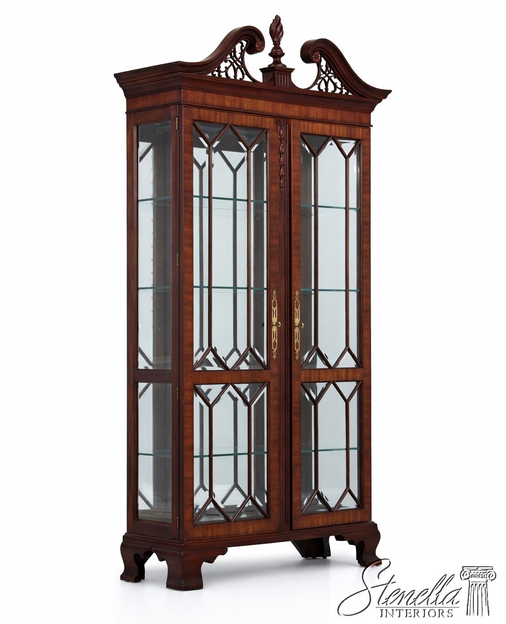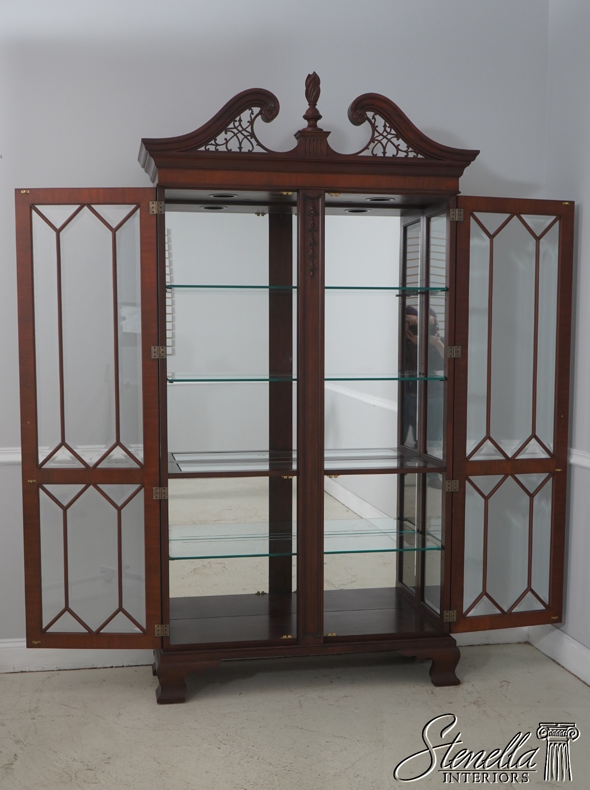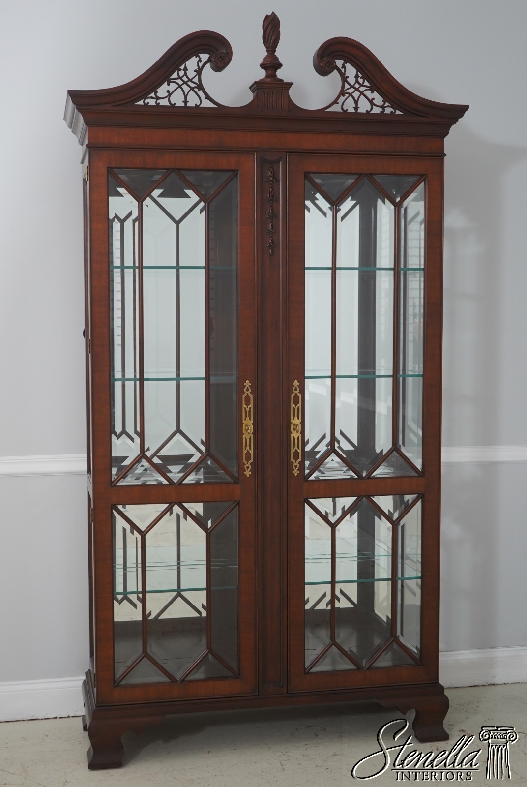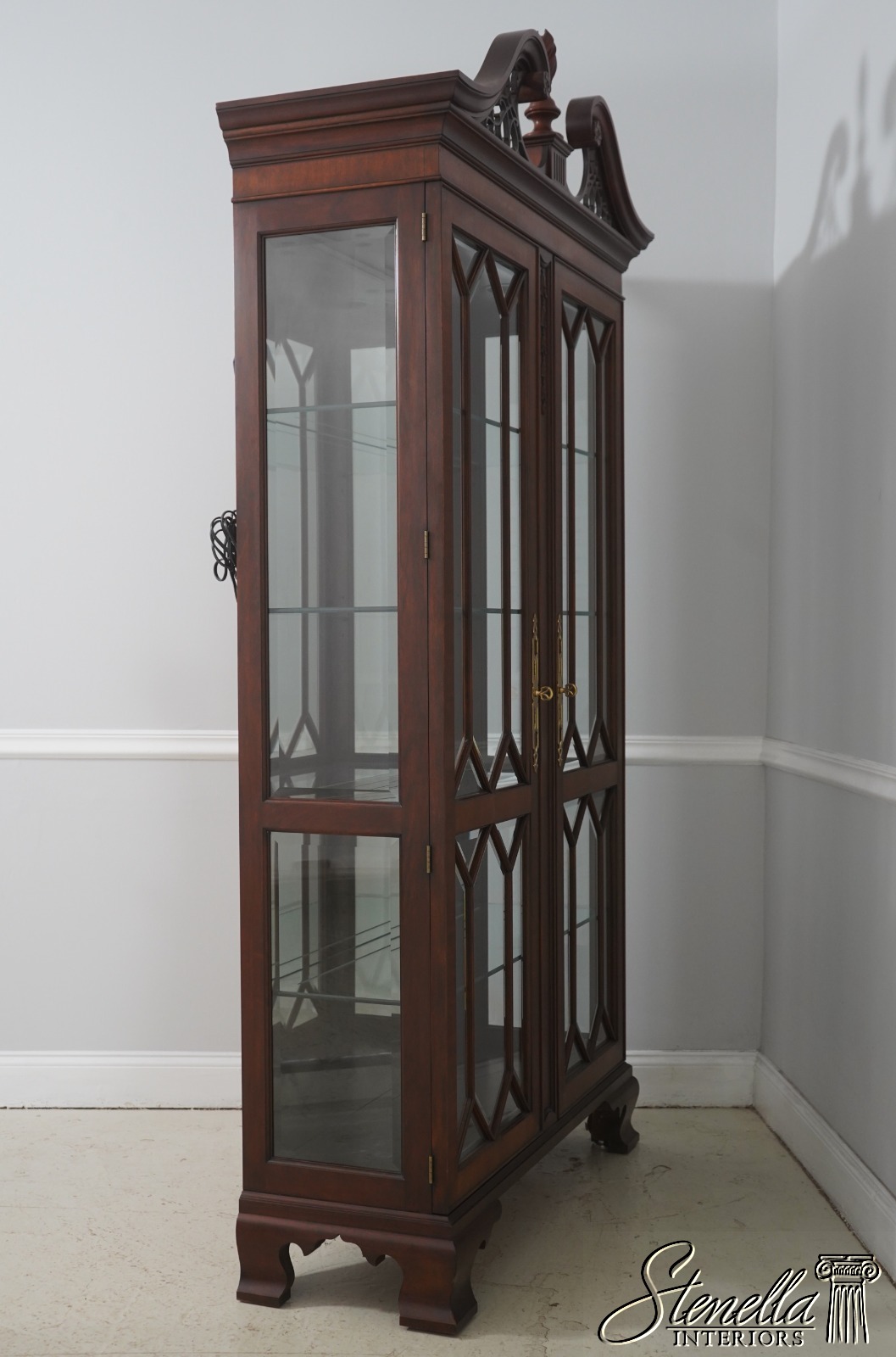 Details: Finish no 29 Model 2348 Glass Adjustable Shelves Beveled Glass Fine Carved Details High Quality Construction Lighted Interior Mirrored Back Pediment Top w. Finial 18 C. Design Chippendale Style Traditional Style Solid Brass Hardware Well Cared For Ready For Your Home Offered @ Fraction Original Retail Cost