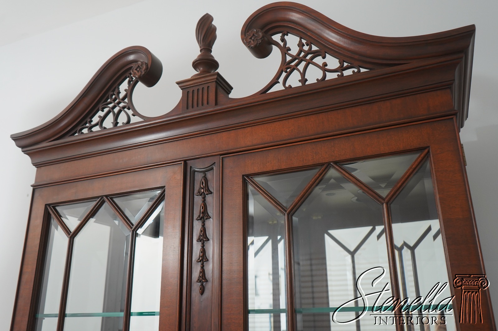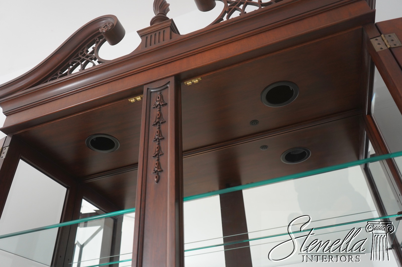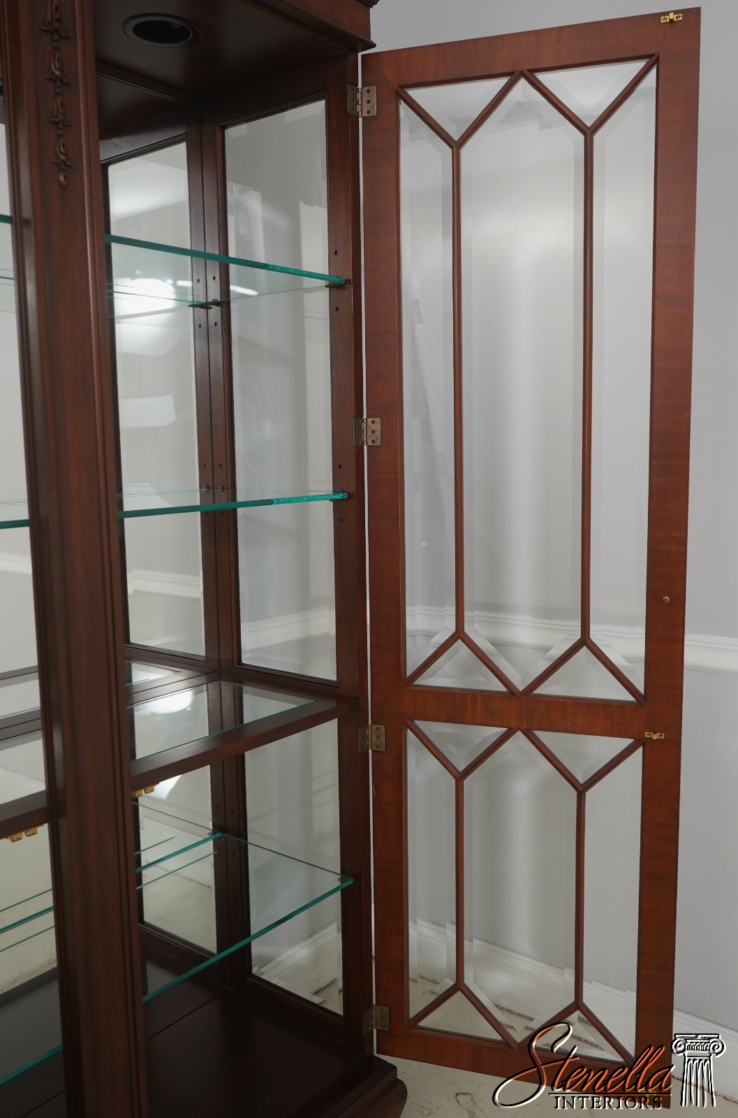 Details: Finish no 29 Model 2348 Glass Adjustable Shelves Beveled Glass Fine Carved Details High Quality Construction Lighted Interior Mirrored Back Pediment Top w. Finial 18 C. Design Chippendale Style Traditional Style Solid Brass Hardware Well Cared For Ready For Your Home Offered @ Fraction Original Retail Cost