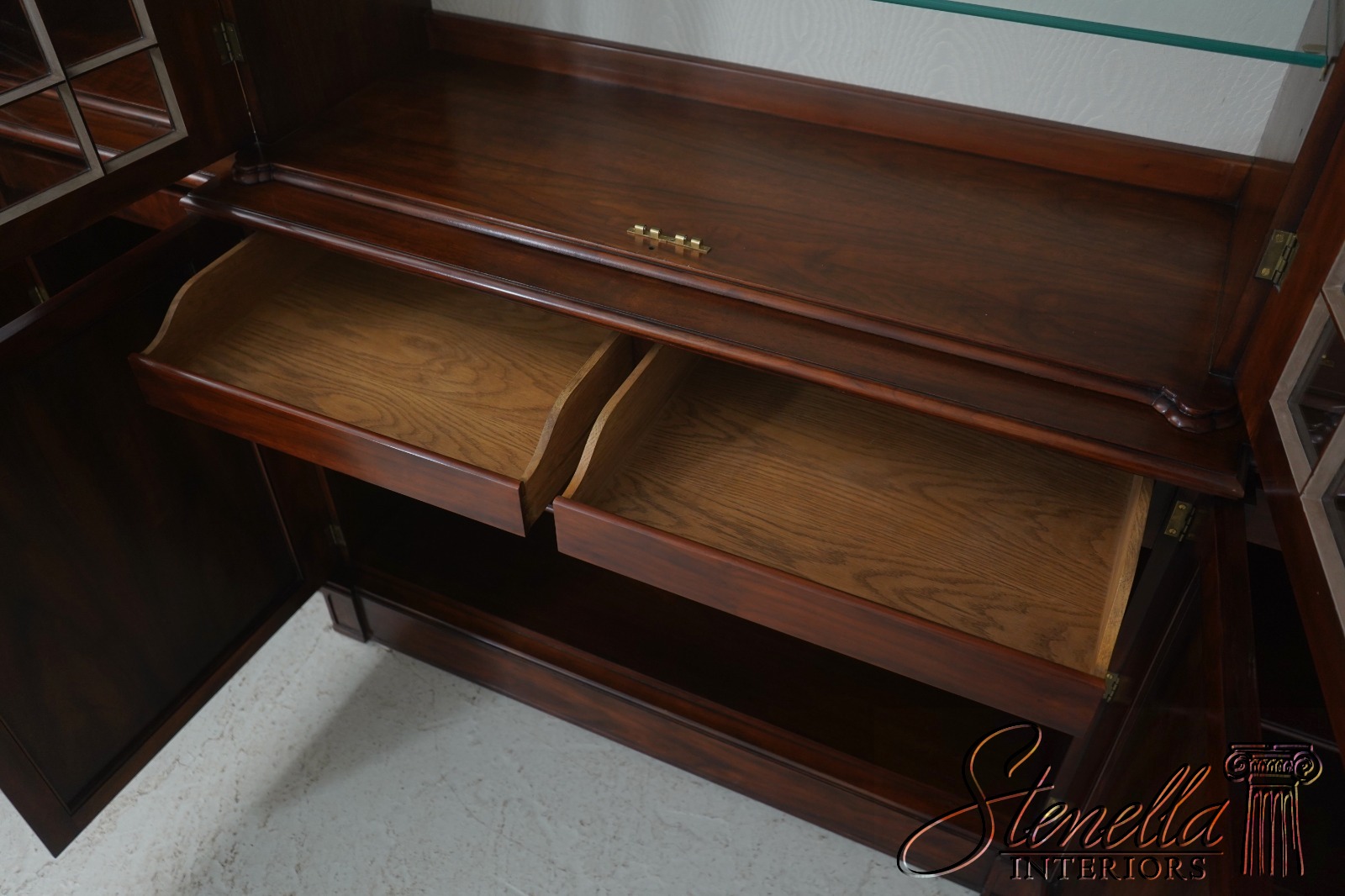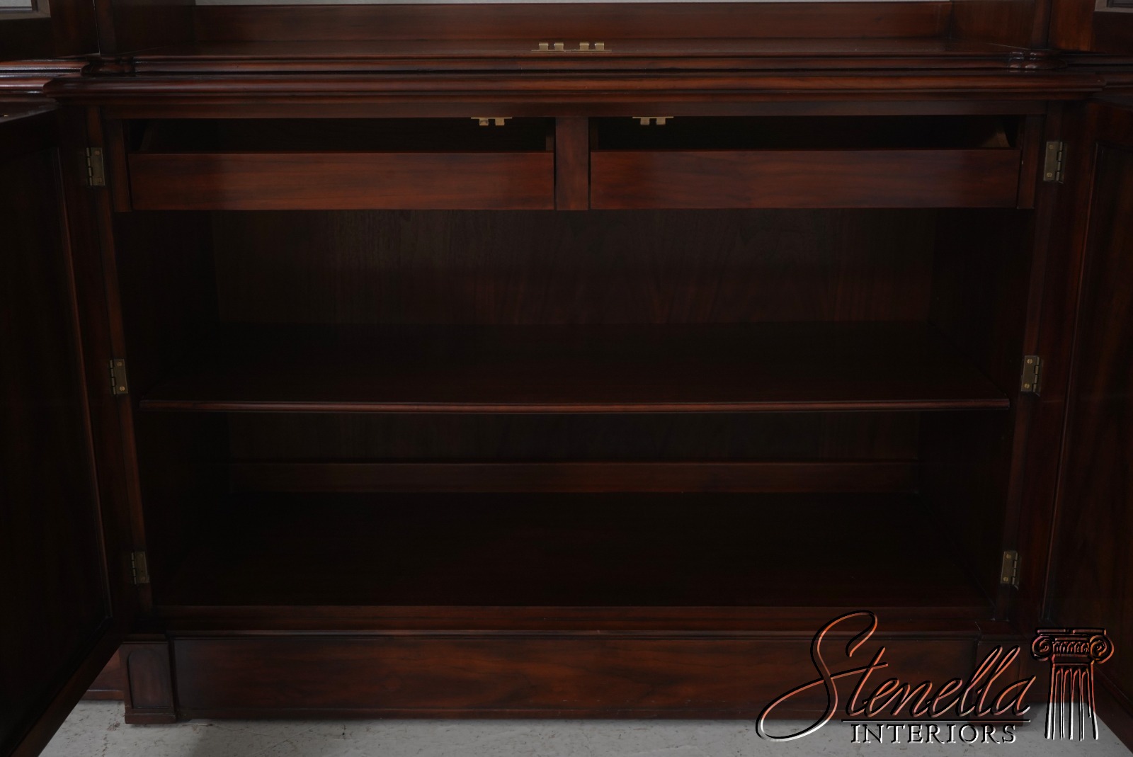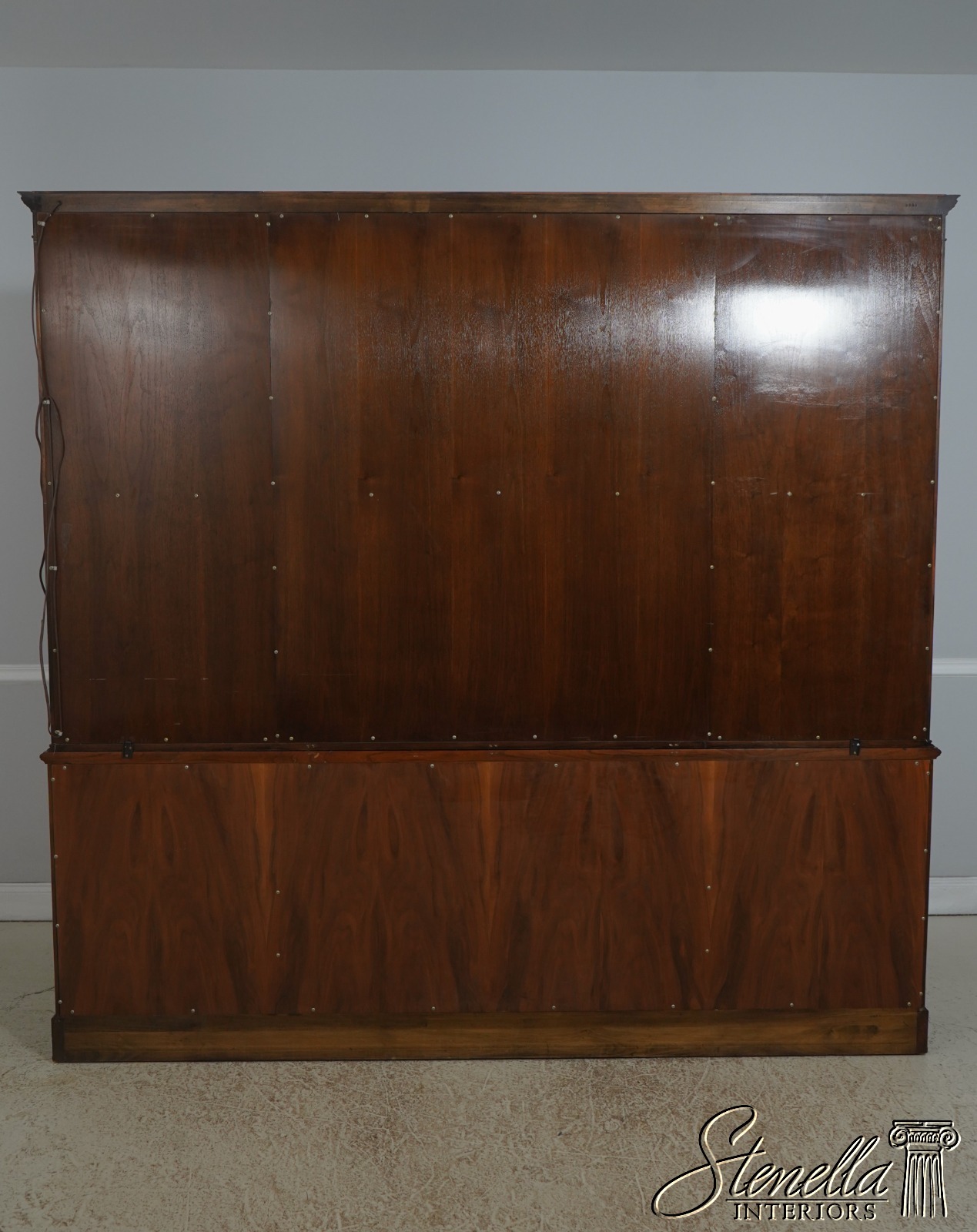 Details: Regency Style Adjustable Shelves Dovetailed Drawer Construction High Quality Construction Large Impressive Cabinet Quarter Column Sides Walnut Individual Pane Glass Doors Traditional Style 2 Pieces Key Locking w. Key 2 Interior Drawers Offered @ Fraction Original Retail Cost