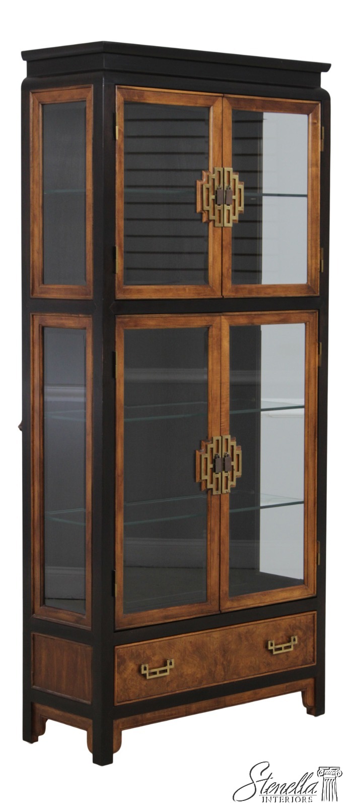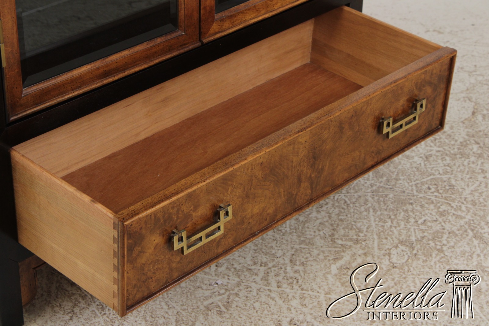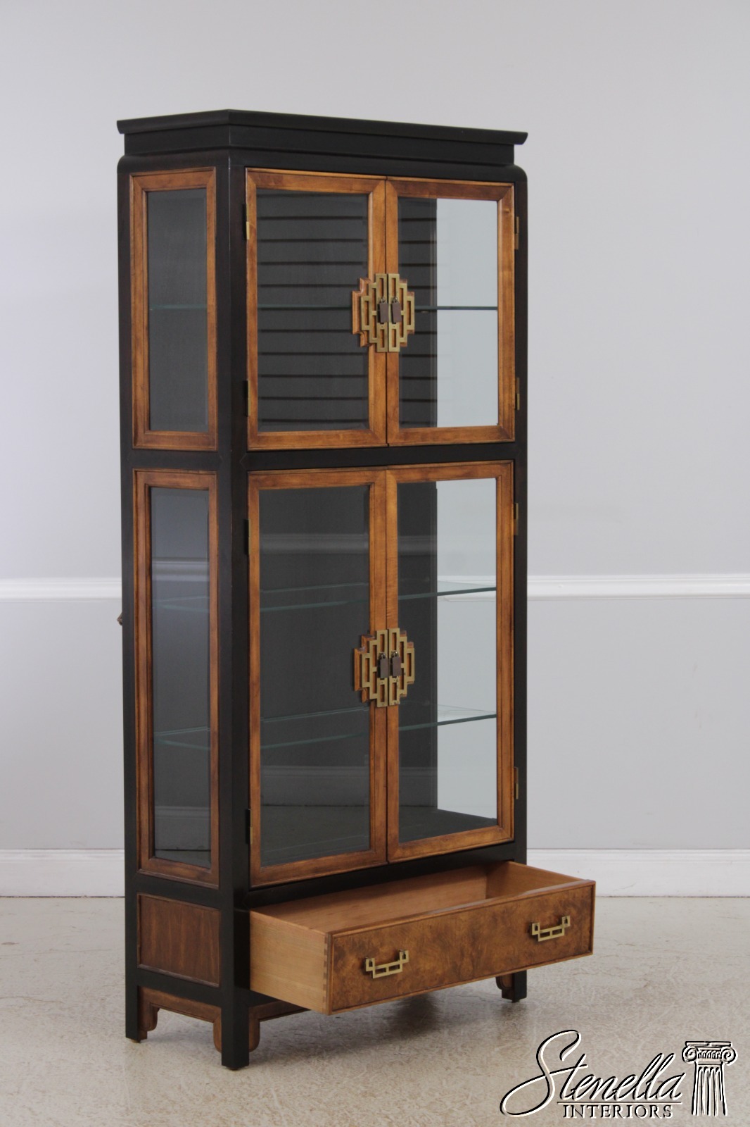Details: Design By Raymond Sobota Mahogany Beveled Glass Dovetailed Drawer Construction Quality Construction Large Impressive Cabinet Lighted Interior Individual Pane Glass Doors Solid Brass Hardware Burl/Tortoise Shell Look To Drawers Offered @ Fraction Original Retail Cost