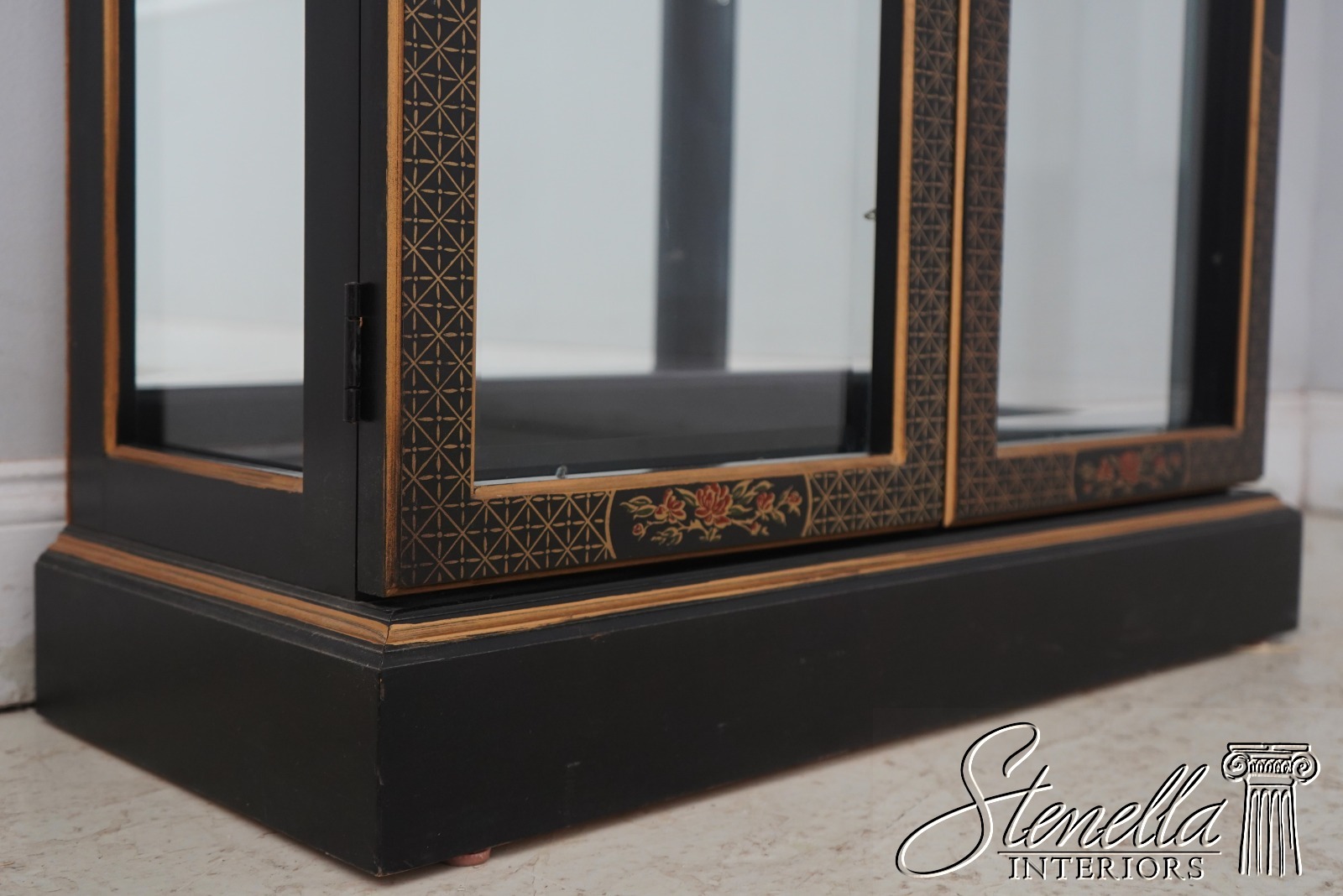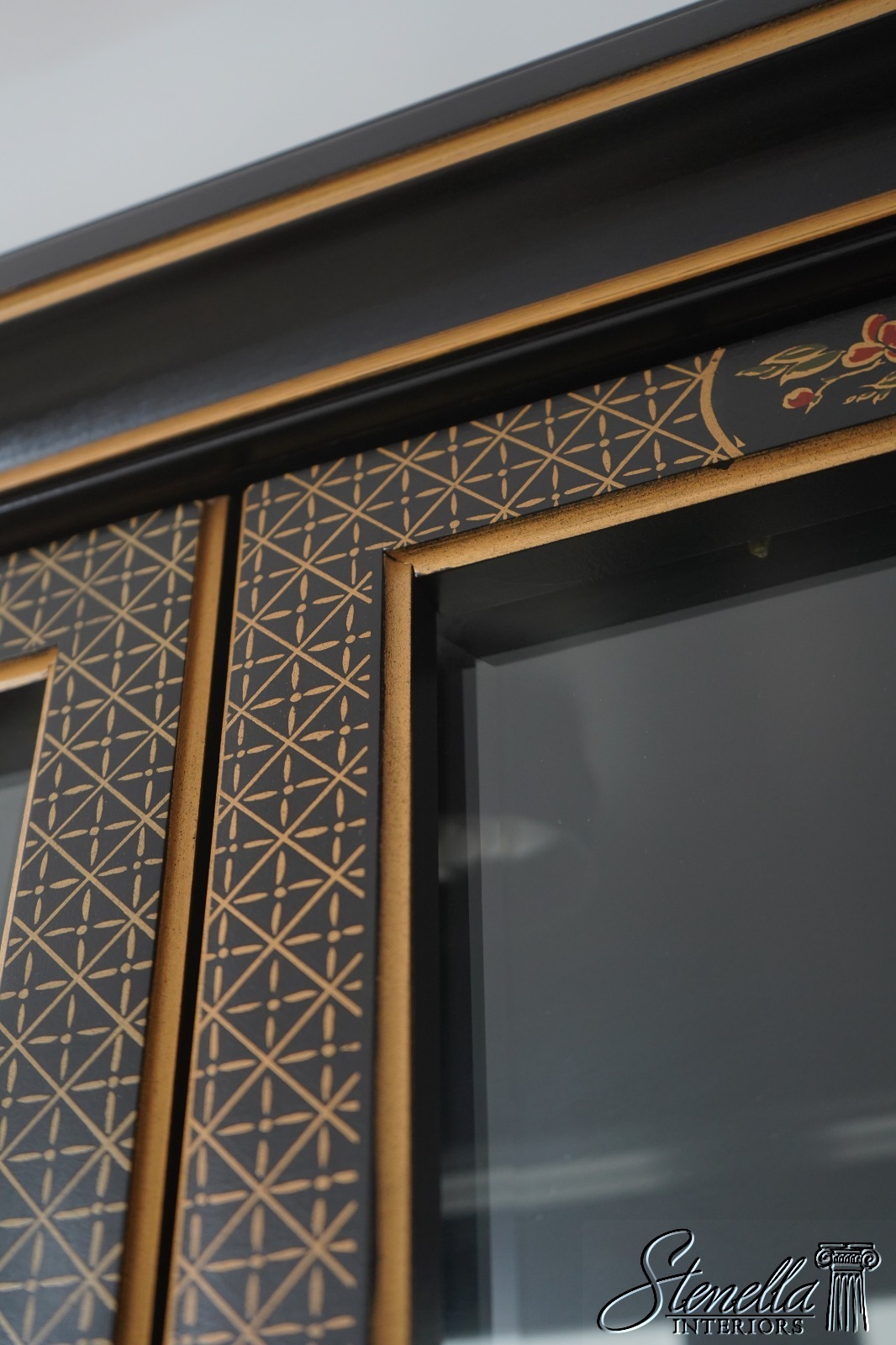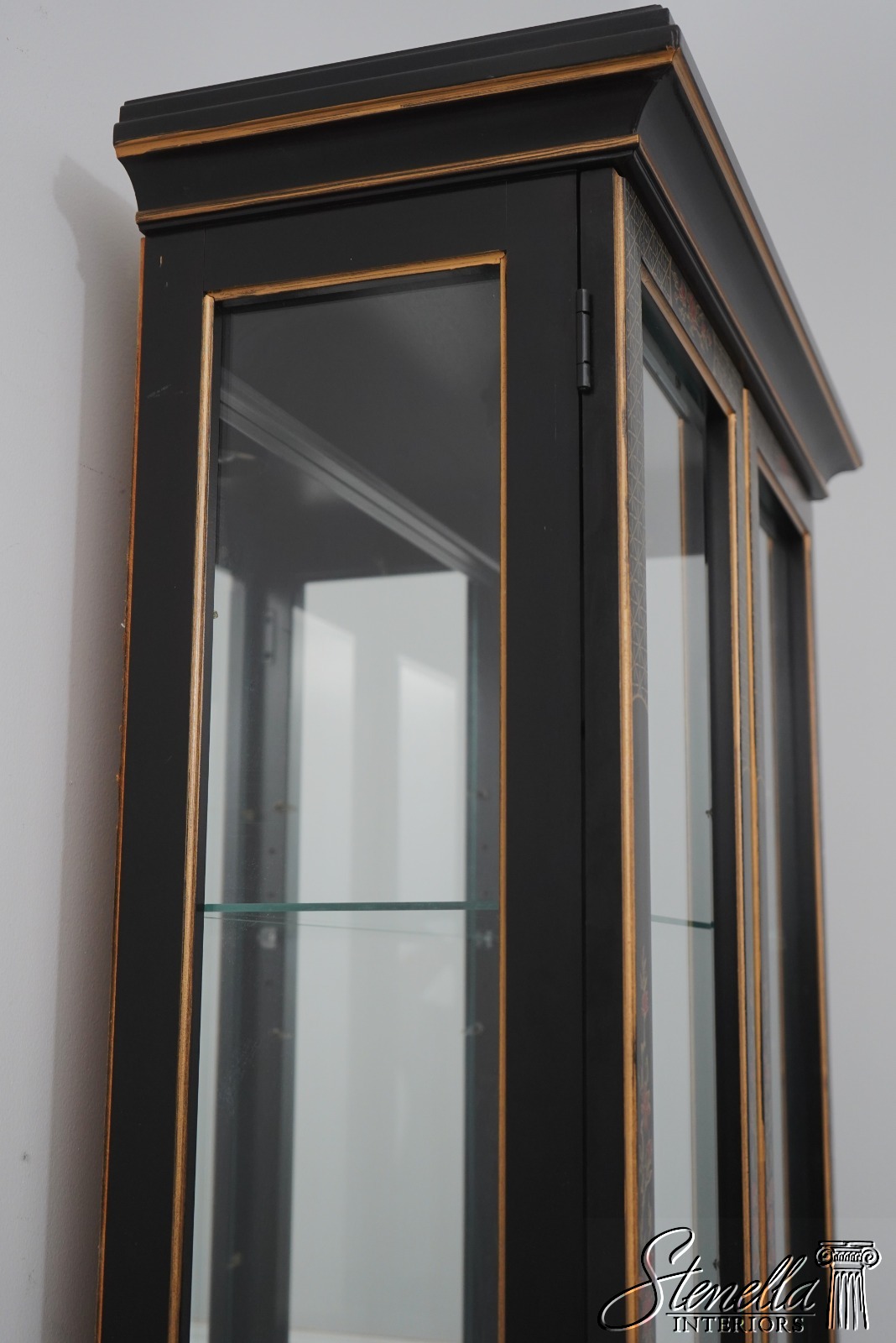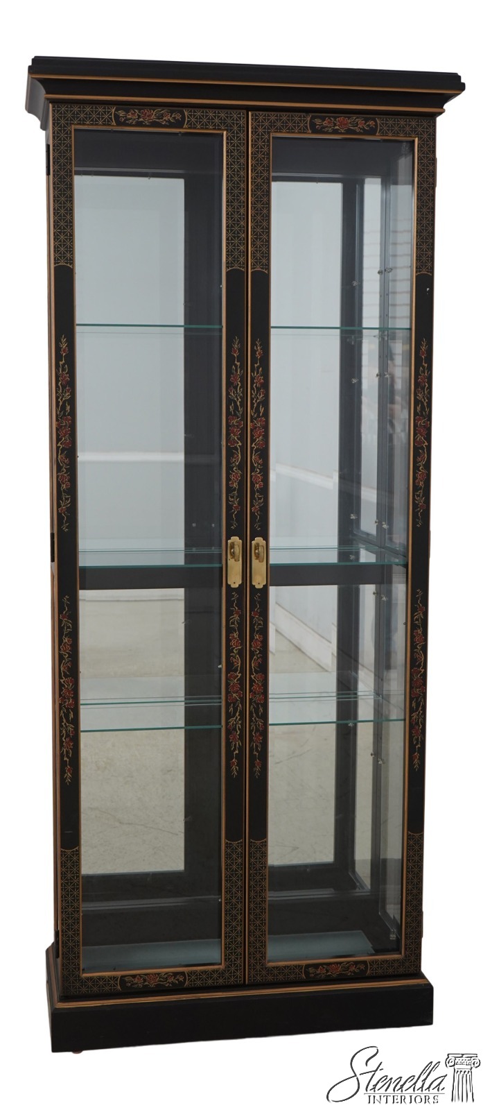 Details: Adjustable Shelves Beveled Glass High Quality Construction Large Impressive Cabinet Lighted Interior Mirrored Back Individual Pane Glass Doors Solid Brass Hardware Asian Floral Motif Shelves Have Plate Grooves Ebony, Gold & Red Paint Un-Marked As To Manufacture Offered @ Fraction Original Retail Cost