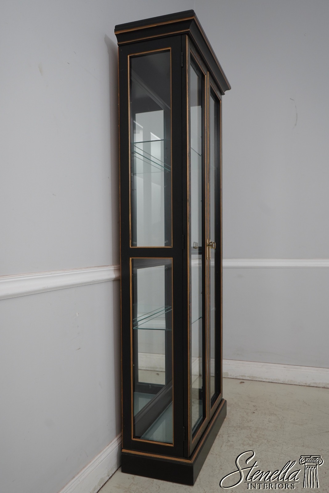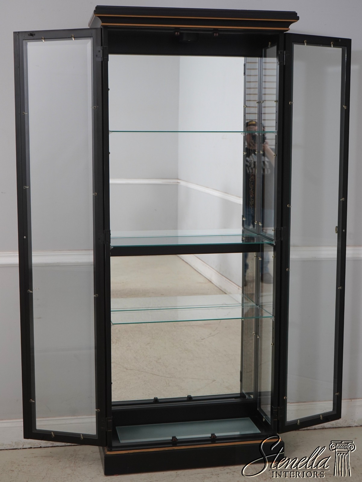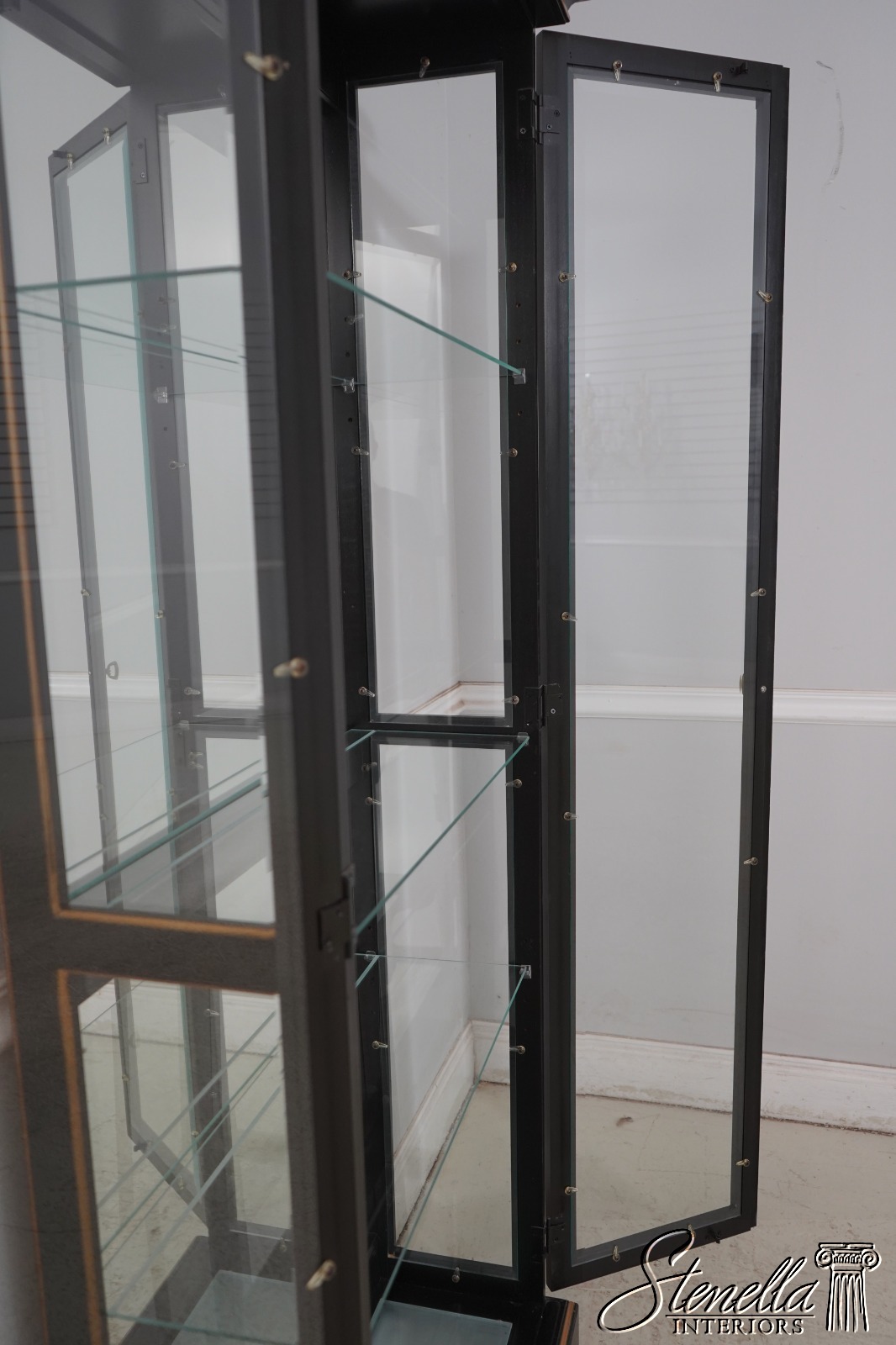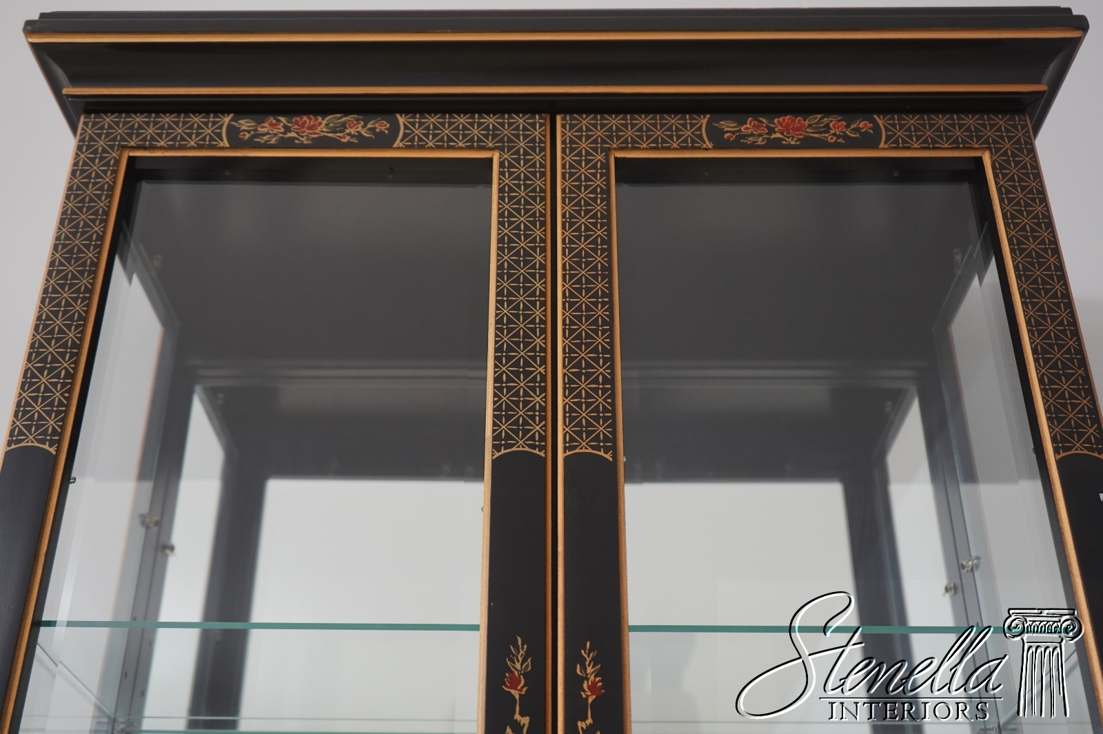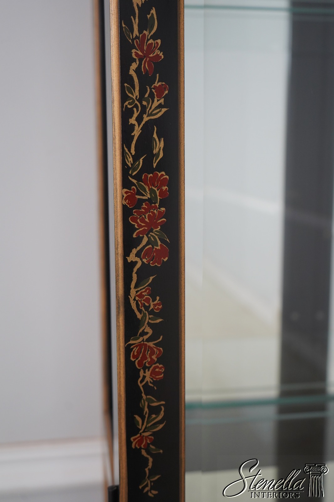 Details: Adjustable Shelves Beveled Glass High Quality Construction Large Impressive Cabinet Lighted Interior Mirrored Back Individual Pane Glass Doors Solid Brass Hardware Asian Floral Motif Shelves Have Plate Grooves Ebony, Gold & Red Paint Un-Marked As To Manufacture Offered @ Fraction Original Retail Cost