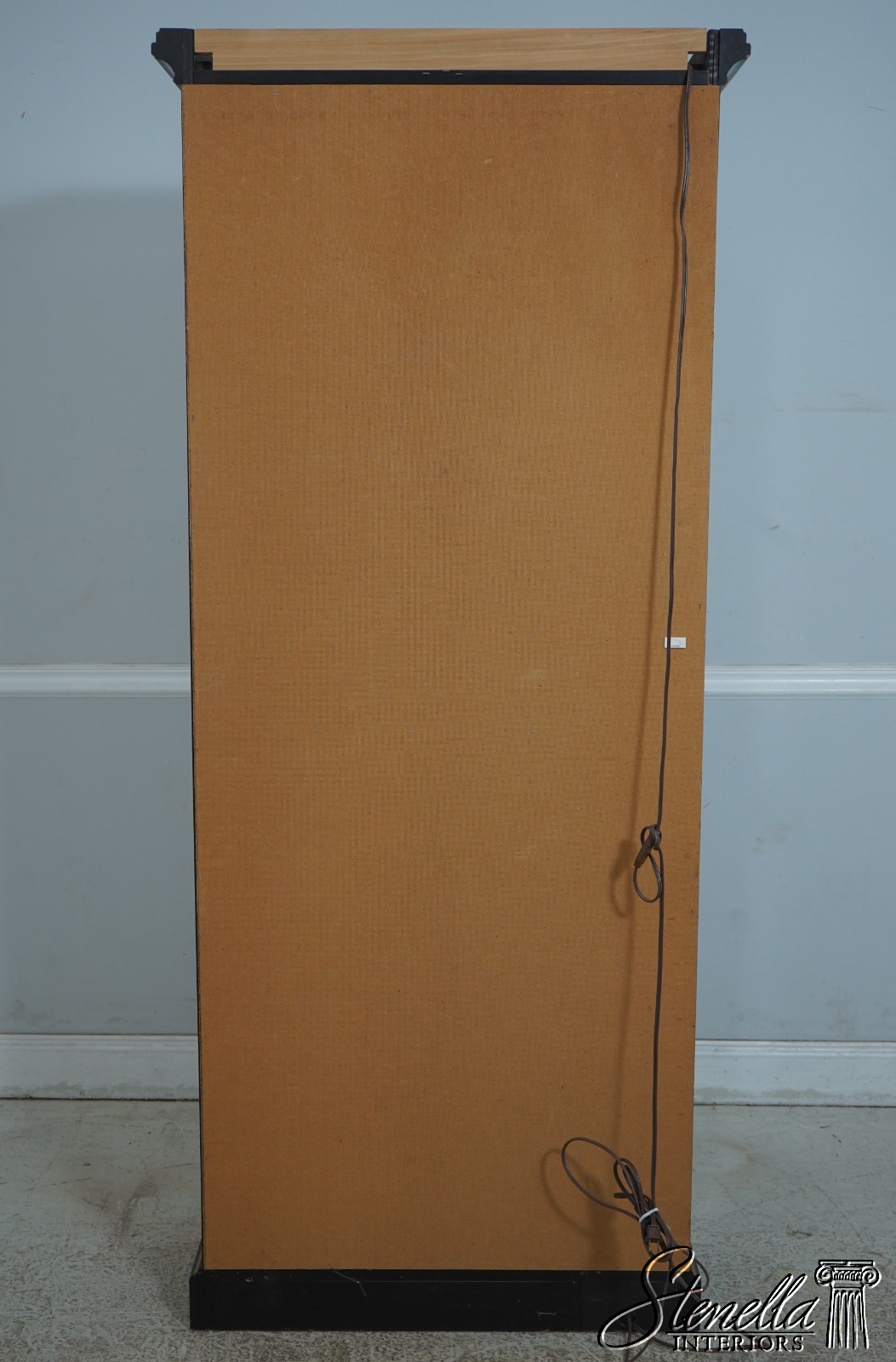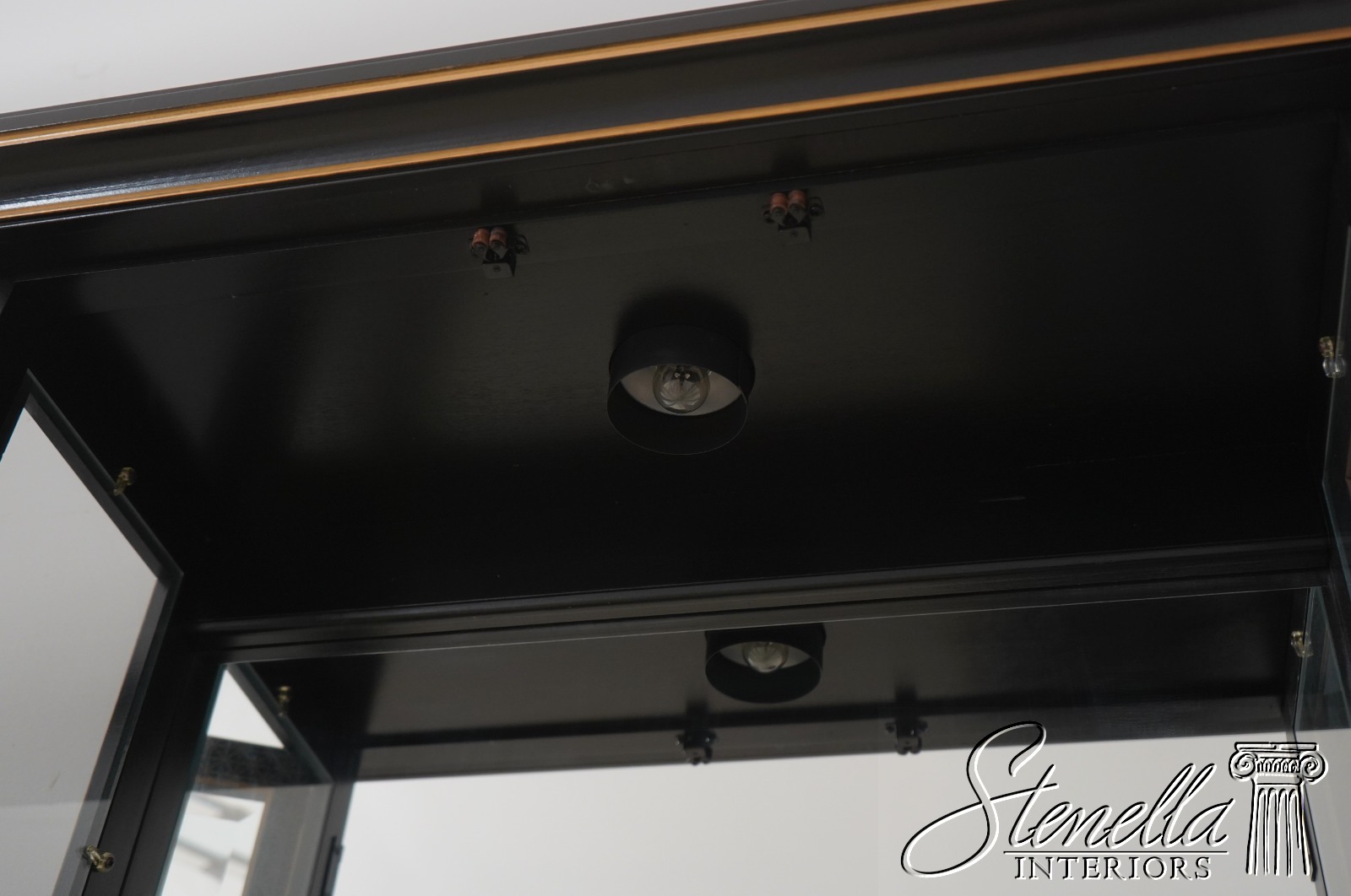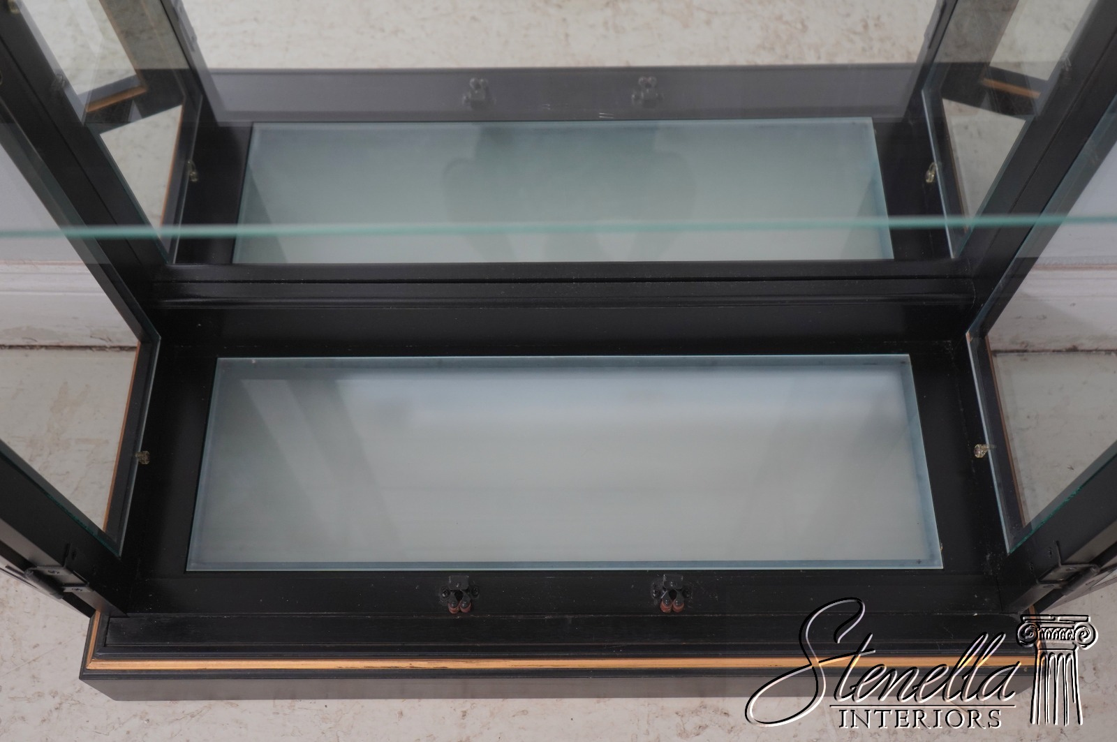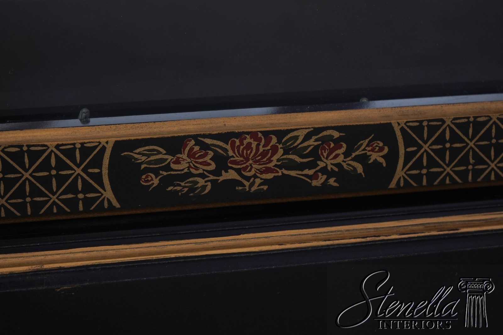 Details: Adjustable Shelves Beveled Glass High Quality Construction Large Impressive Cabinet Lighted Interior Mirrored Back Individual Pane Glass Doors Solid Brass Hardware Asian Floral Motif Shelves Have Plate Grooves Ebony, Gold & Red Paint Un-Marked As To Manufacture Offered @ Fraction Original Retail Cost