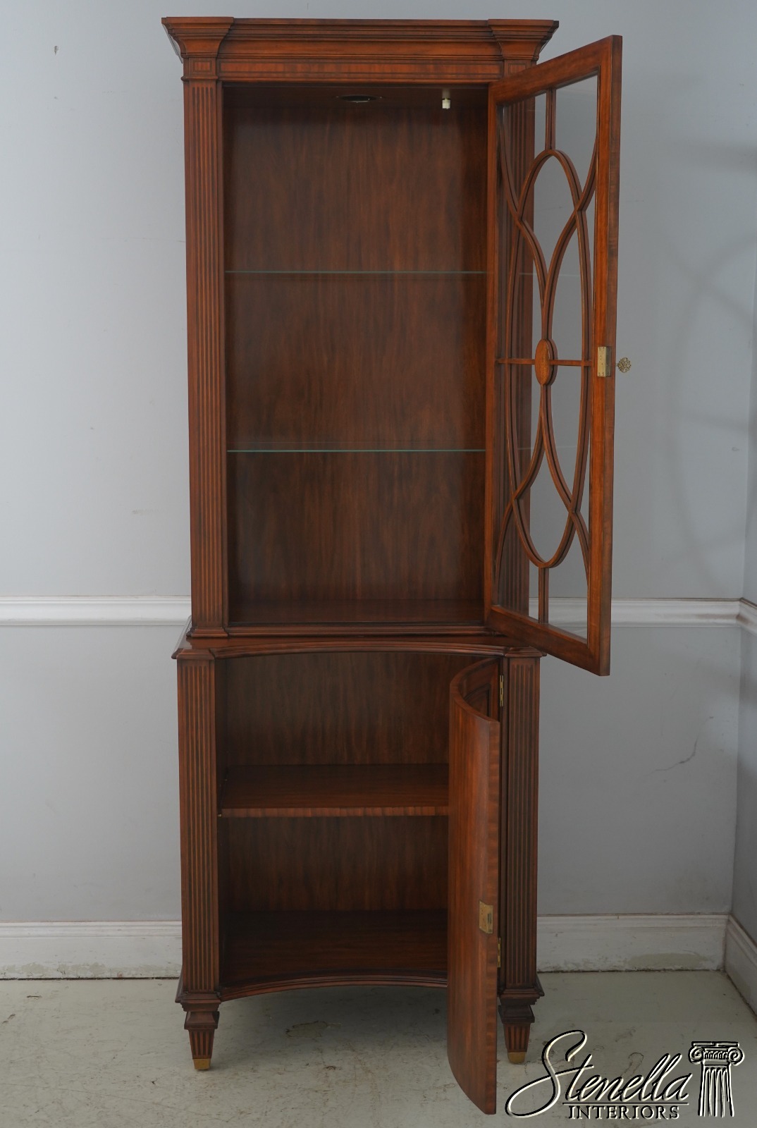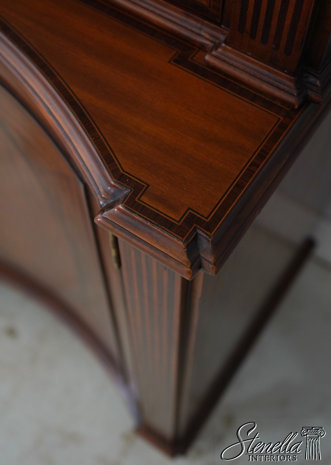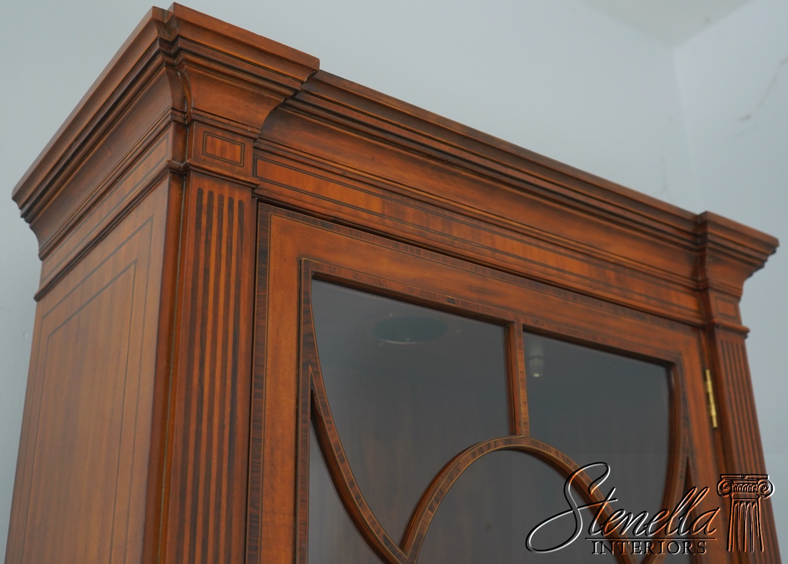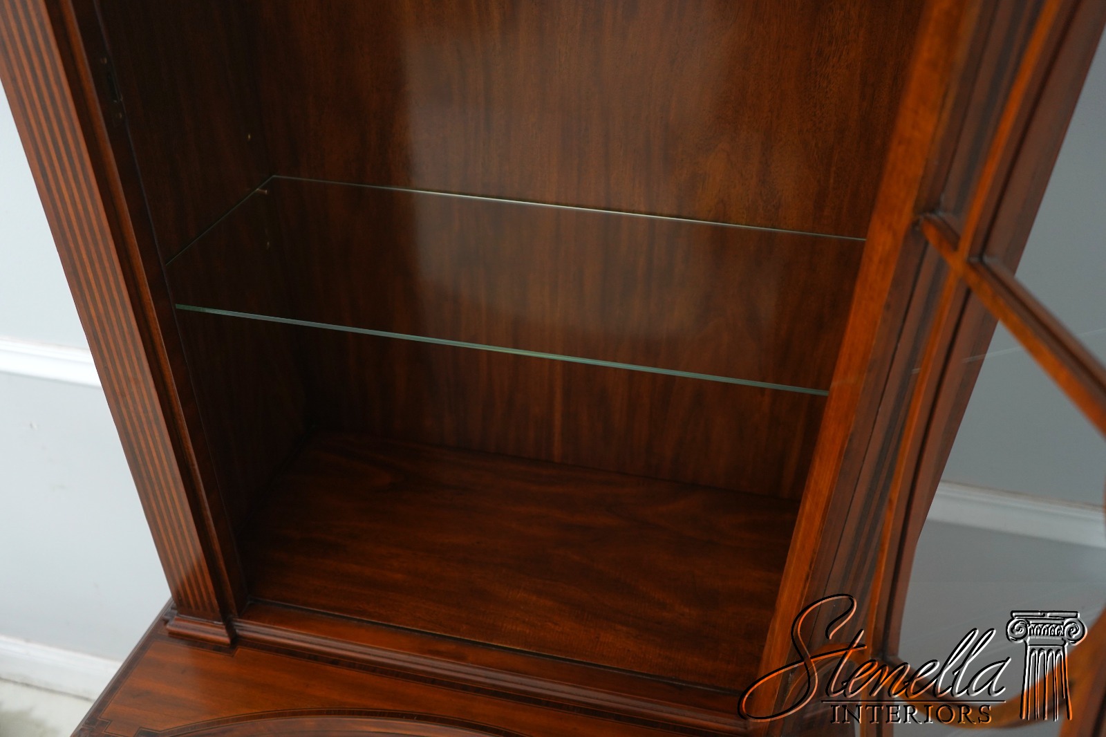 Details: Mahogany Adjustable Shelves Brass Capped Feet Fine Carved Details Quality Construction Large Impressive Cabinet Lighted Interior Nice Inlay Work Throughout Individual Pane Glass Doors English Style Concave Lower Door Key Locking w. Key Painted Faux Columns On Sides Un-Marked As To Manufacture Offered @ Fraction Original Retail Cost