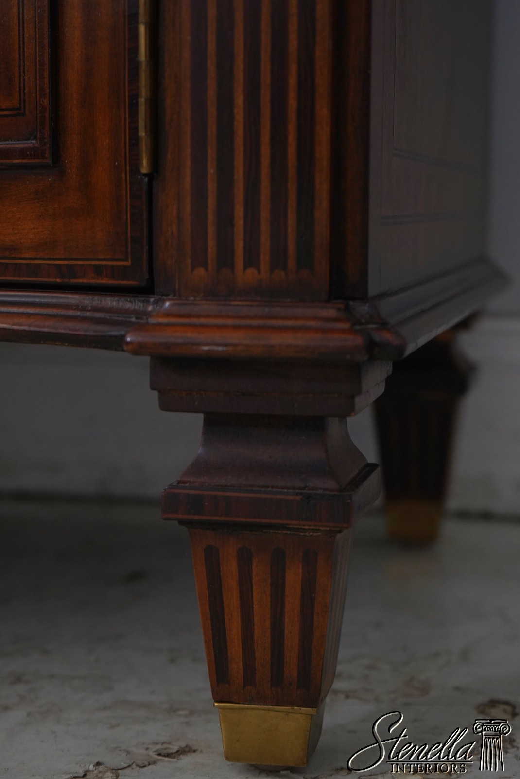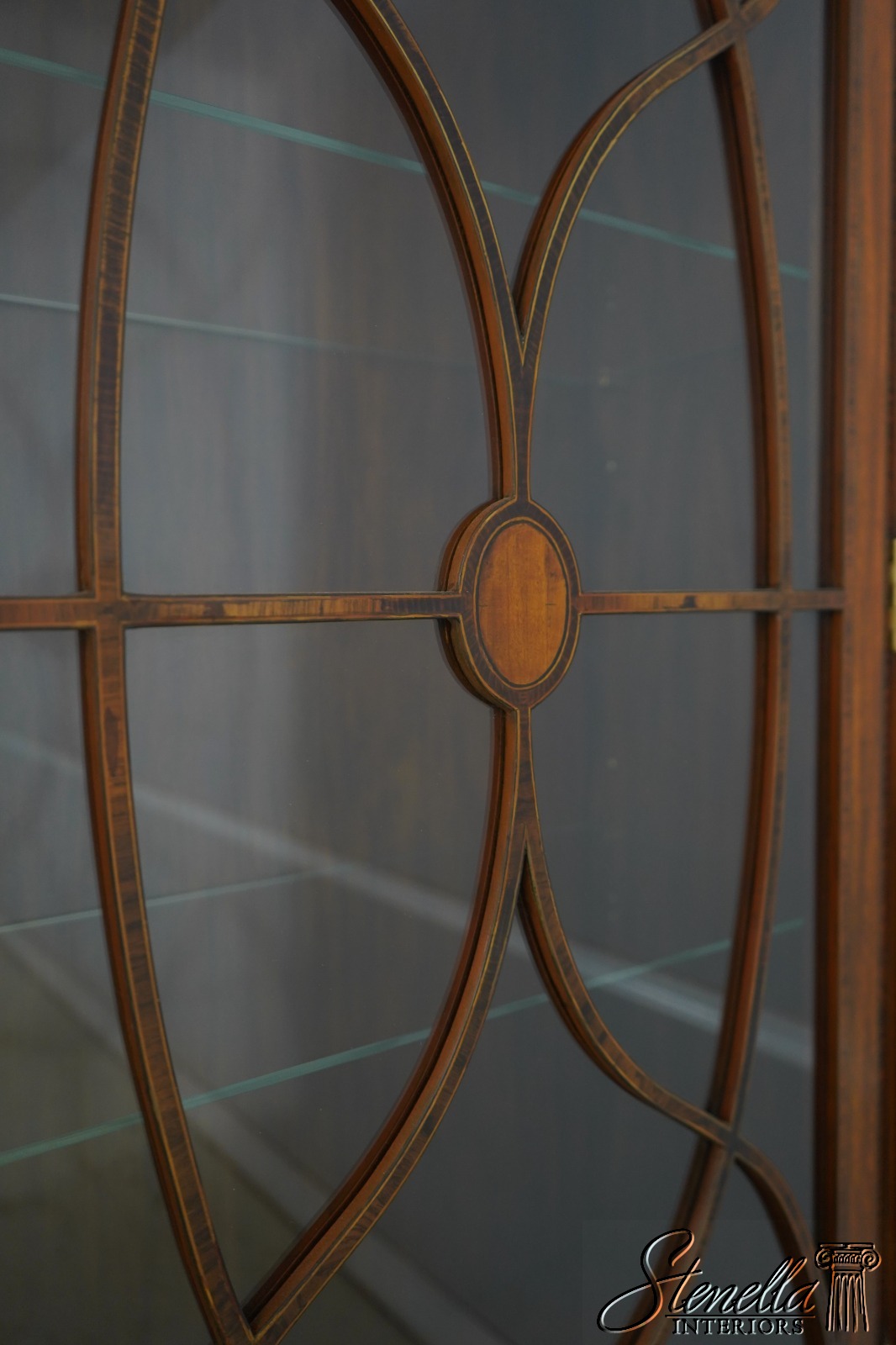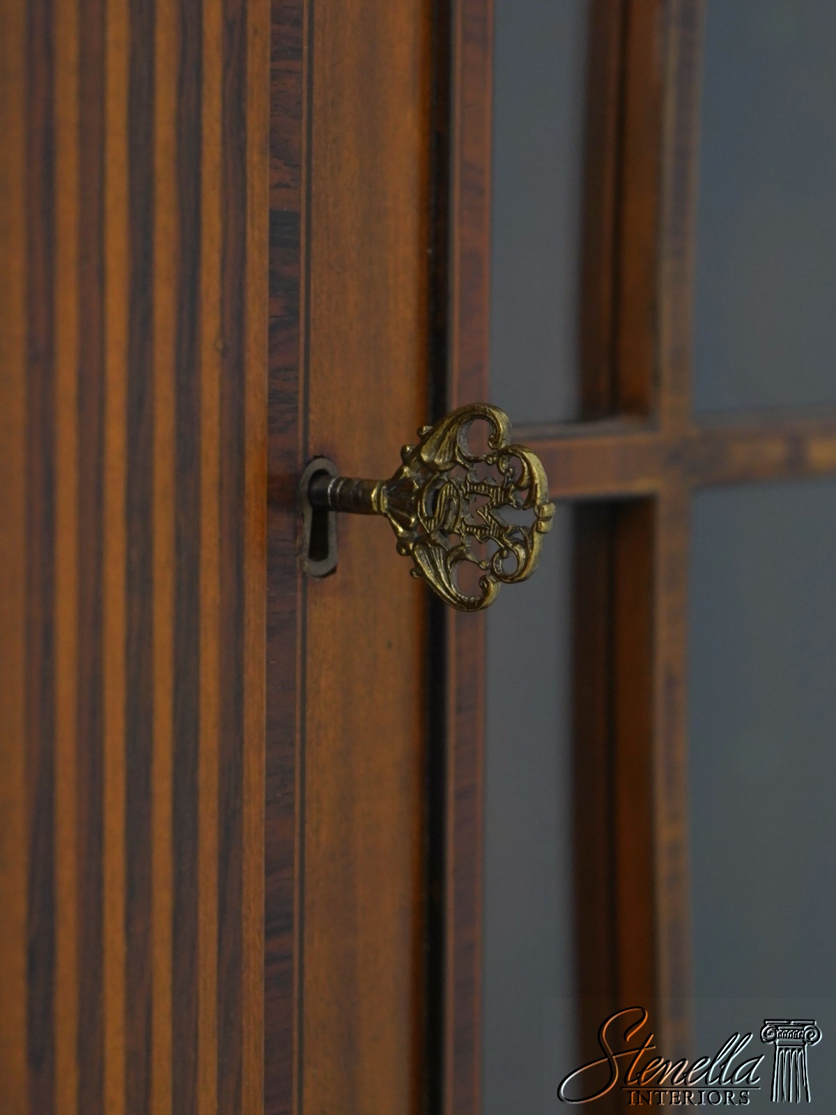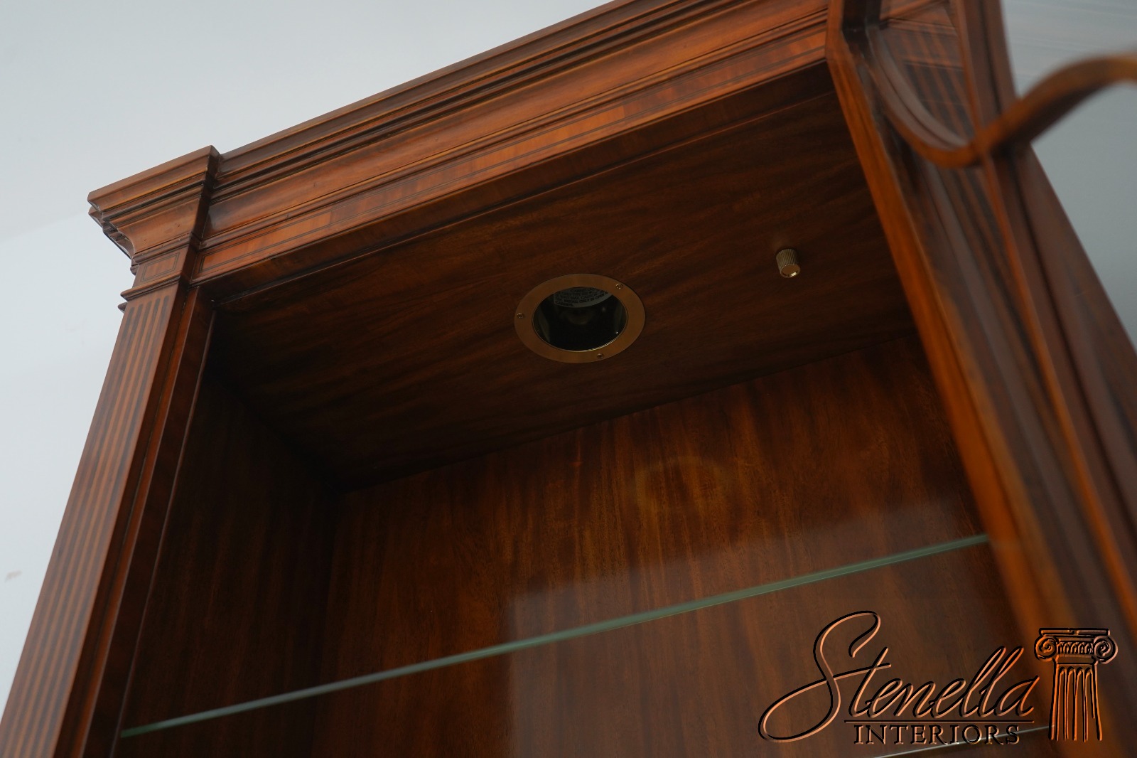 Details: Mahogany Adjustable Shelves Brass Capped Feet Fine Carved Details Quality Construction Large Impressive Cabinet Lighted Interior Nice Inlay Work Throughout Individual Pane Glass Doors English Style Concave Lower Door Key Locking w. Key Painted Faux Columns On Sides Un-Marked As To Manufacture Offered @ Fraction Original Retail Cost