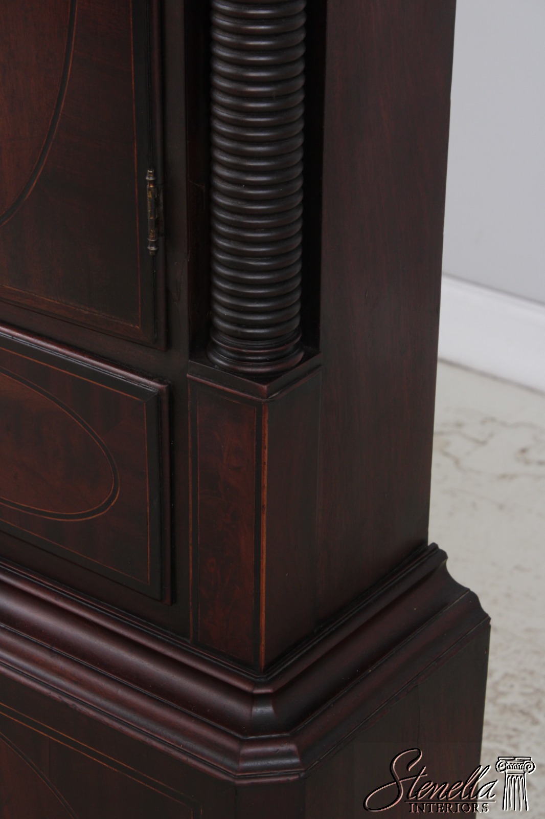 Details: Stunning Period Clock Mahogany Bracket Feet Fine Carved Details High Quality Construction Weight Driven Large Impressive Clock Nice Inlay Work Throughout Individual Pane Glass Doors Bonnet Top Hand Painted Face & Pendulum Spiral Sides Original Movement - Not Tested For Accuracy Key Locking - No Key Un-Marked As To Manufacture Offered @ Fraction Original Retail Cost