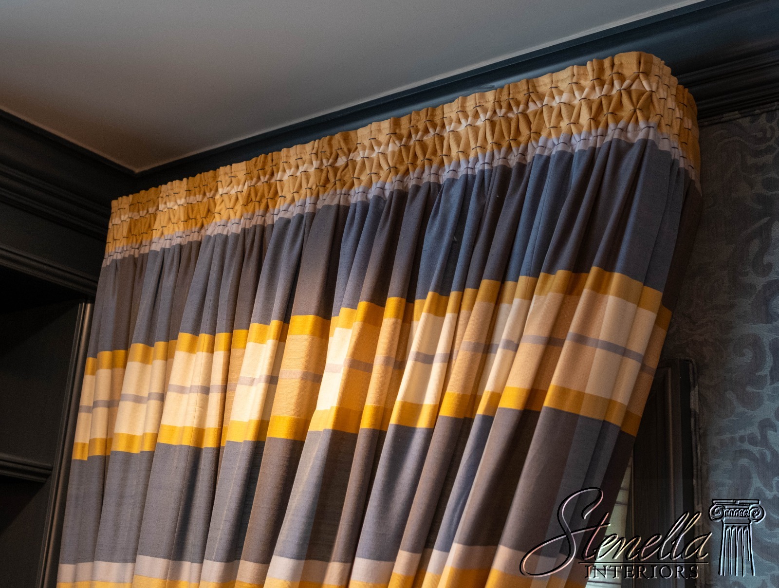 Details: Custom made by decorator Original cost over $11,000 Can be altered to fit your specs Offered at a fraction of original cost Blue and Gold drapes only Additional mounting hardware may be required