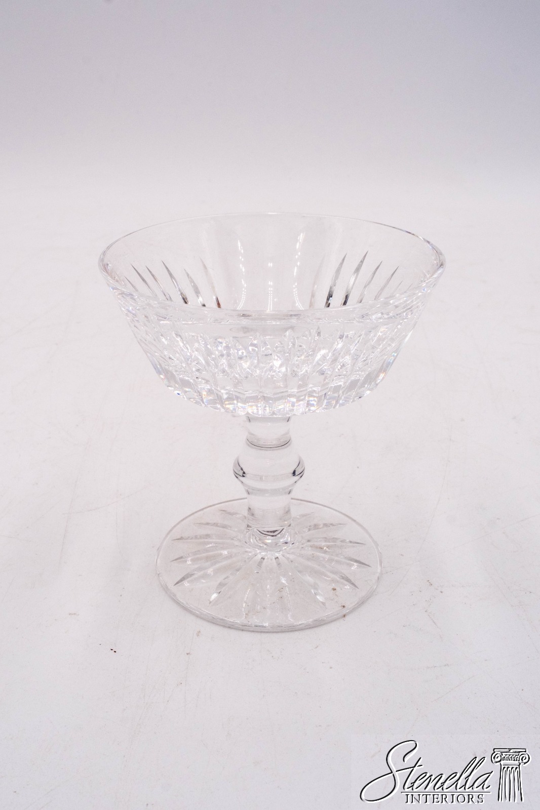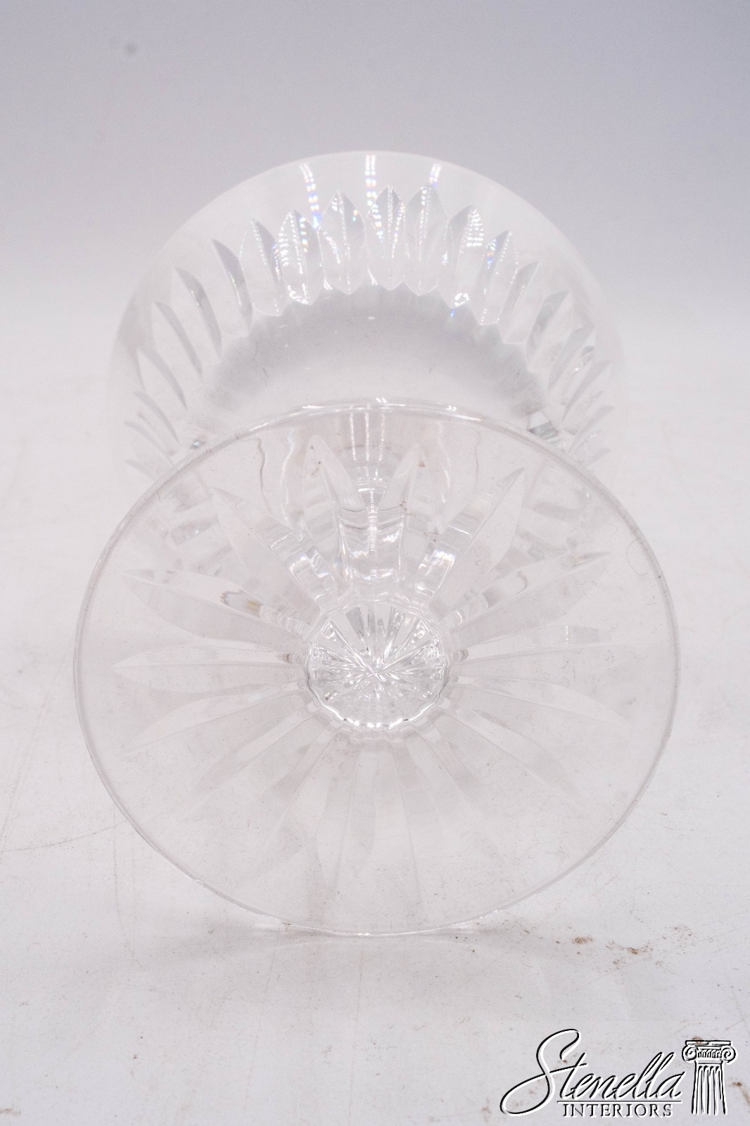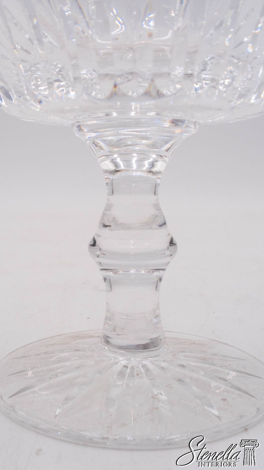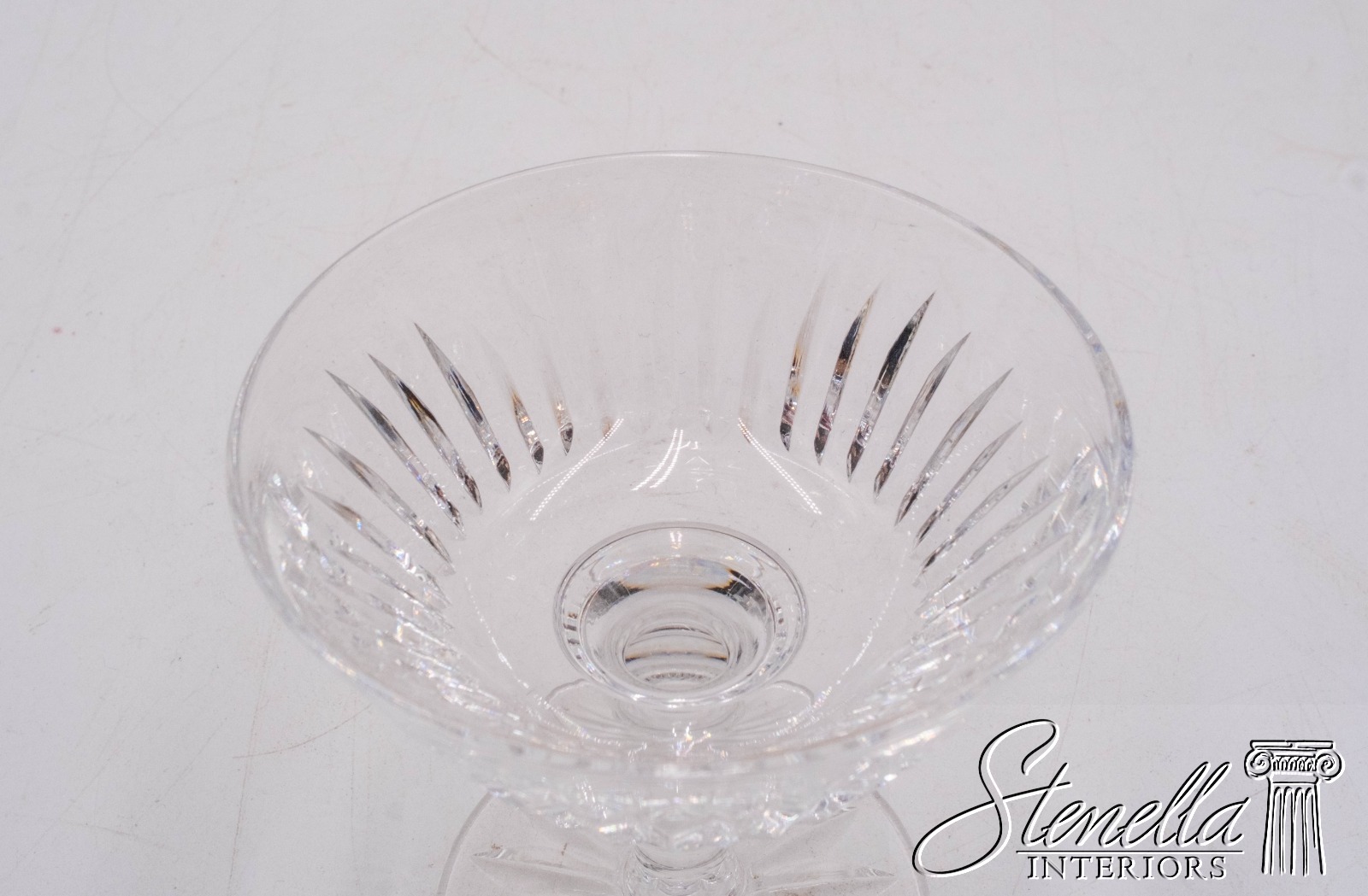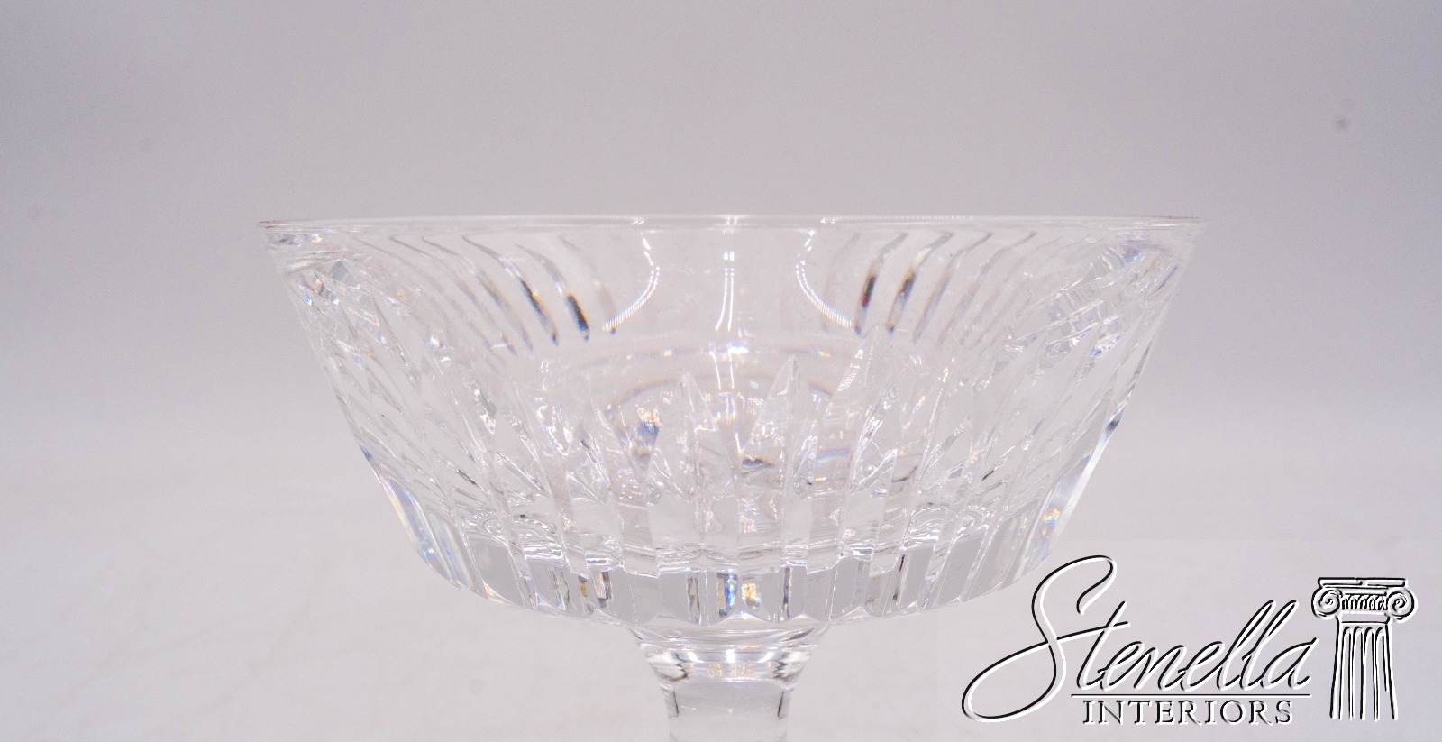 Details: Clear cut crystal in "Eileen" pattern. Vertical cut flair bowl top w/ cut feet. Blown glass crafted in Ireland