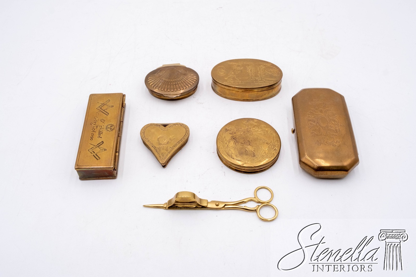 F69160: Set of 7 MOTTAHEDEH Winterthur Brass Pill boxes and Colonial Williamsburg candle snuff