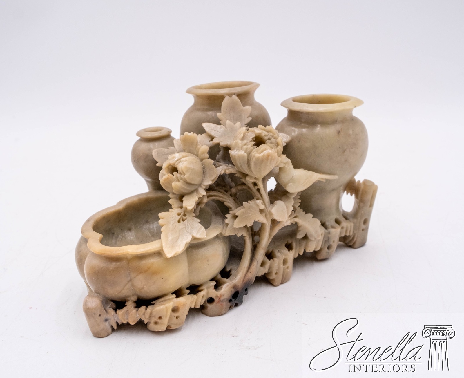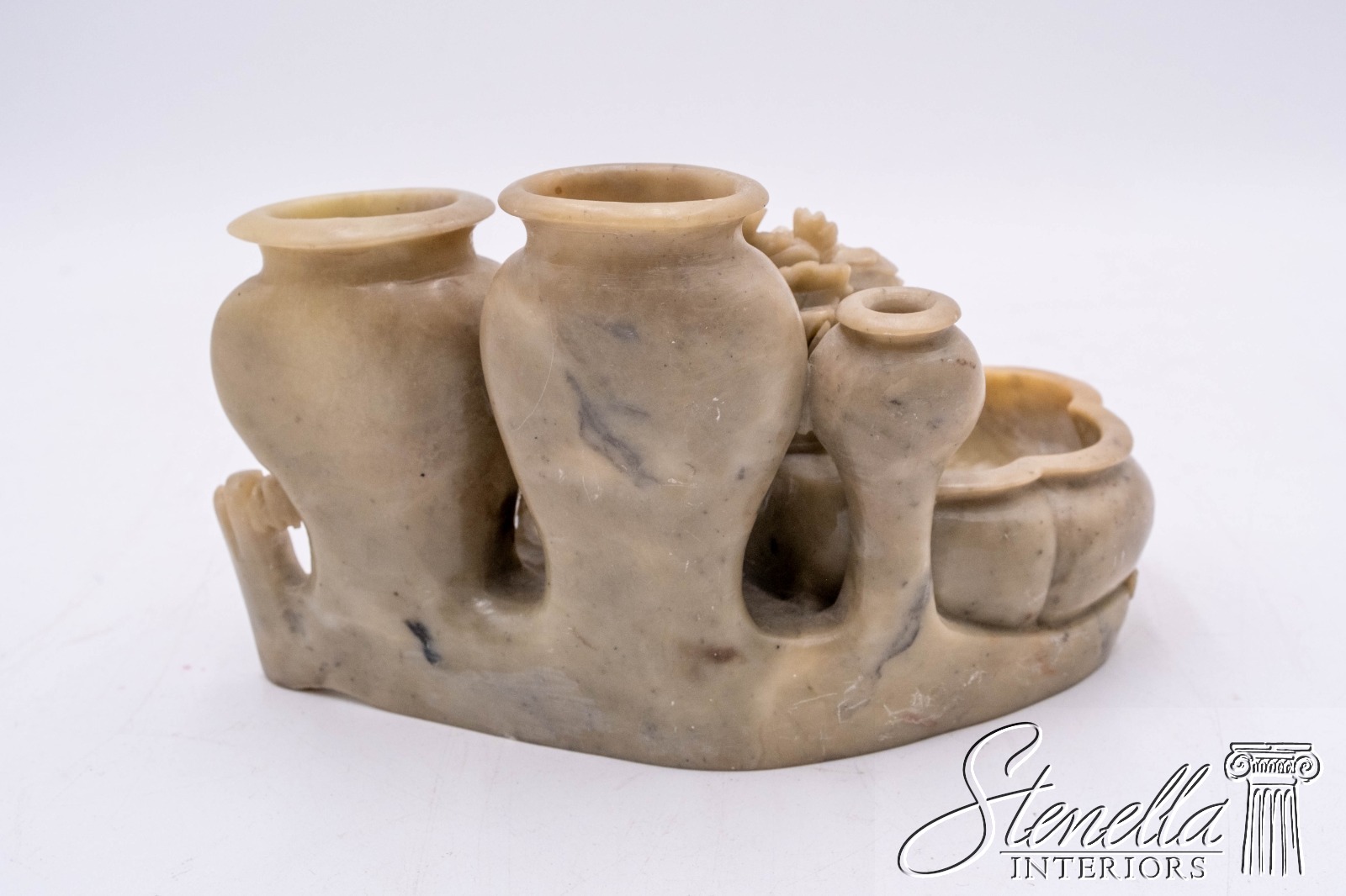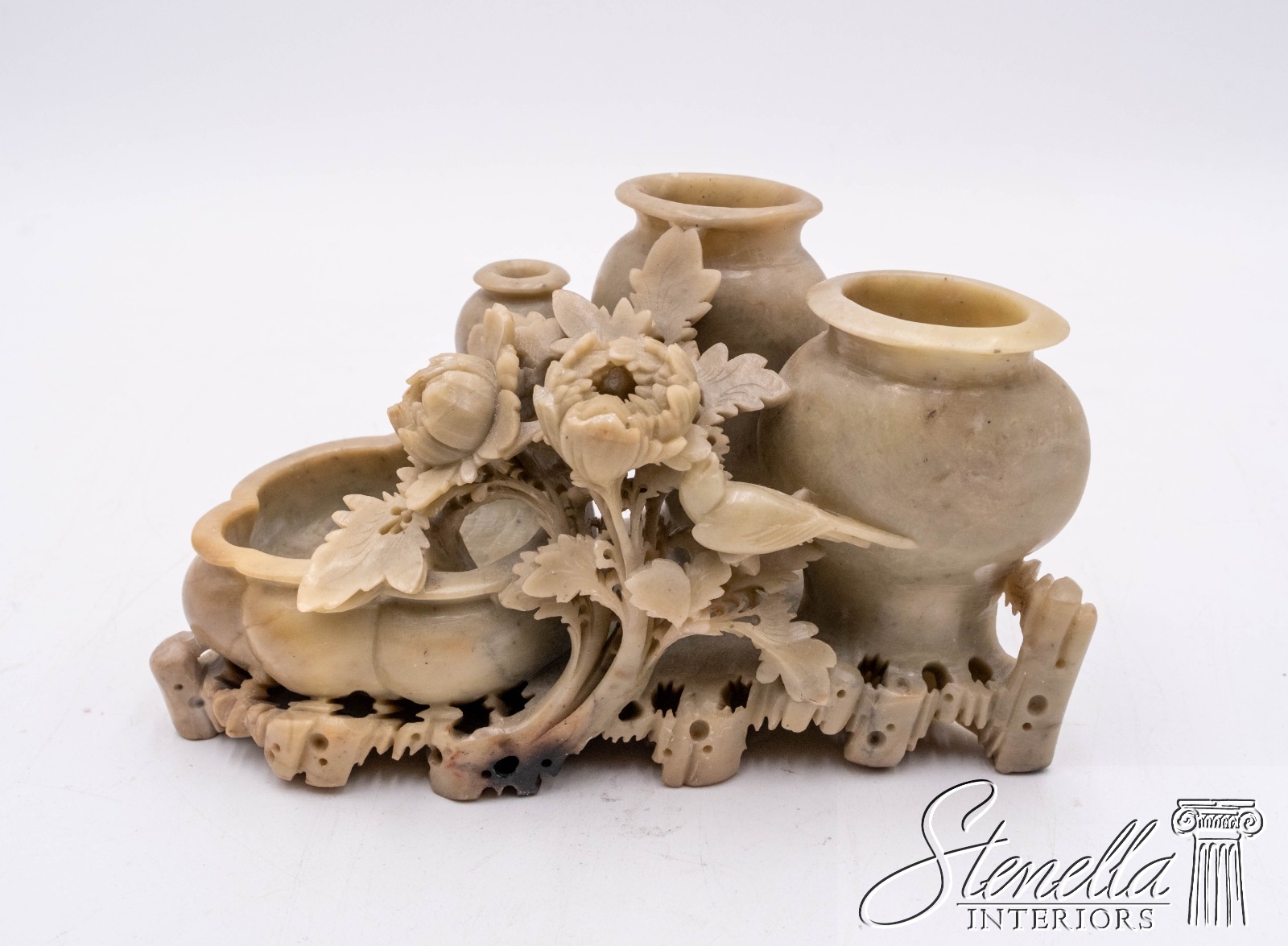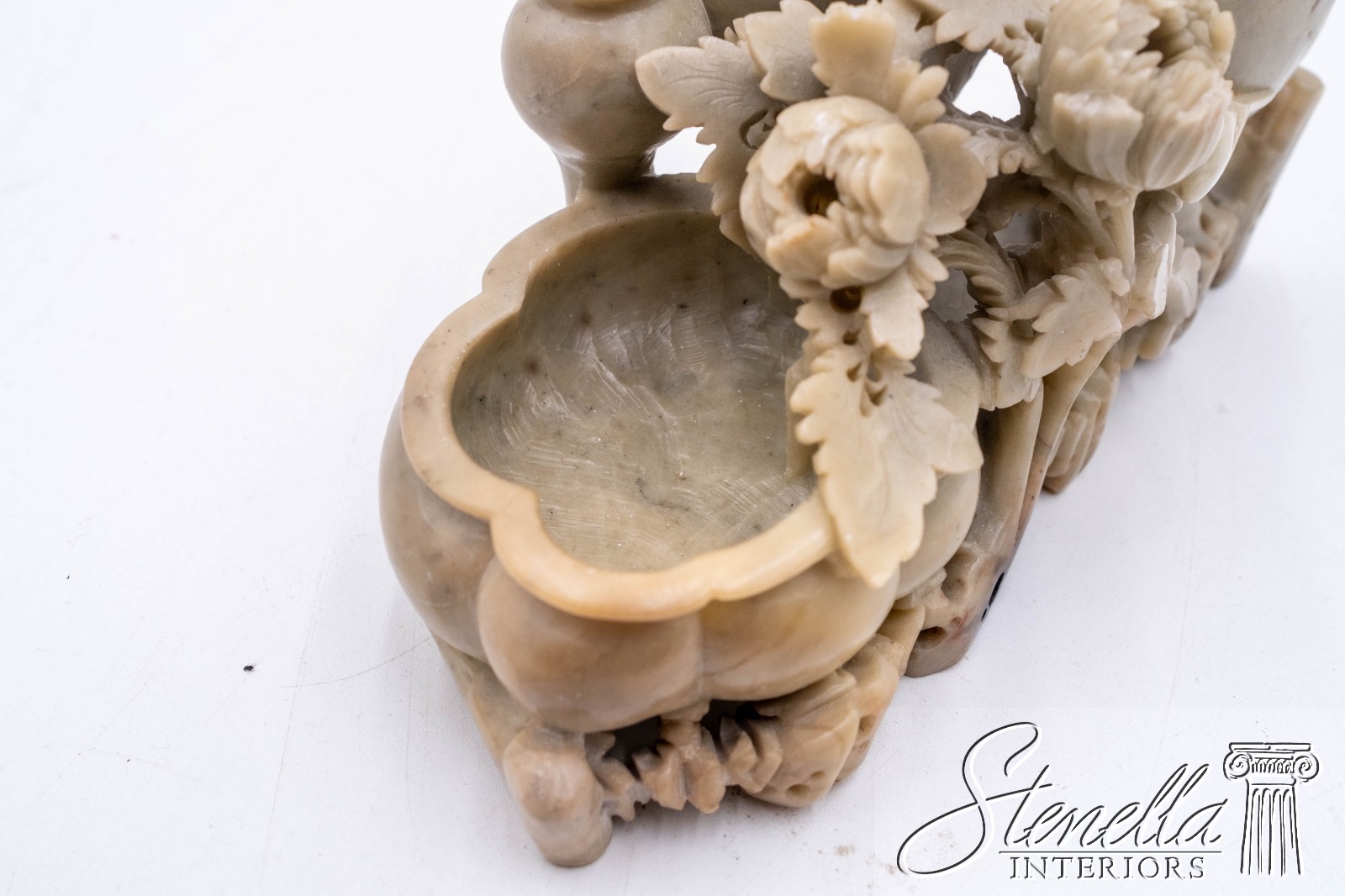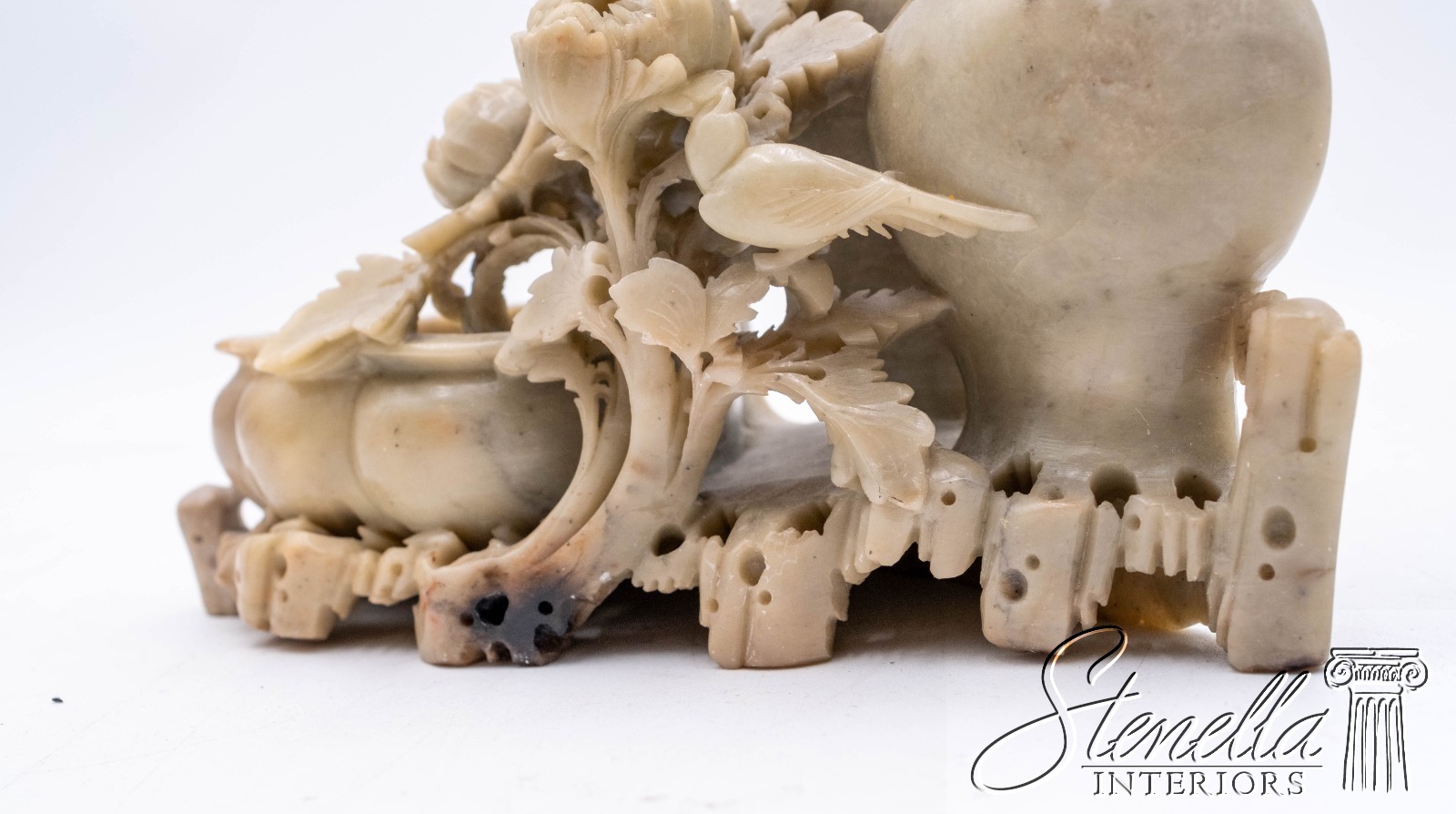 Details: Hand carved soapstone (resembles some forms of jade stone) and decorated with urns, flowers and foliage carvings. Intricate details and beautiful fine details.