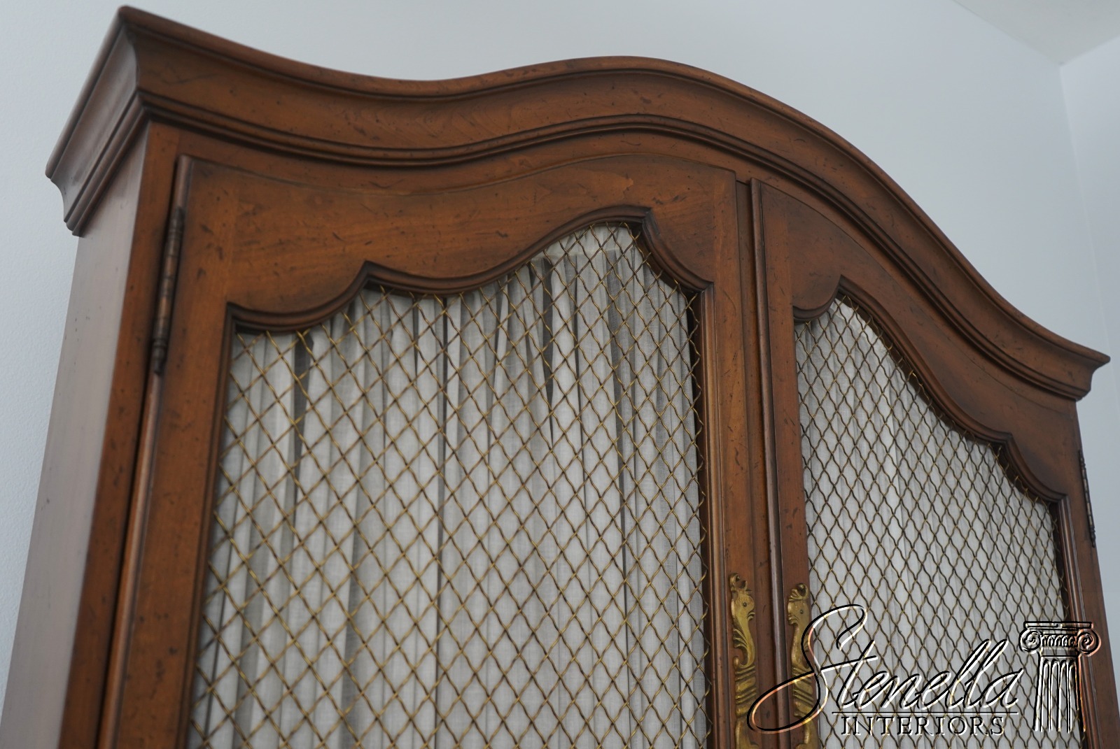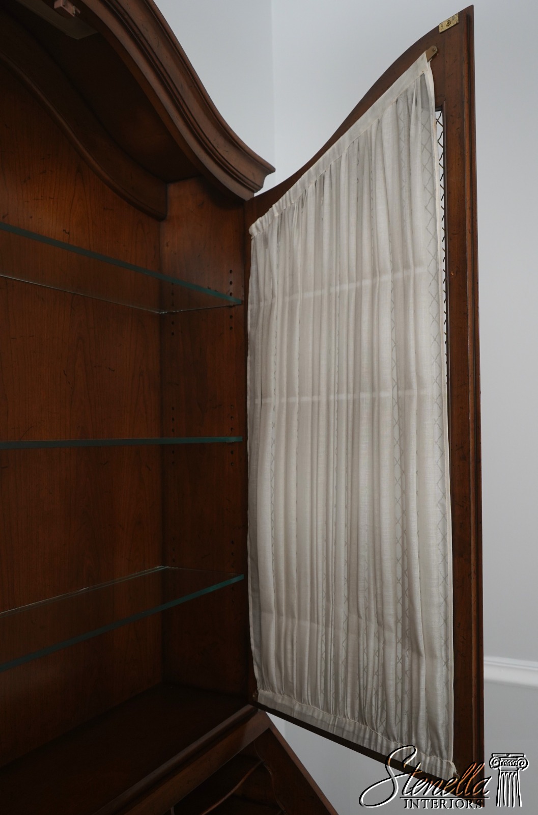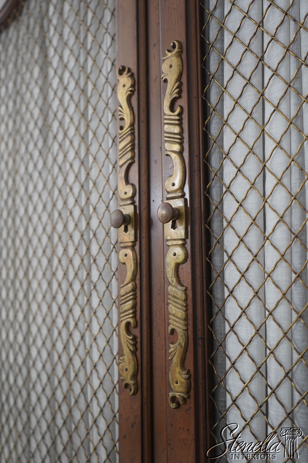 Details: Factory Distressed Glass Adjustable Shelves Dovetailed Drawer Construction High Quality Construction Lighted Interior Walnut Color Finish Wire Mesh Doors w. Curtains Leather Writing Surface Nice Fitted Interior Solid Brass Hardware