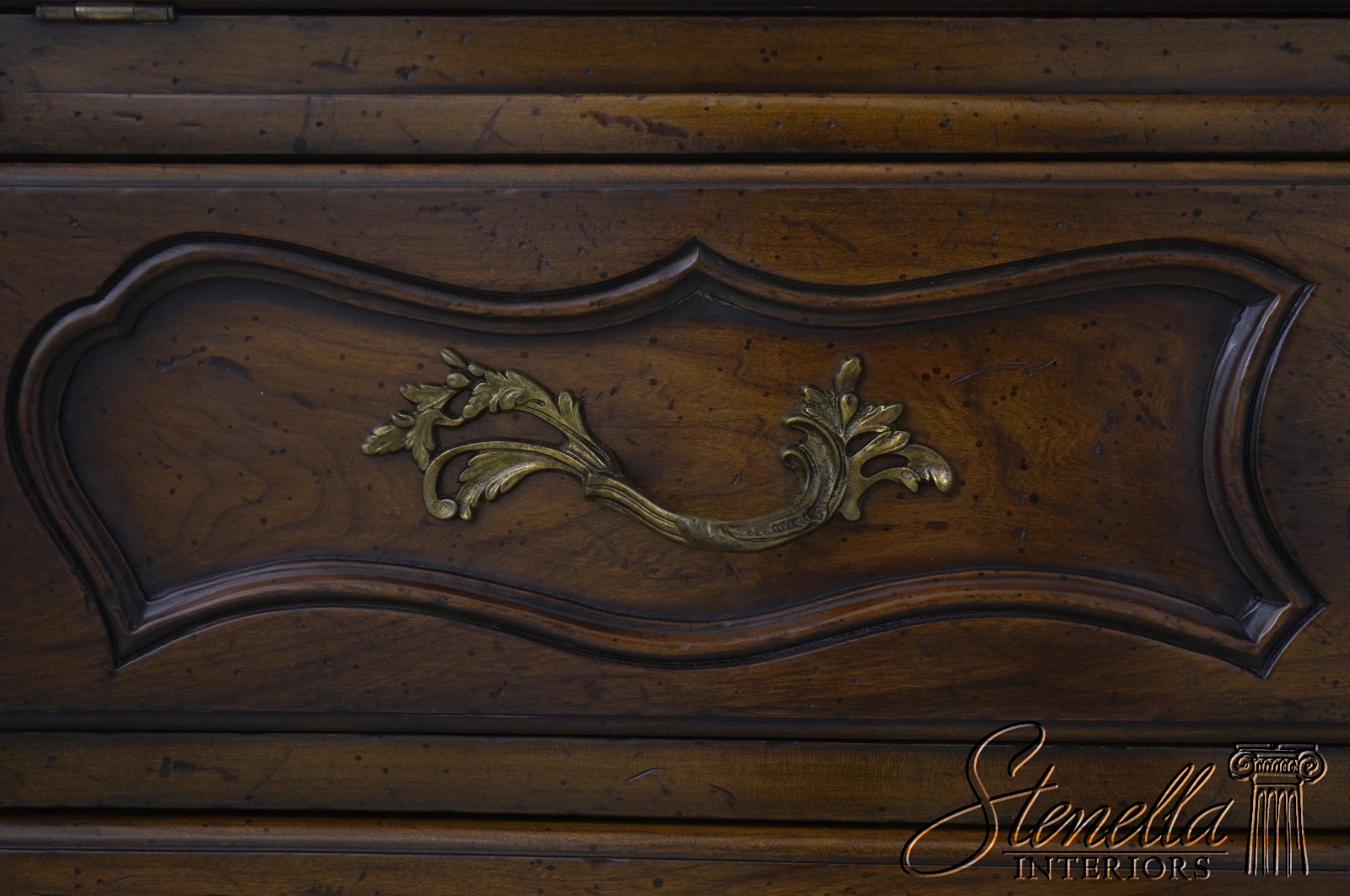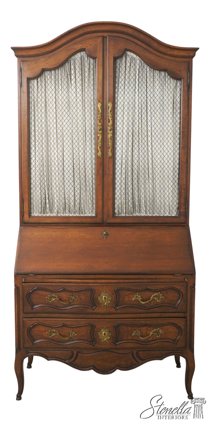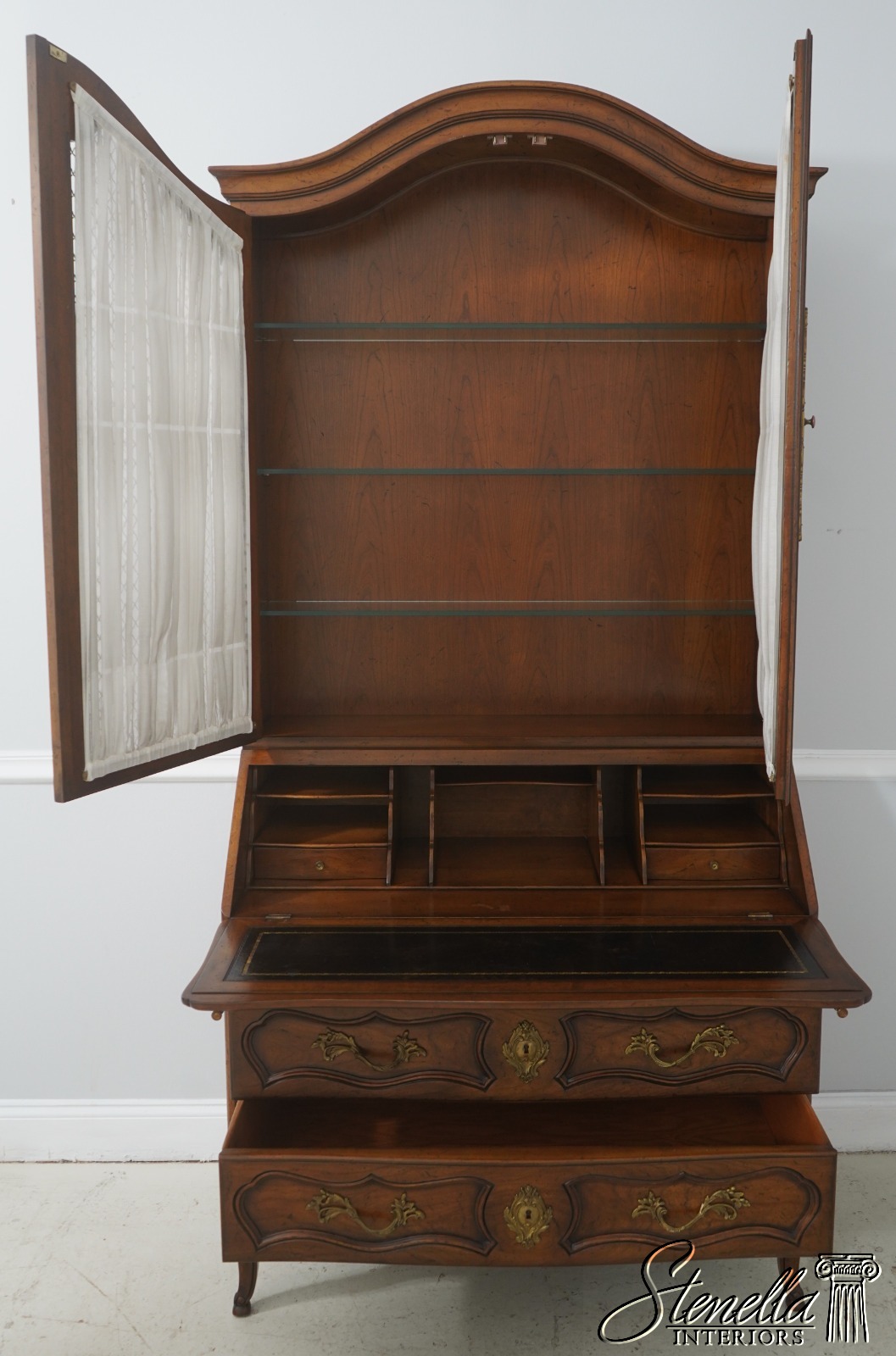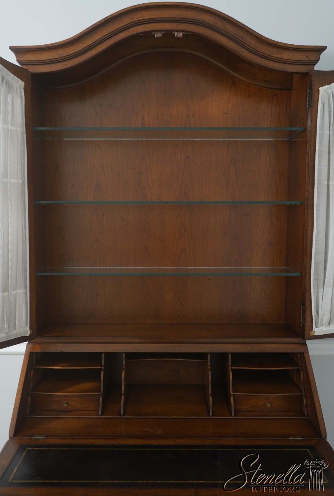 Details: Factory Distressed Glass Adjustable Shelves Dovetailed Drawer Construction High Quality Construction Lighted Interior Walnut Color Finish Wire Mesh Doors w. Curtains Leather Writing Surface Nice Fitted Interior Solid Brass Hardware