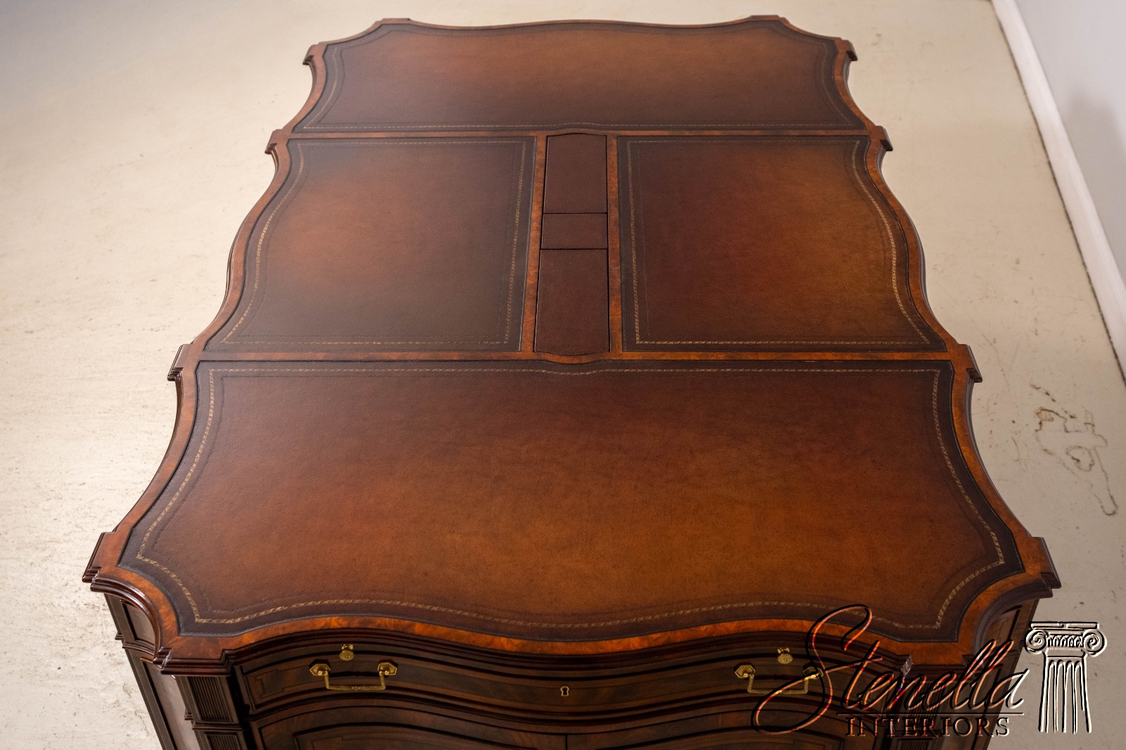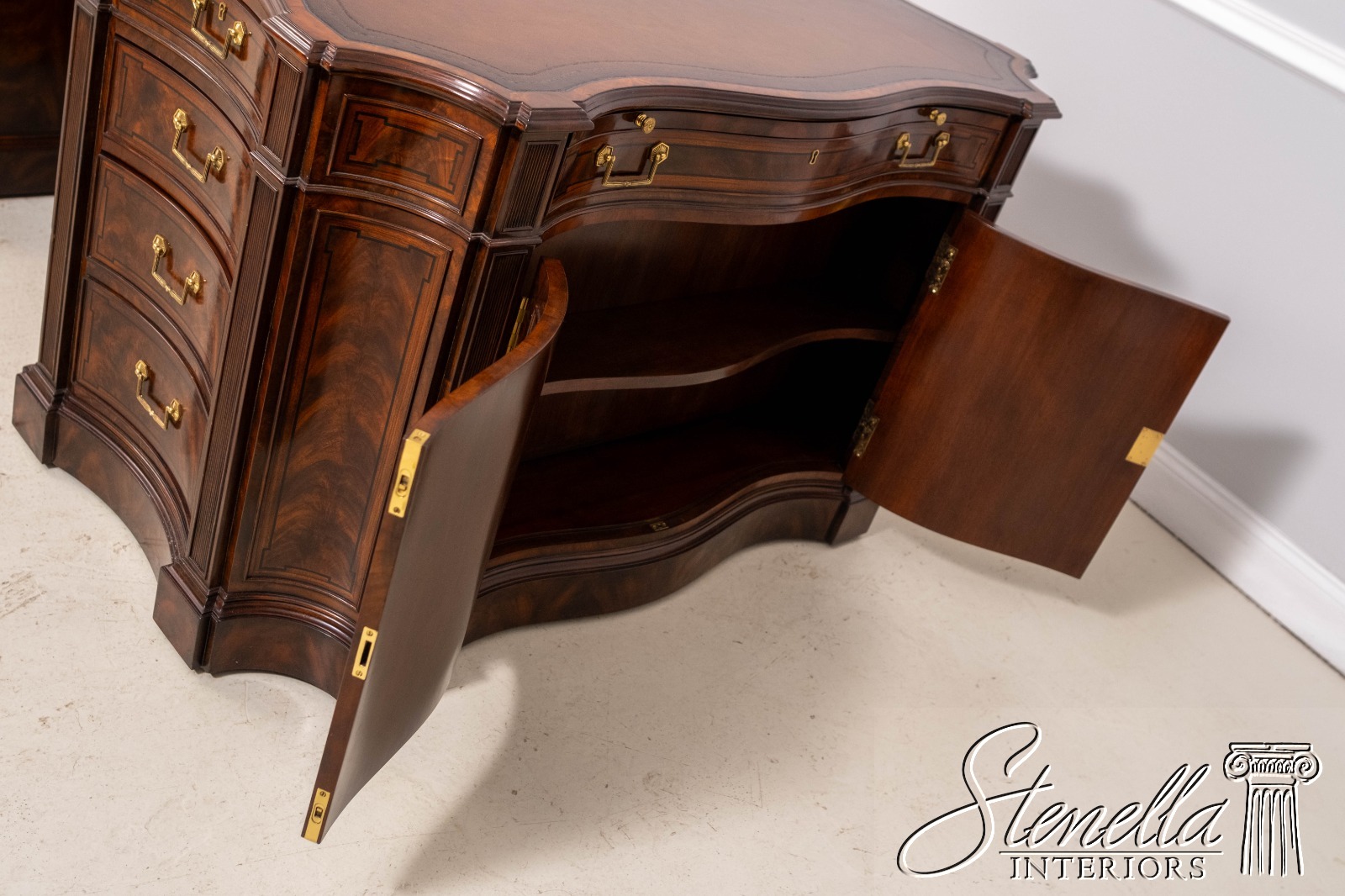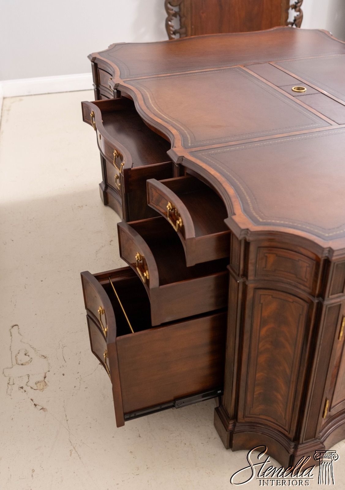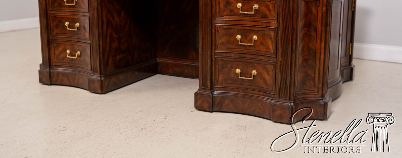 Details: English Cabinetmaker Collection Nicely Finished On All Sides Adjustable Shelves Dovetailed Drawer Construction Fine Carved Details High Quality Construction Modesty Panel Back Nice Inlay Work Throughout Large Impressive Desk English Style Traditional Style Solid Brass Hardware Quality Tooled Leather Deep File Drawer Pull Out Slides On Sides Hidden Electrical Outlets Key Locking w. Key Hanging File Drawers Cabinet Door Sides Offered @ Fraction Original Retail Cost