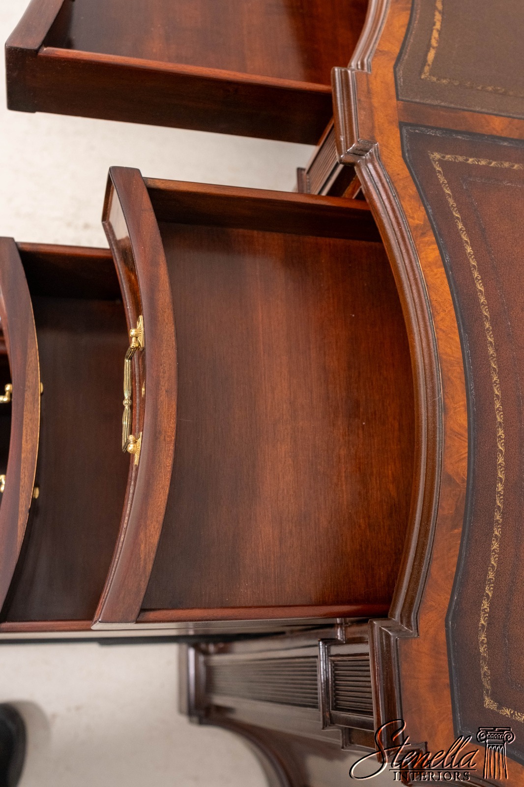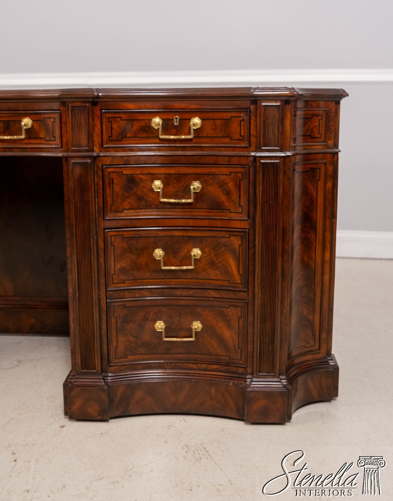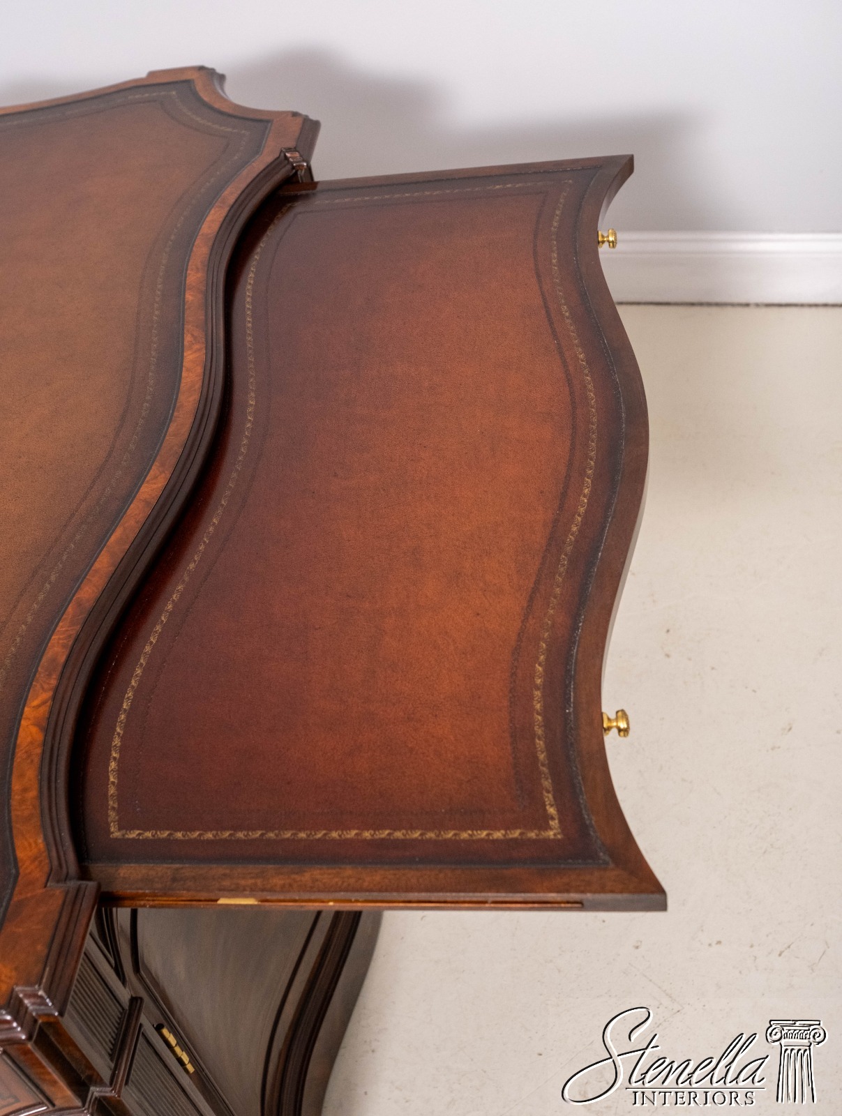 Details: English Cabinetmaker Collection Nicely Finished On All Sides Adjustable Shelves Dovetailed Drawer Construction Fine Carved Details High Quality Construction Modesty Panel Back Nice Inlay Work Throughout Large Impressive Desk English Style Traditional Style Solid Brass Hardware Quality Tooled Leather Deep File Drawer Pull Out Slides On Sides Hidden Electrical Outlets Key Locking w. Key Hanging File Drawers Cabinet Door Sides Offered @ Fraction Original Retail Cost