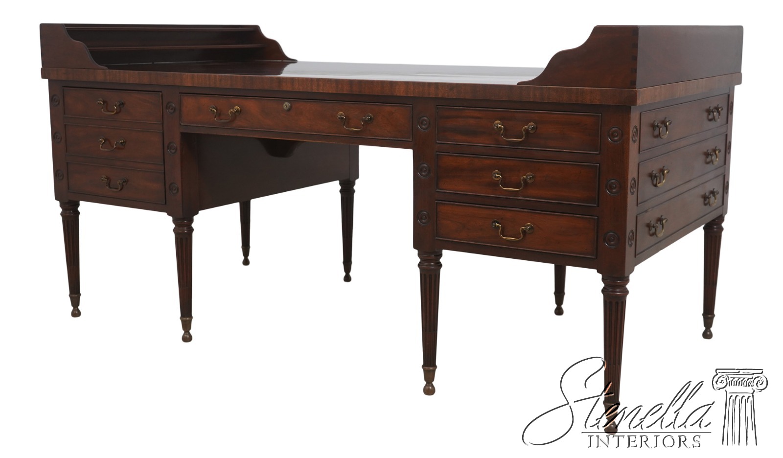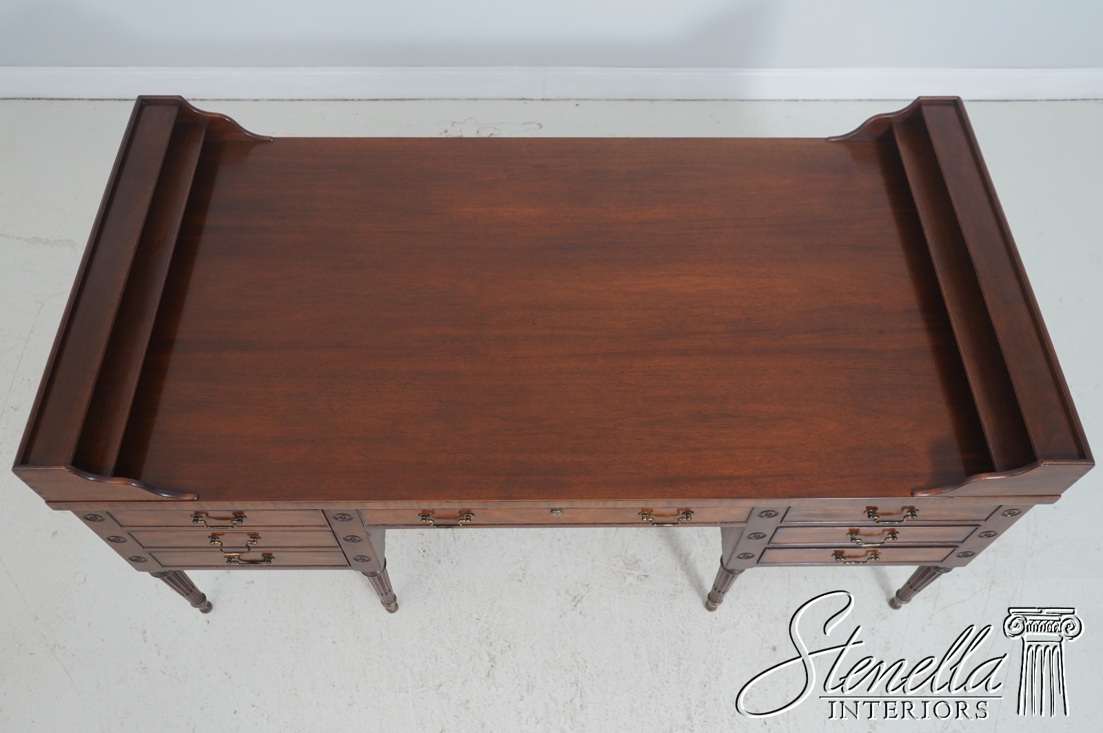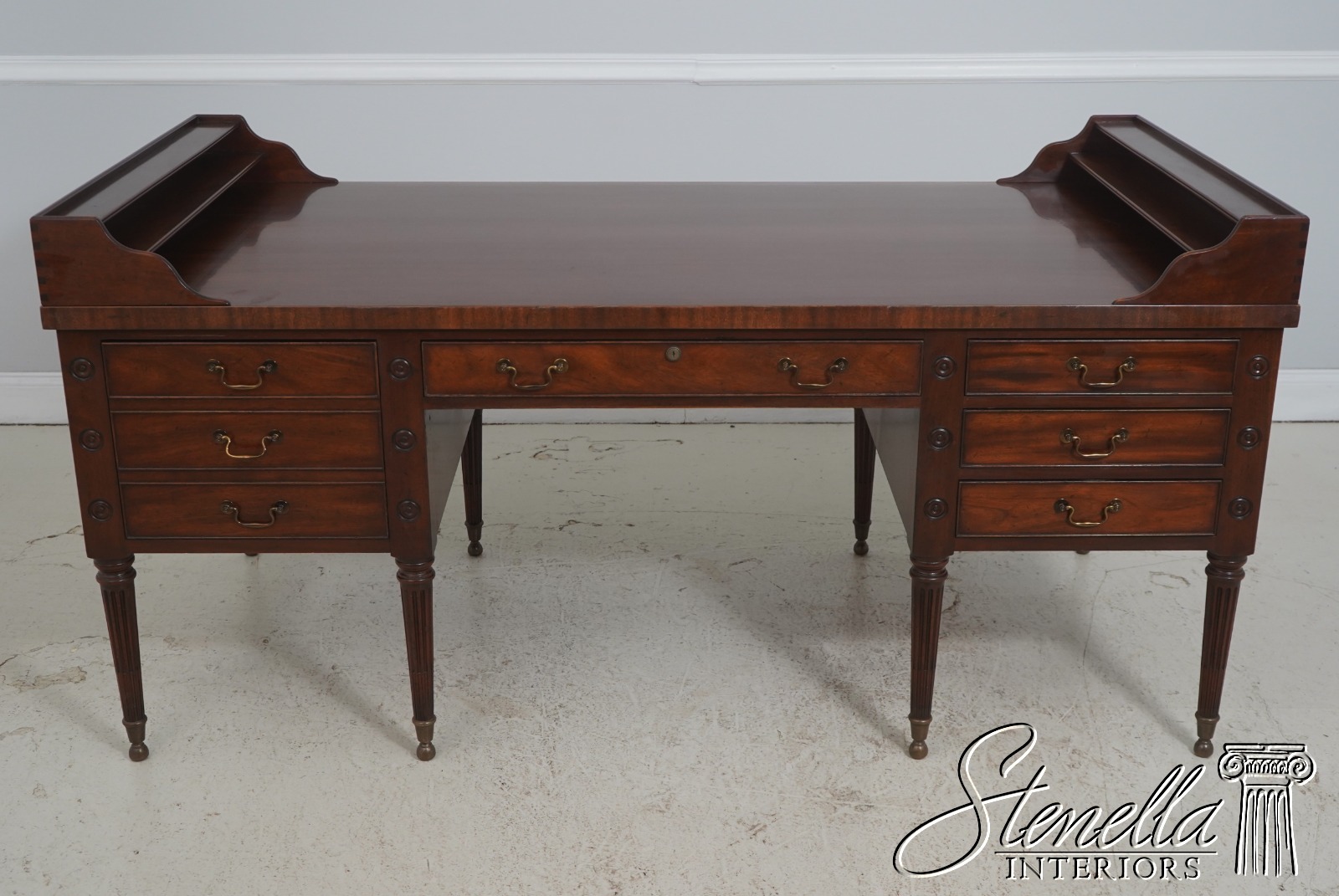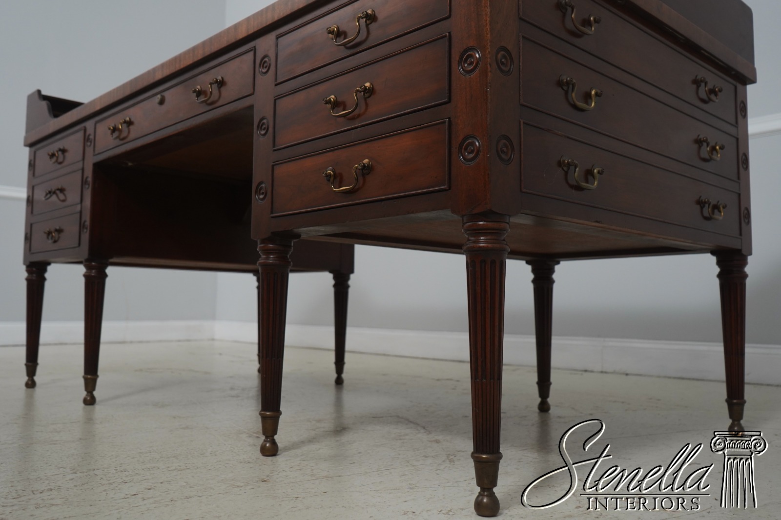 Details: Dovetailed Drawer Construction High Quality Construction Shelf Sides Large Impressive Desk Traditional Style Professionally Restored & Refinished Brass Capped Feet Nicely Finished On All Sides Exceptional Finish Offered @ Fraction Original Retail Cost