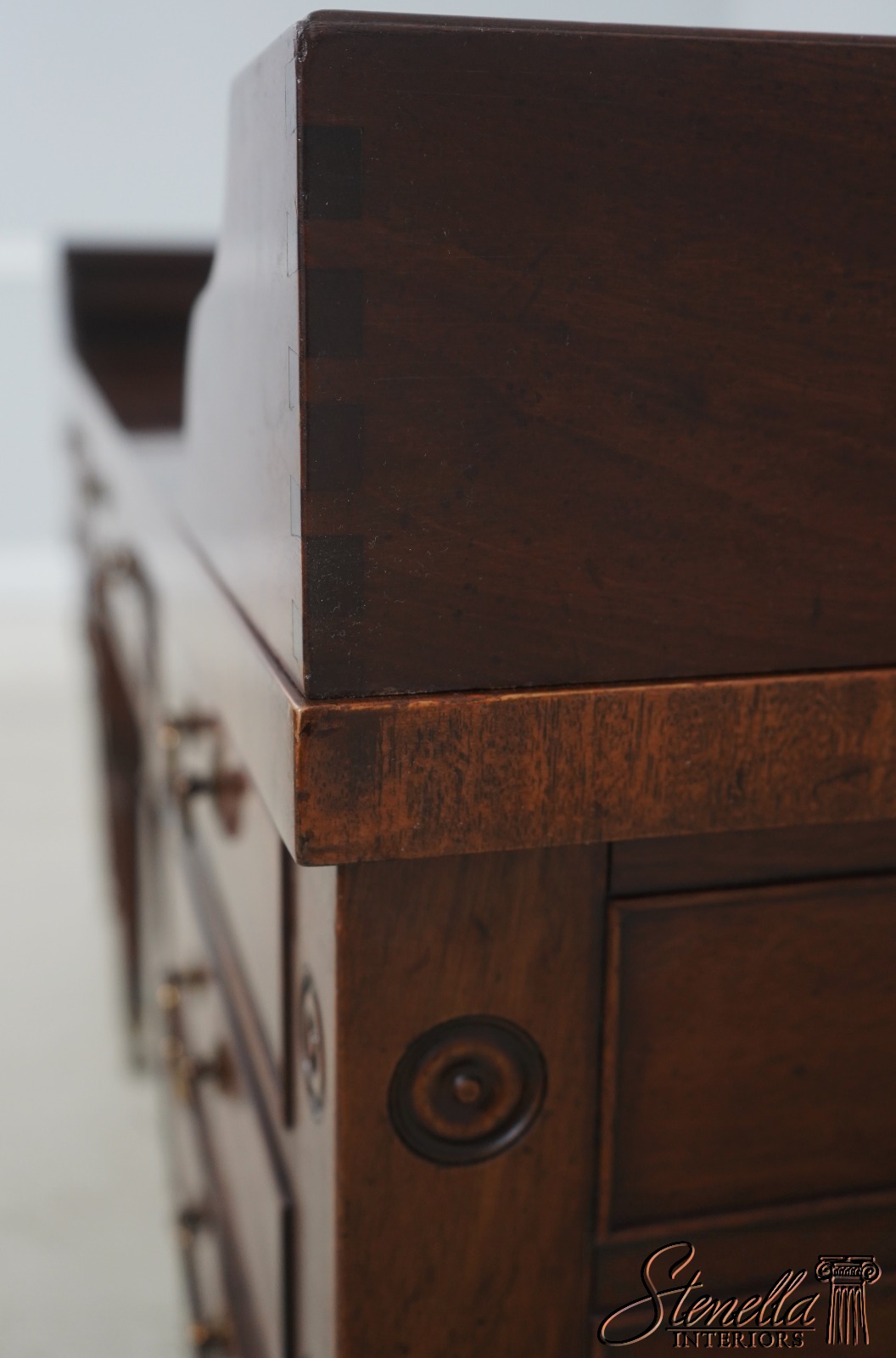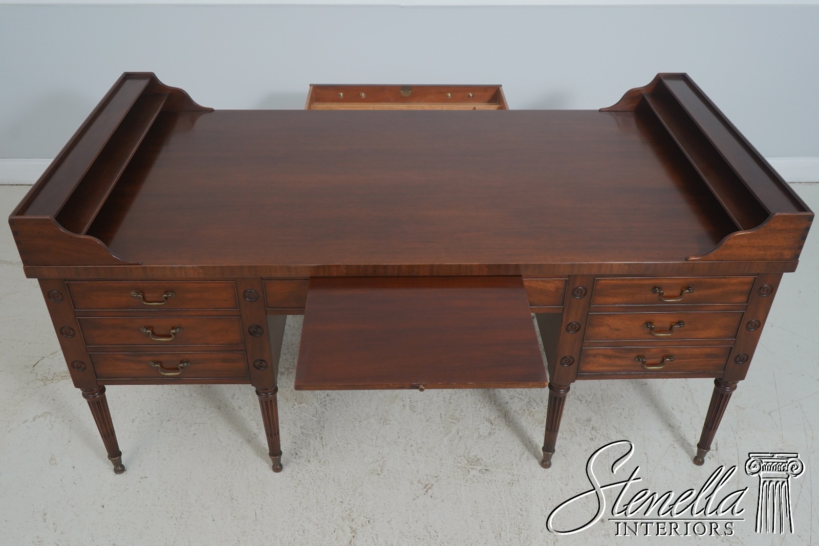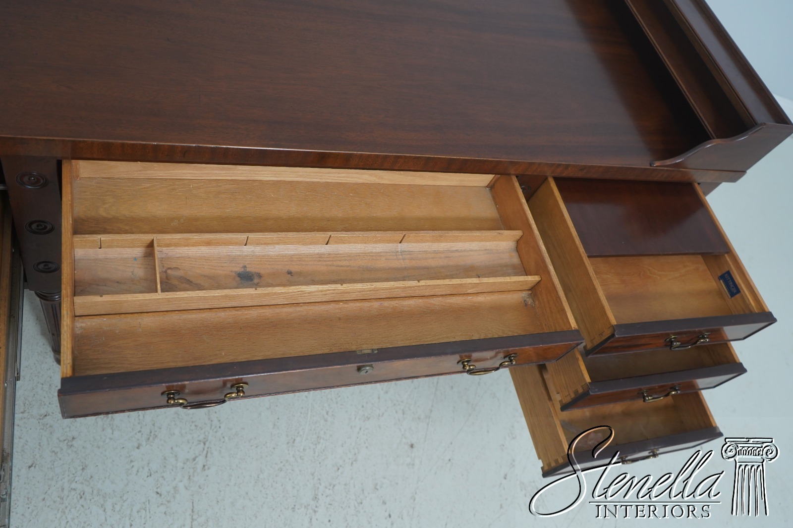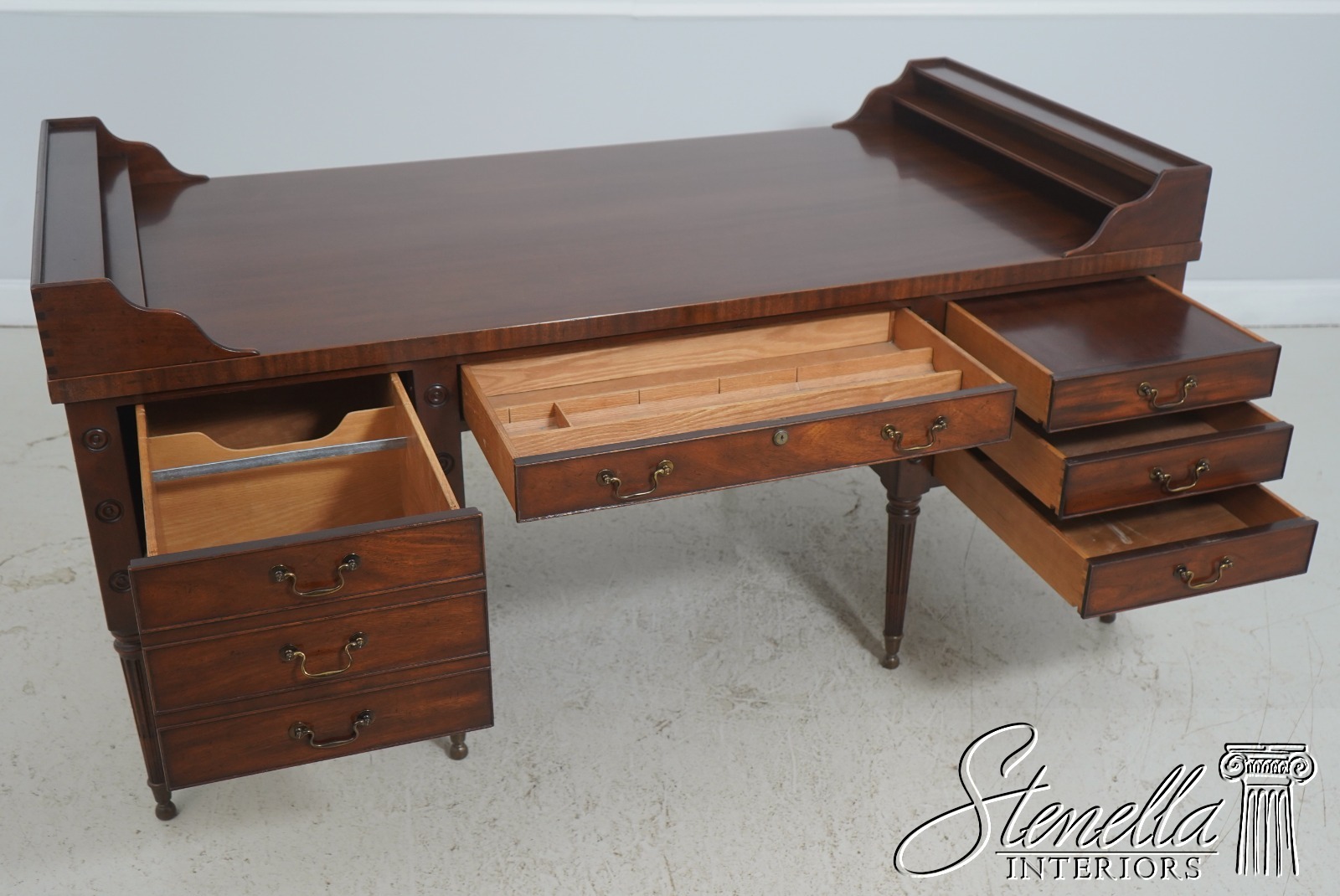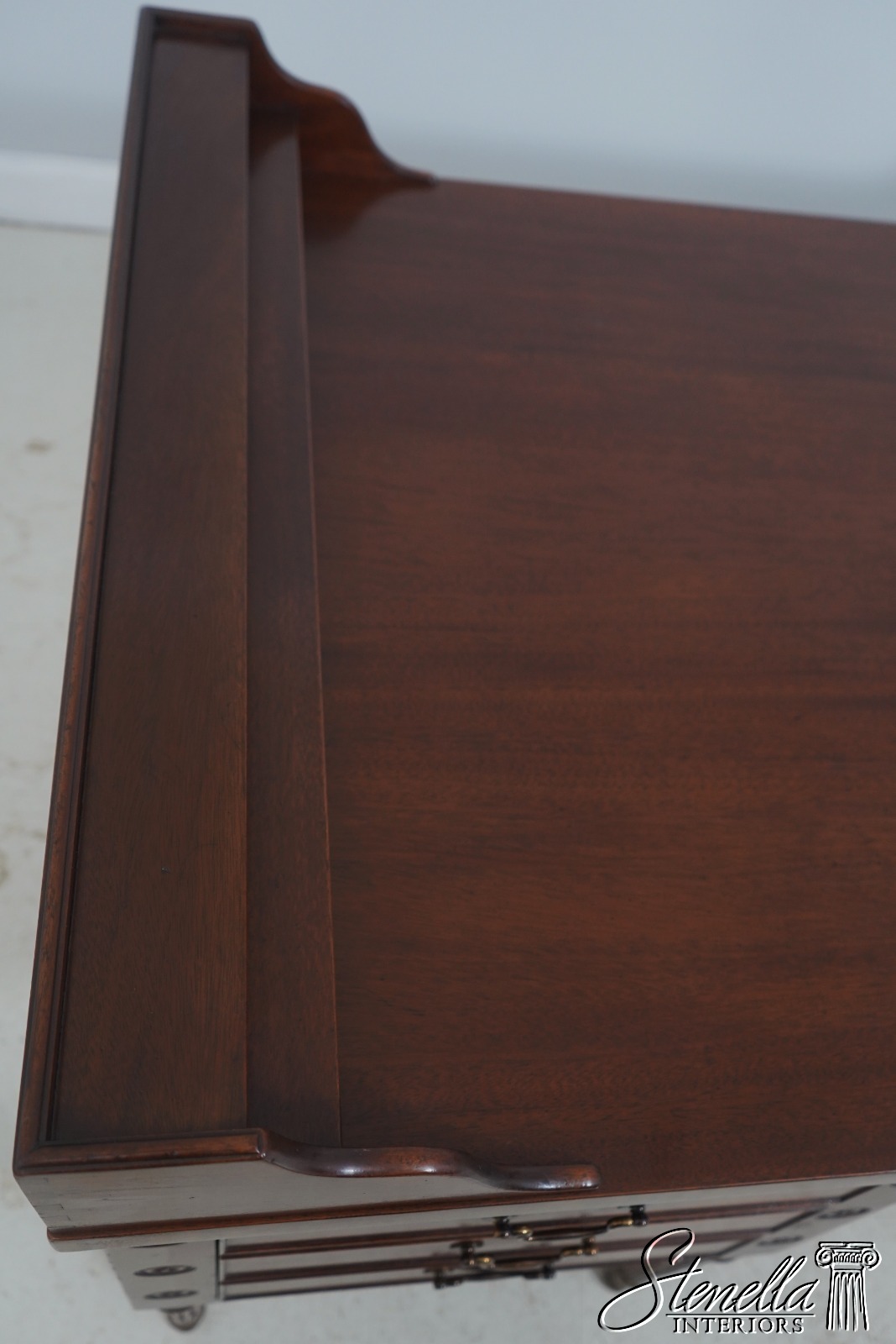 Details: Dovetailed Drawer Construction High Quality Construction Shelf Sides Large Impressive Desk Traditional Style Professionally Restored & Refinished Brass Capped Feet Nicely Finished On All Sides Exceptional Finish Offered @ Fraction Original Retail Cost