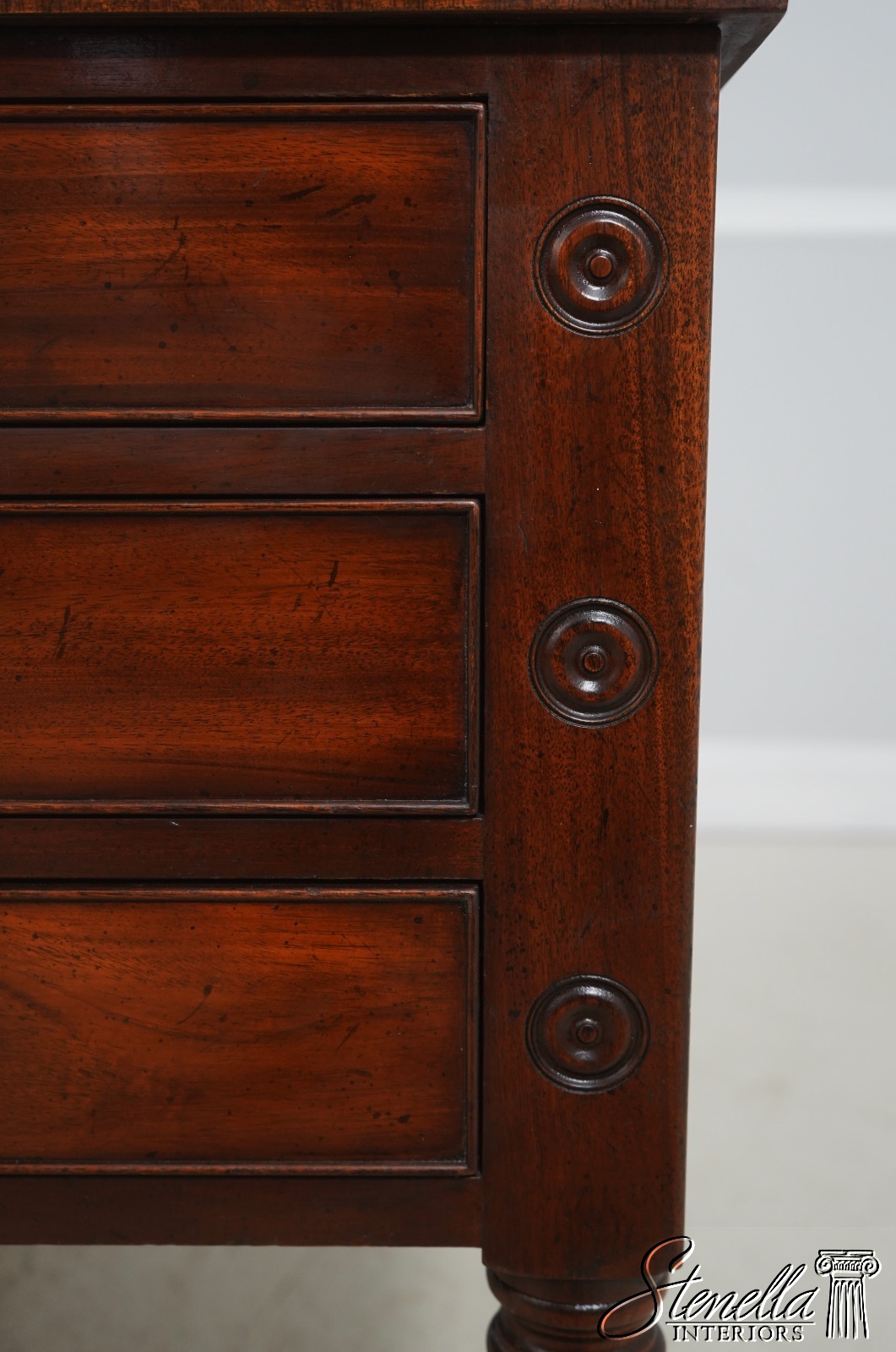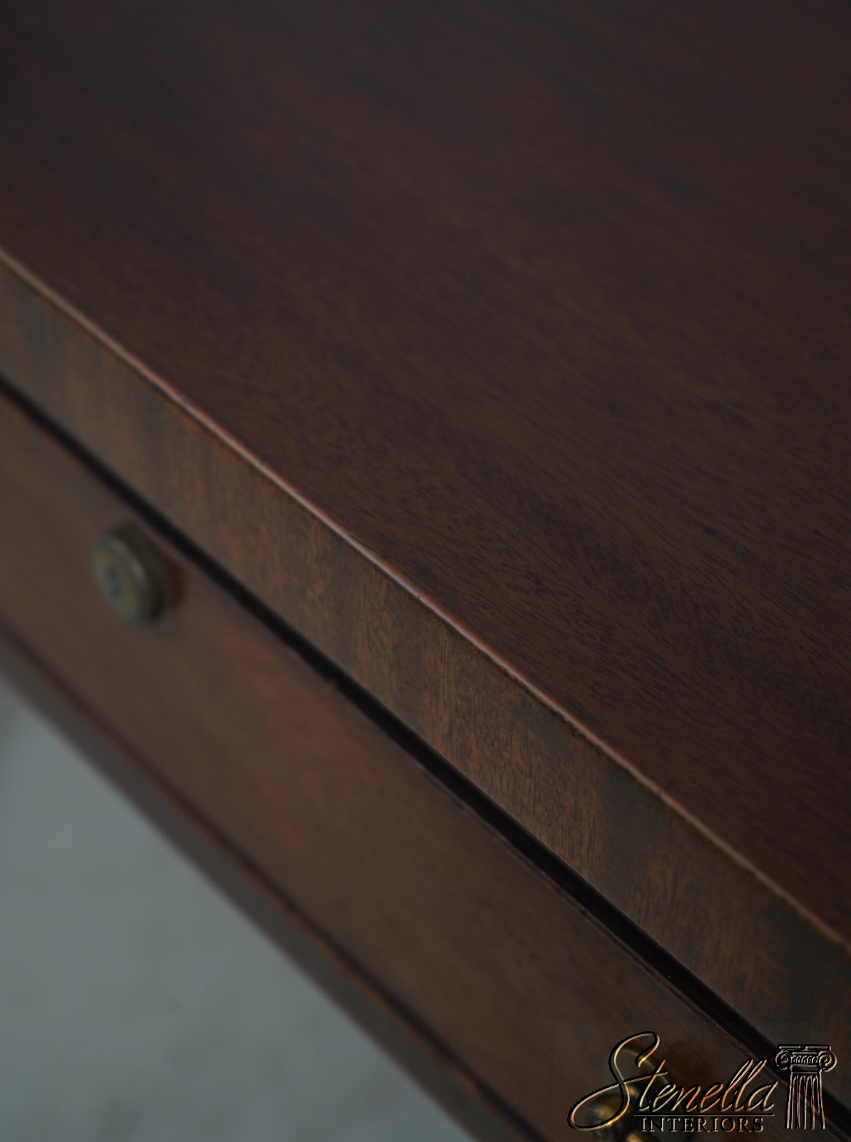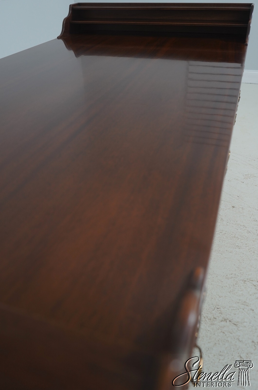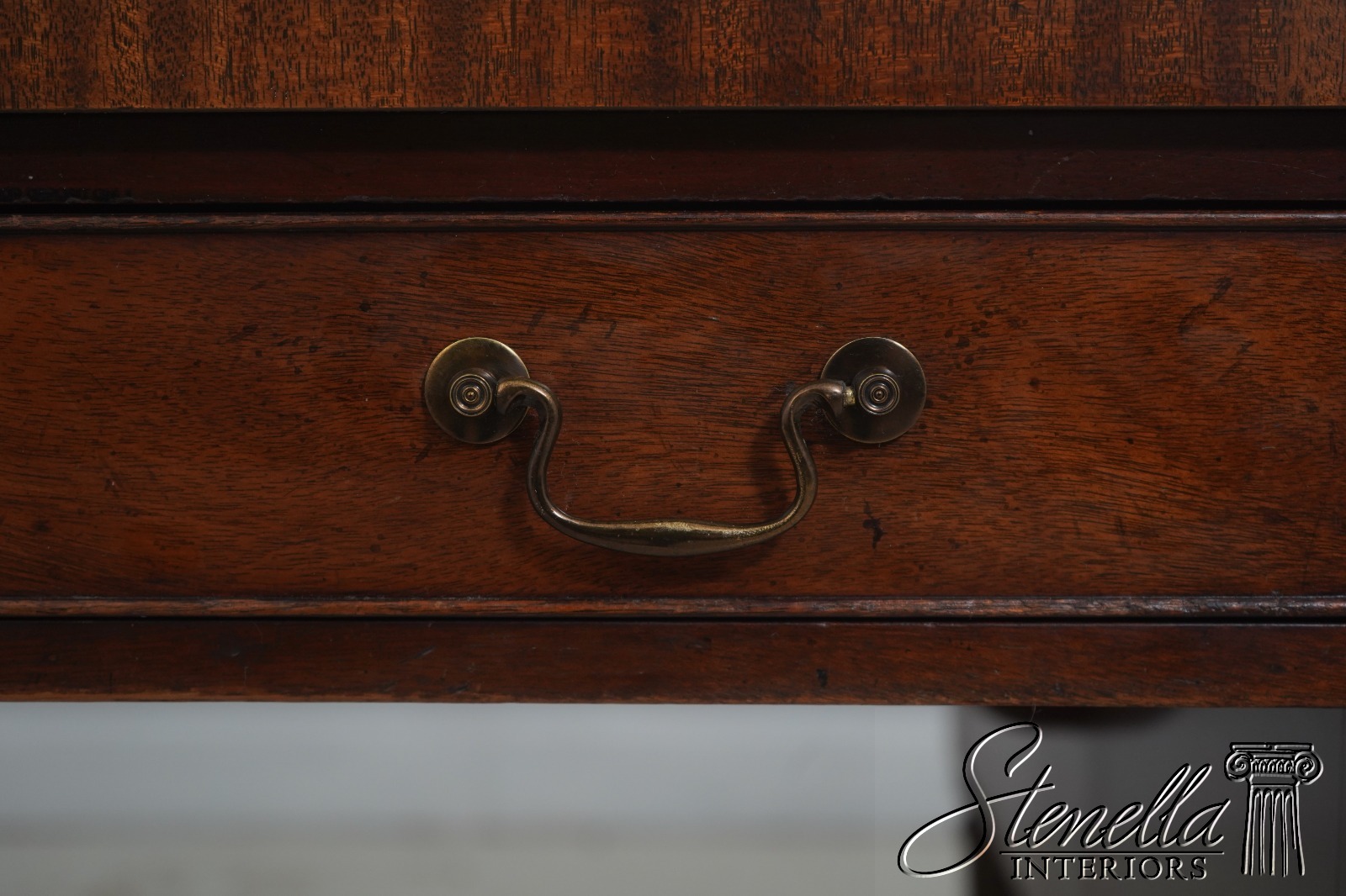 Details: Dovetailed Drawer Construction High Quality Construction Shelf Sides Large Impressive Desk Traditional Style Professionally Restored & Refinished Brass Capped Feet Nicely Finished On All Sides Exceptional Finish Offered @ Fraction Original Retail Cost