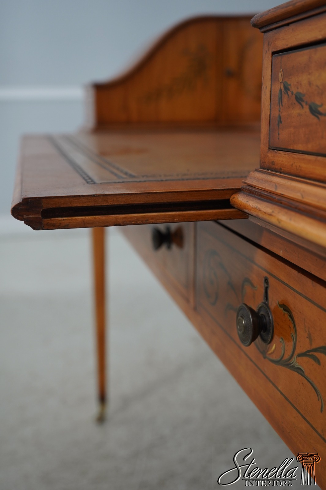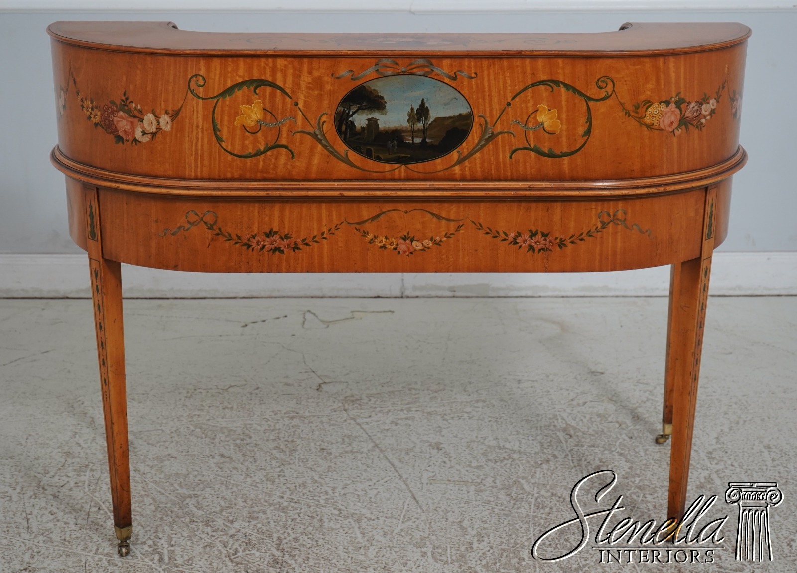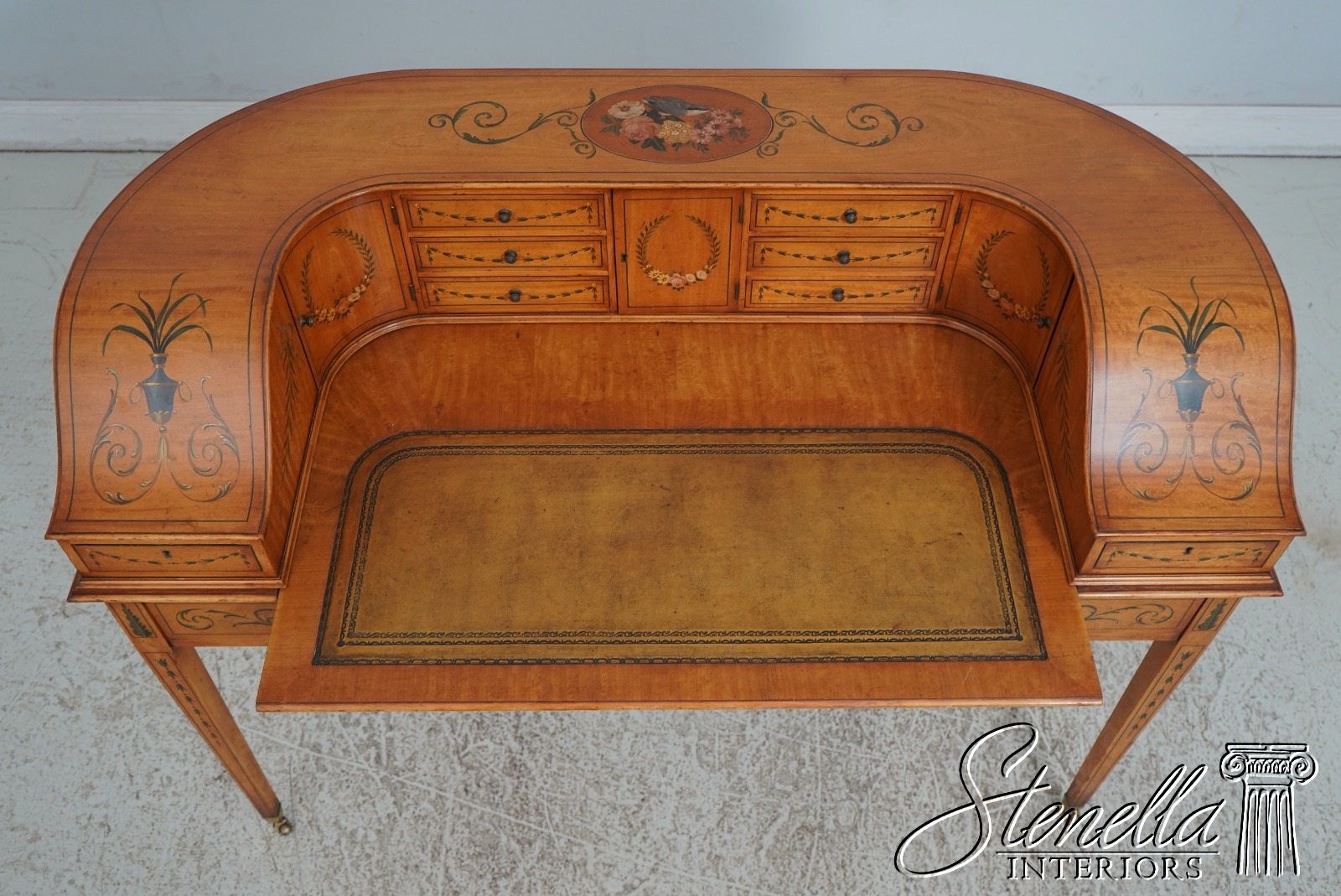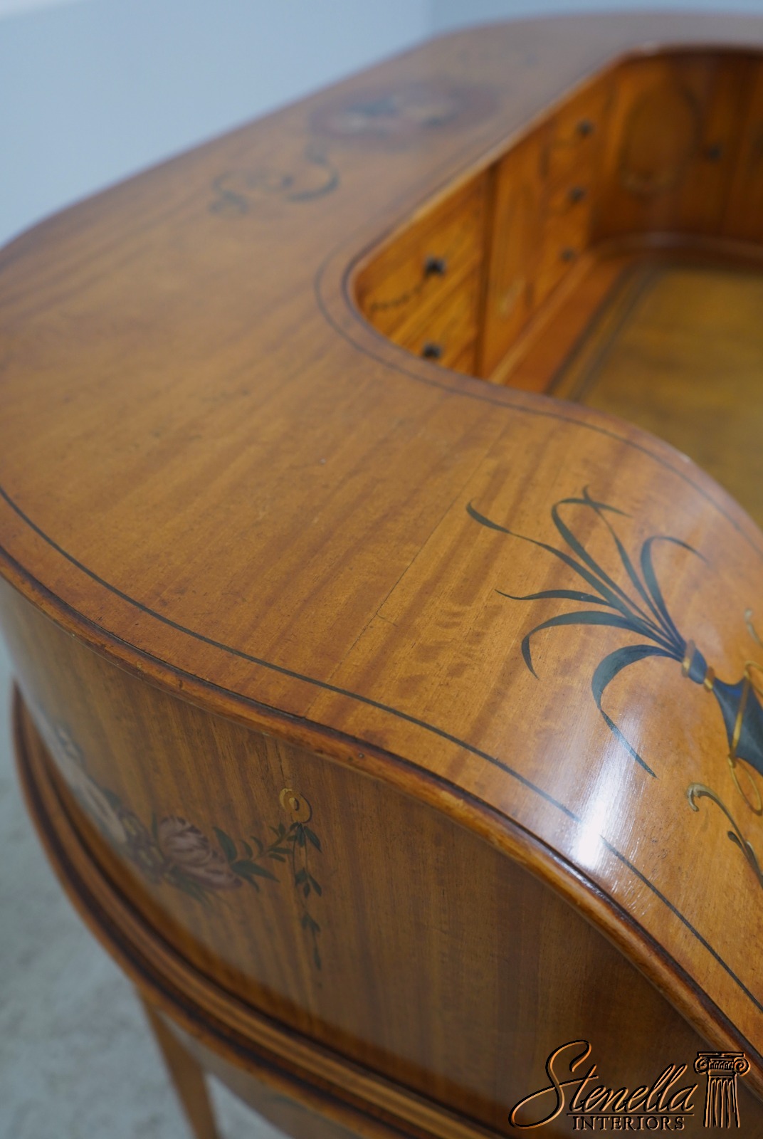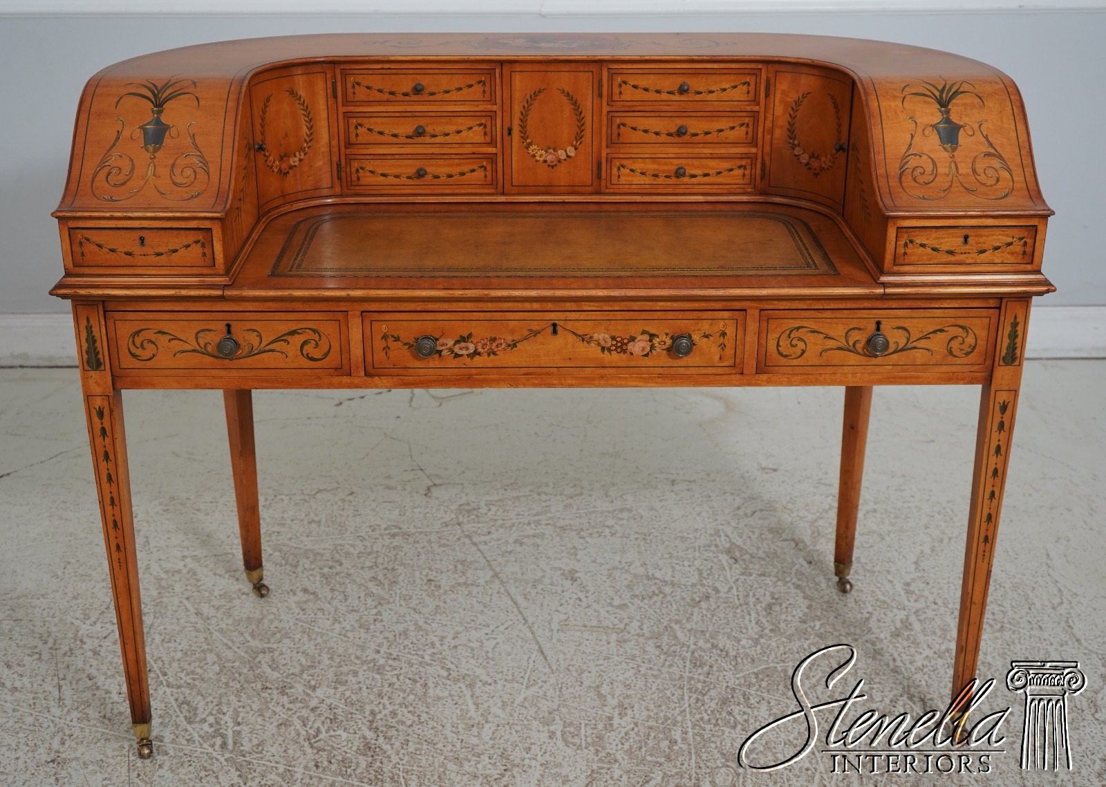 Details: Carlton House Style Desk Bell Flower Painted Legs Quality Tooled Leather Writing Surface Hand Dovetailed Drawer Construction High Quality Construction Nicely Finished On All Sides Stunning Hand Painted Decorated Details On Satinwood A.Lewis & Sons English Locks
