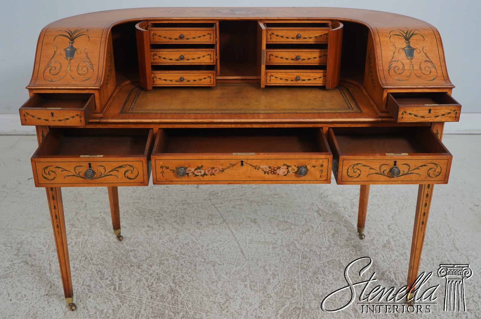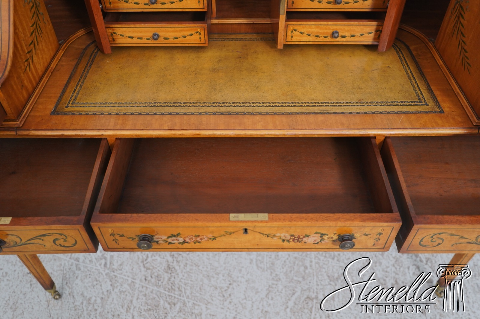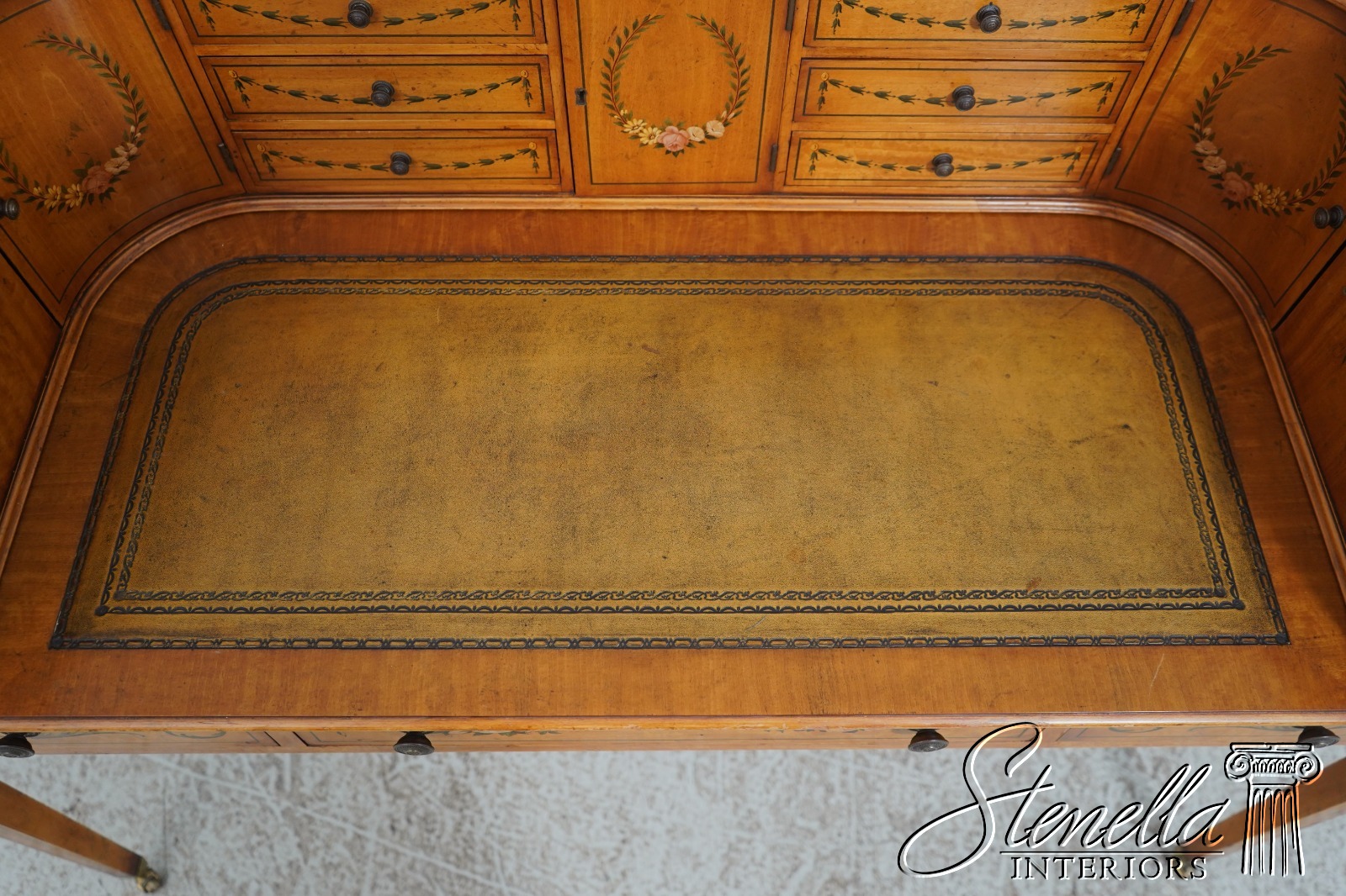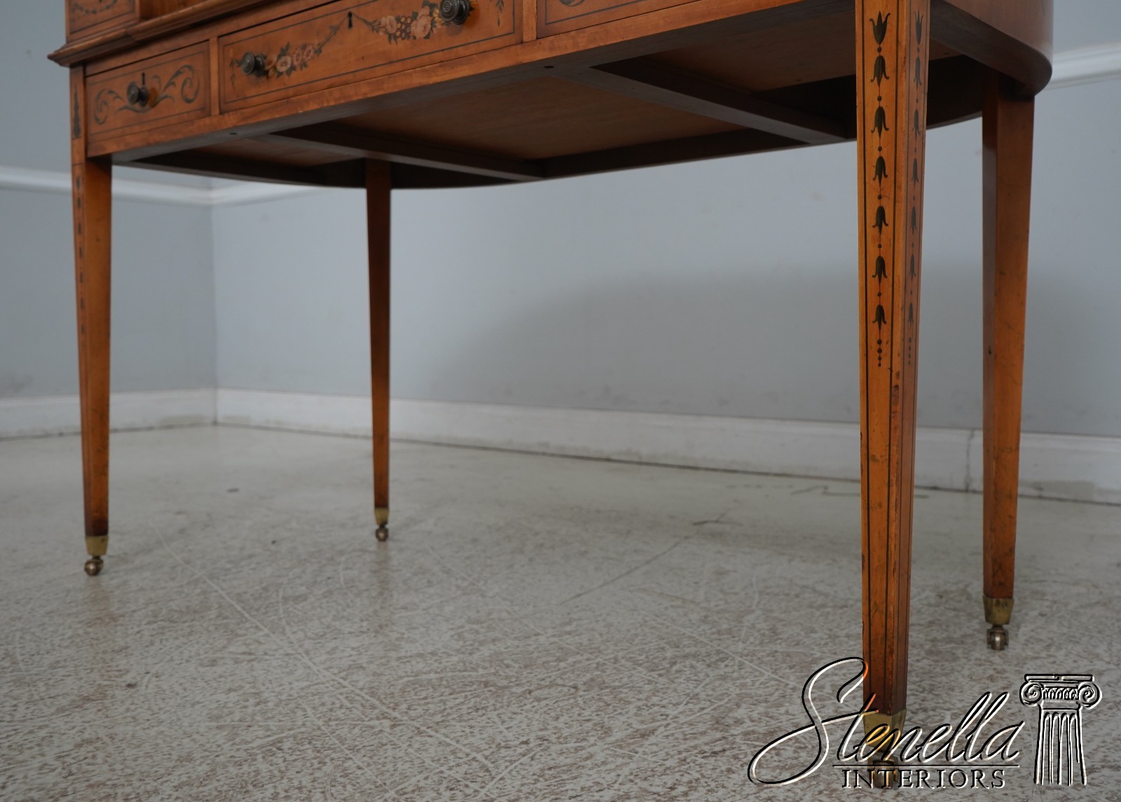 Details: Carlton House Style Desk Bell Flower Painted Legs Quality Tooled Leather Writing Surface Hand Dovetailed Drawer Construction High Quality Construction Nicely Finished On All Sides Stunning Hand Painted Decorated Details On Satinwood A.Lewis & Sons English Locks