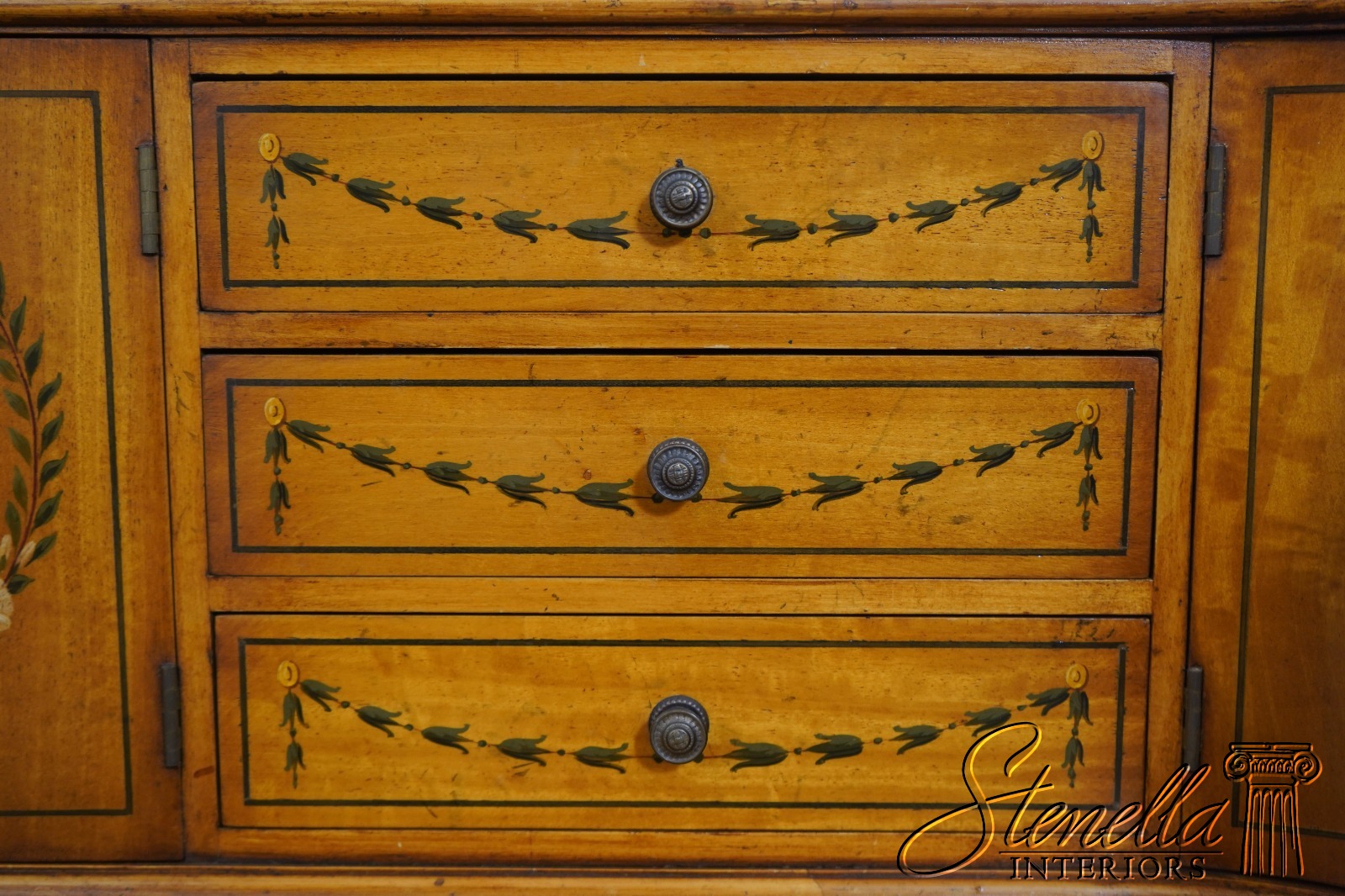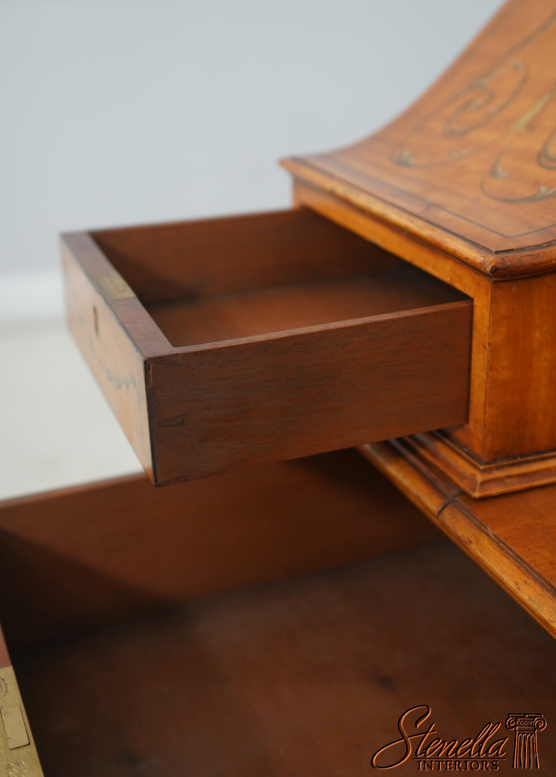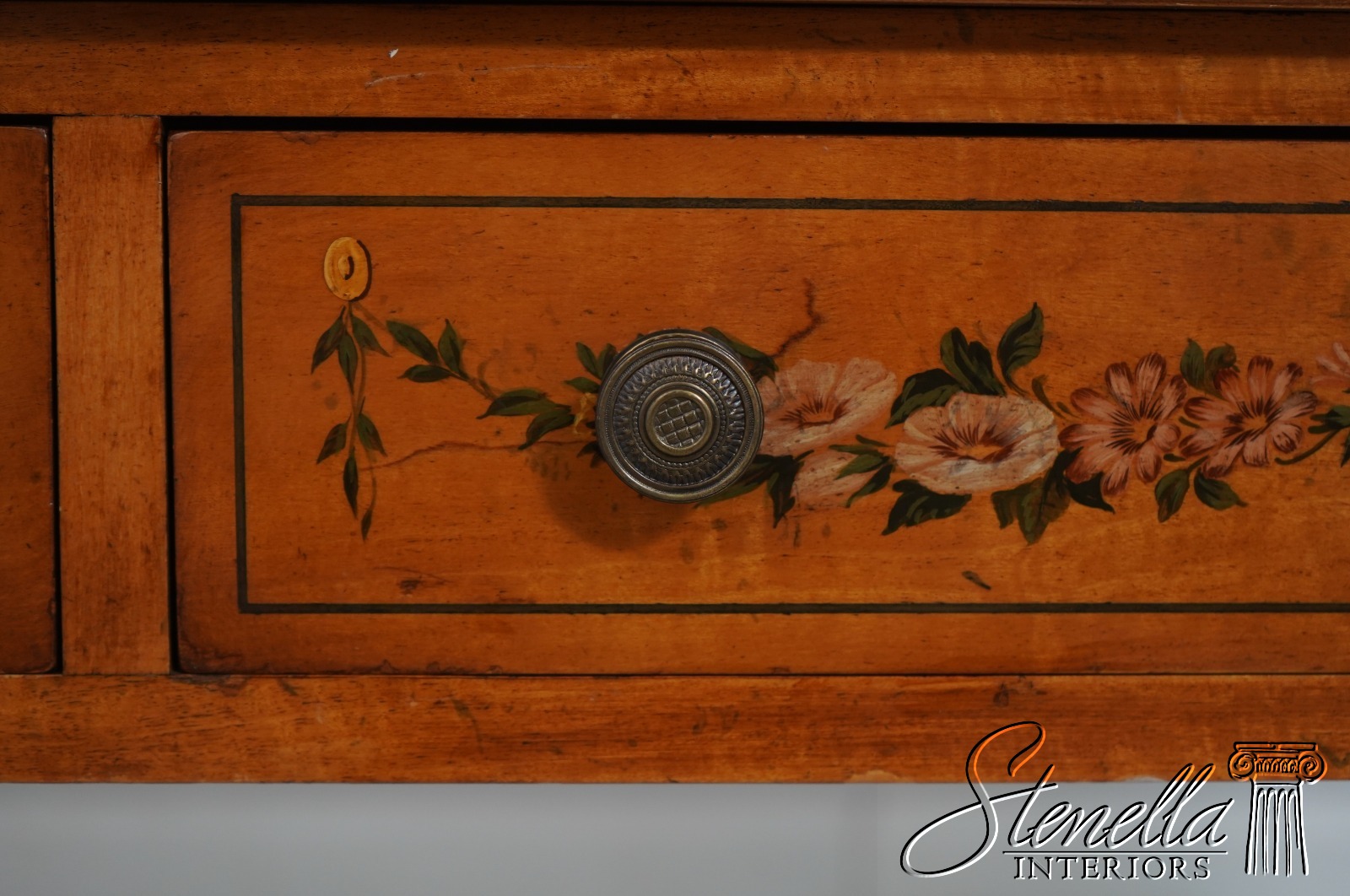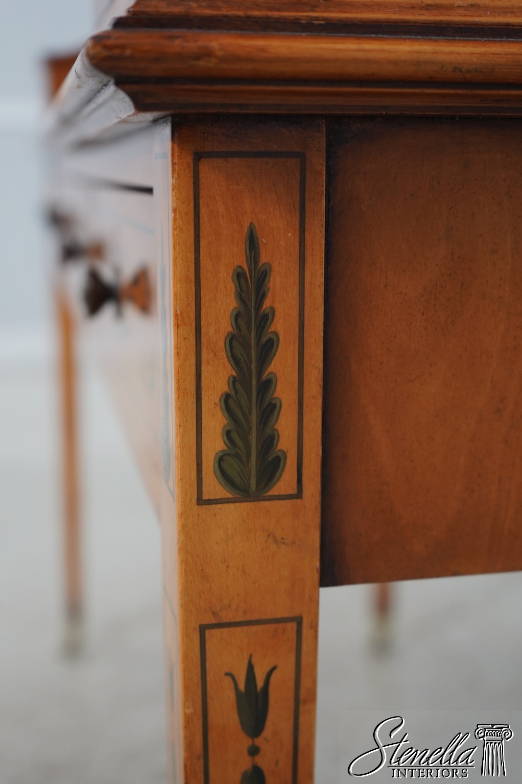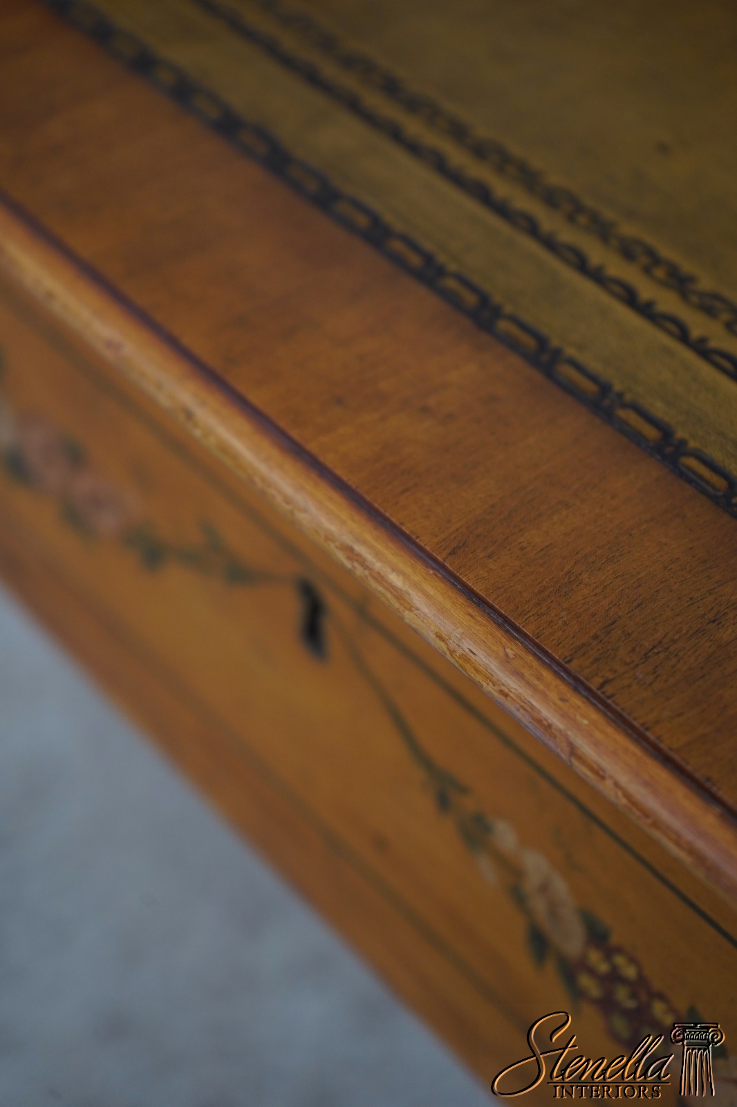 Details: Carlton House Style Desk Bell Flower Painted Legs Quality Tooled Leather Writing Surface Hand Dovetailed Drawer Construction High Quality Construction Nicely Finished On All Sides Stunning Hand Painted Decorated Details On Satinwood A.Lewis & Sons English Locks