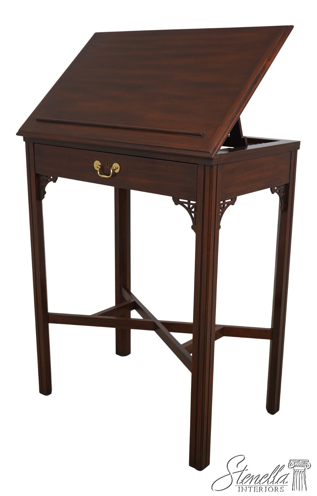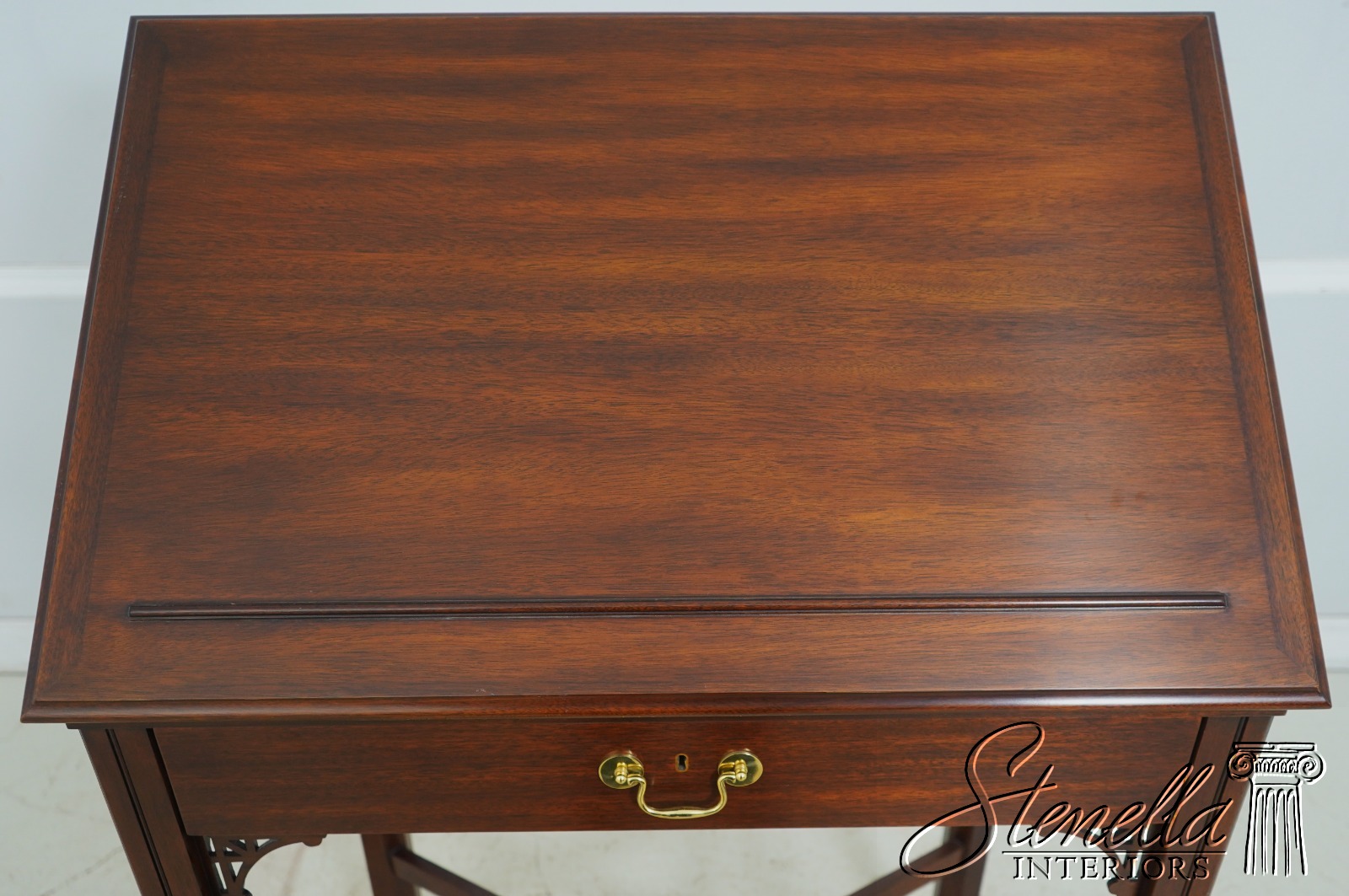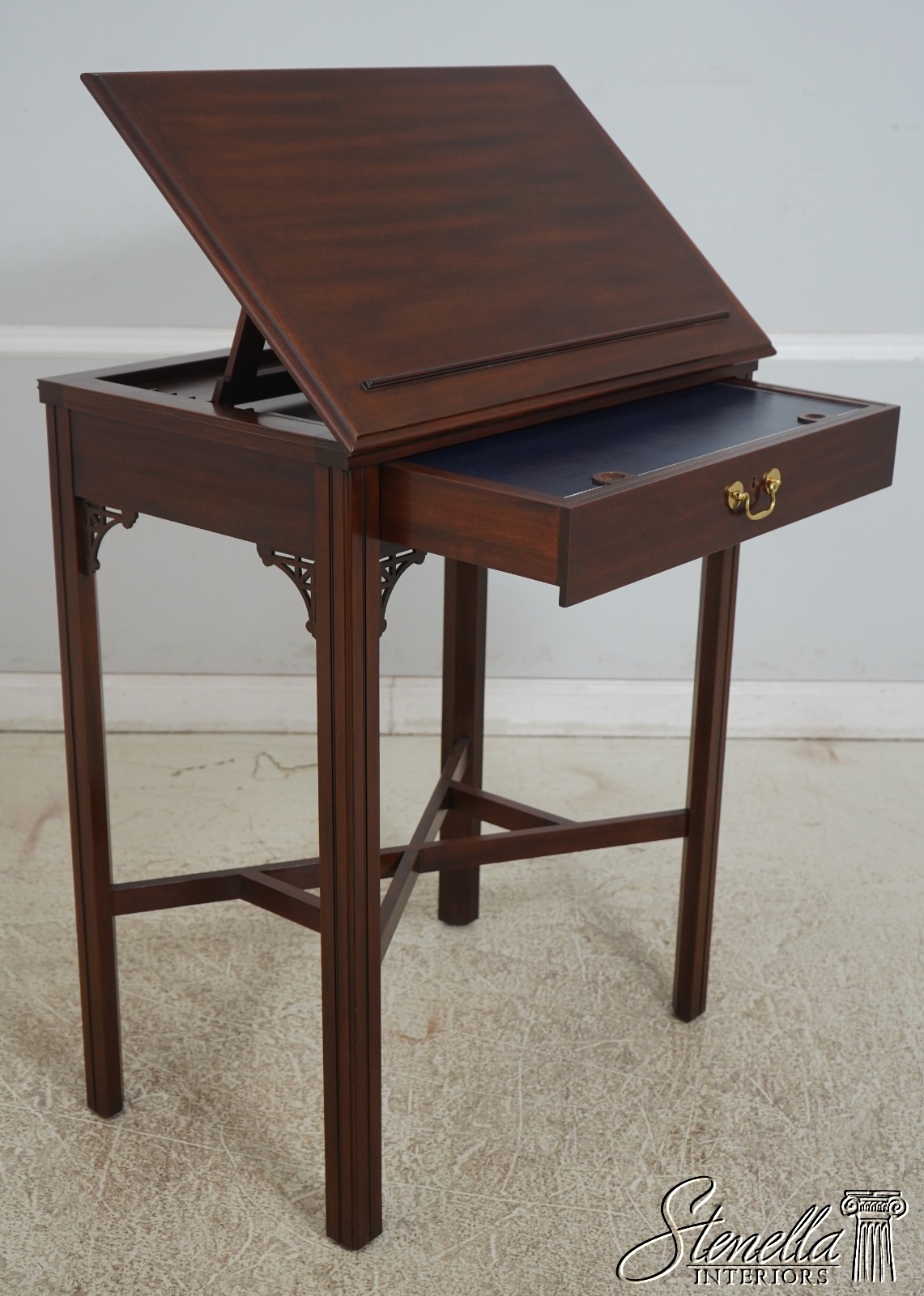 Details: Finish no.29 Thomas Jefferson Monticello Collection Adjustable Slant Top Mahogany Fine Carved Details High Quality Construction Nice Tooled Leather Slide Adjustable Slant Lid 18 C. Design Chippendale Style Blue Tooled Leather Interior Stretcher Base Frame Solid Brass Hardware Traditional Style Key Locking w. Key 1 Drawer Pierced Corner Accents Offered @ Fraction Original Retail Cost