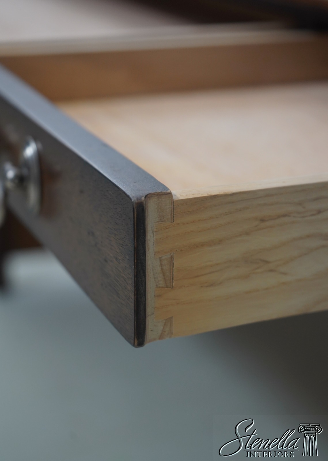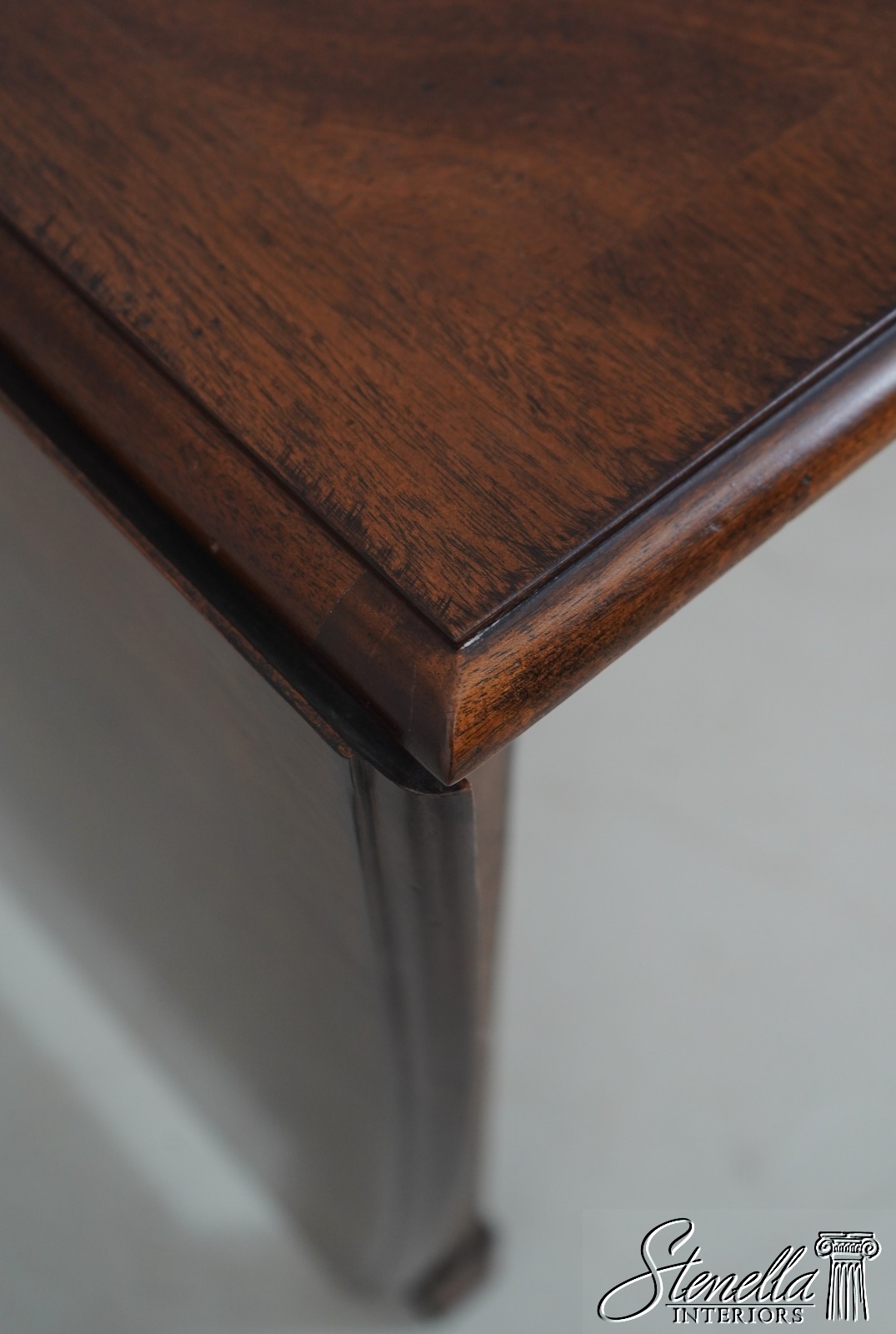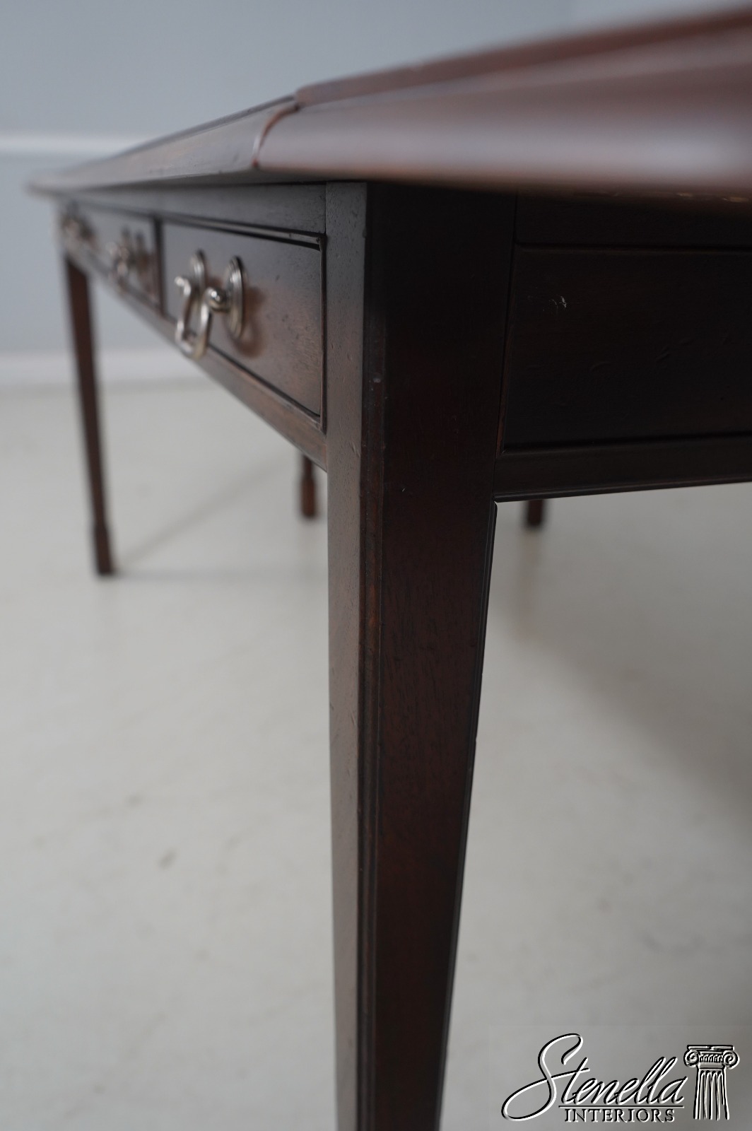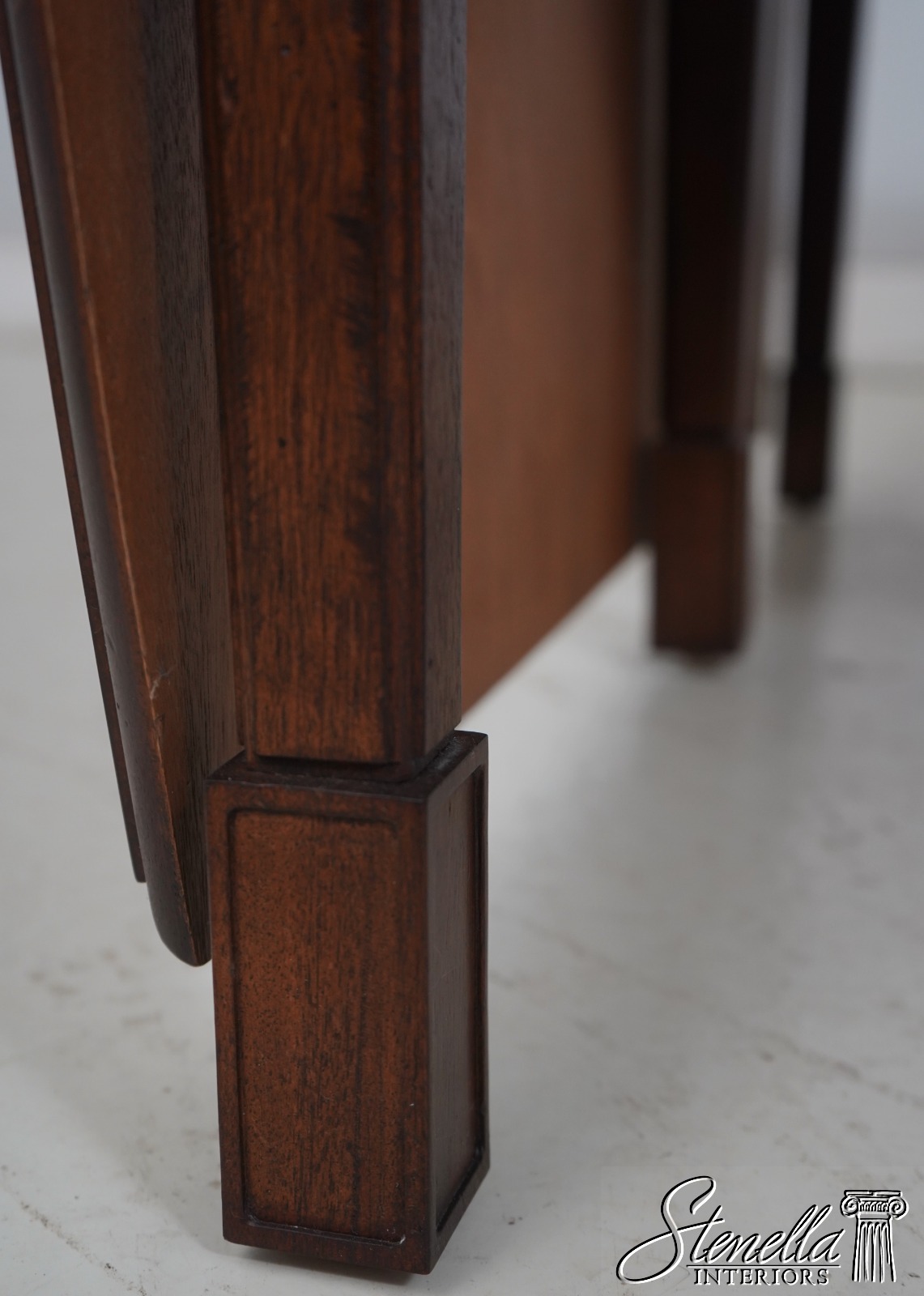 Details: Mahogany Dovetailed Drawer Construction Fine Carved Details Quality Construction Tapering Legs w. Block Feet Solid Brass Hardware Drawers On Both Sides Slide Out Legs Un-Marked As To Manufacture Offered @ F ration Original Retail Cost