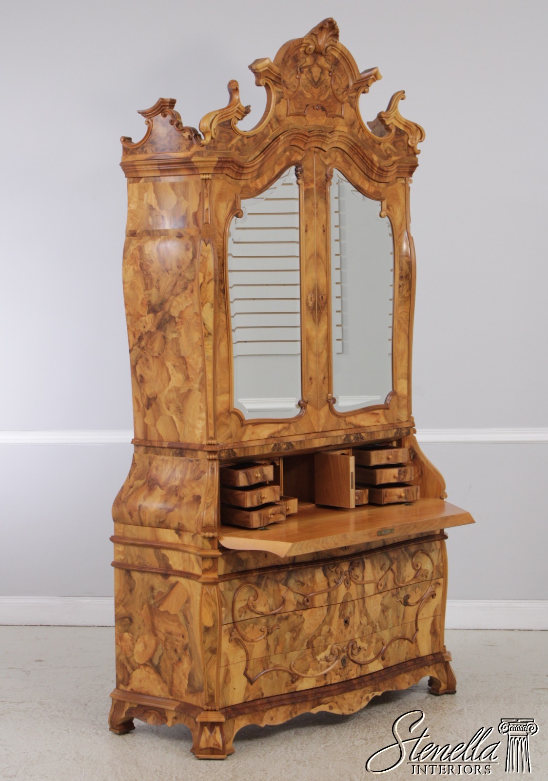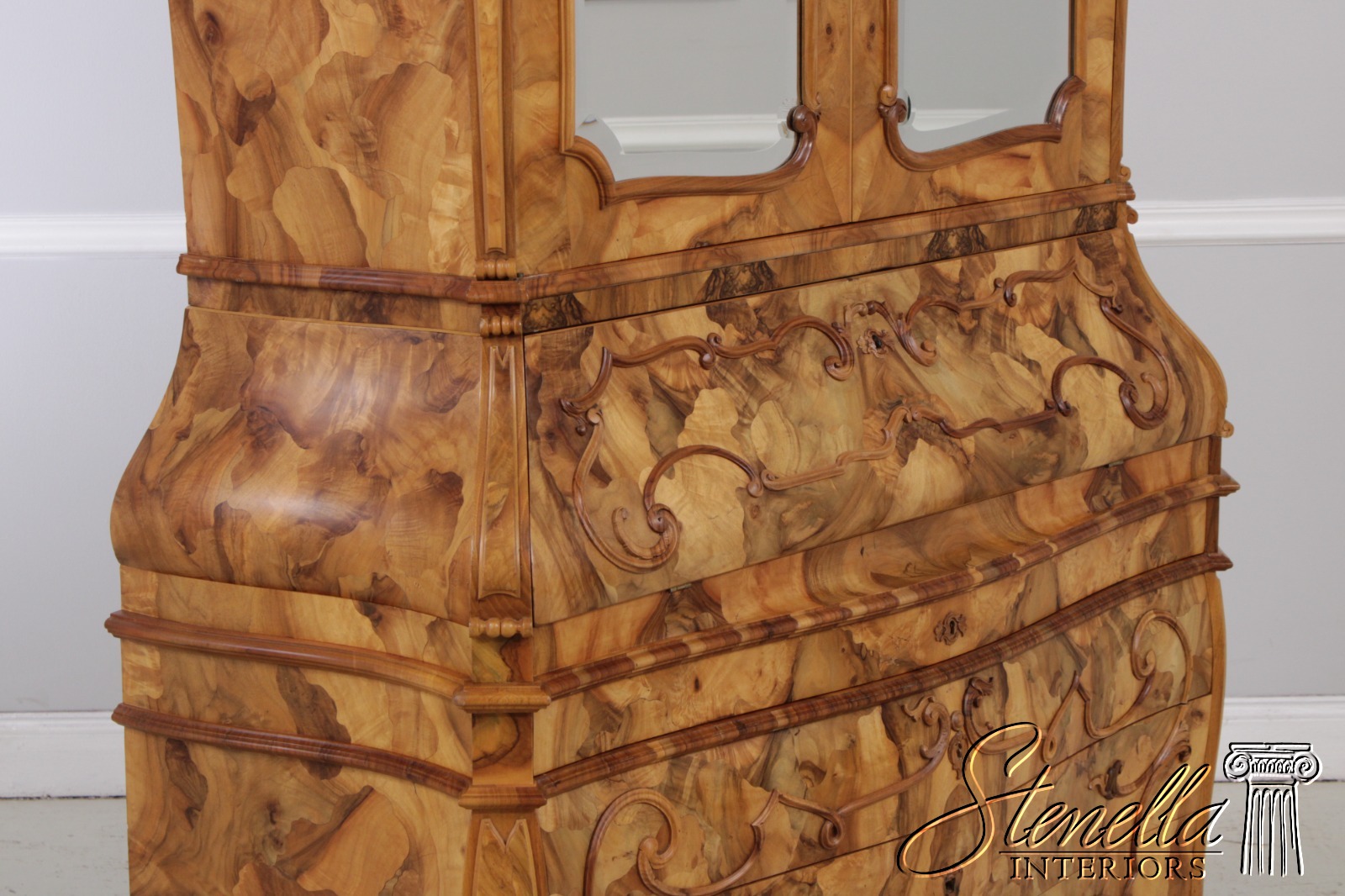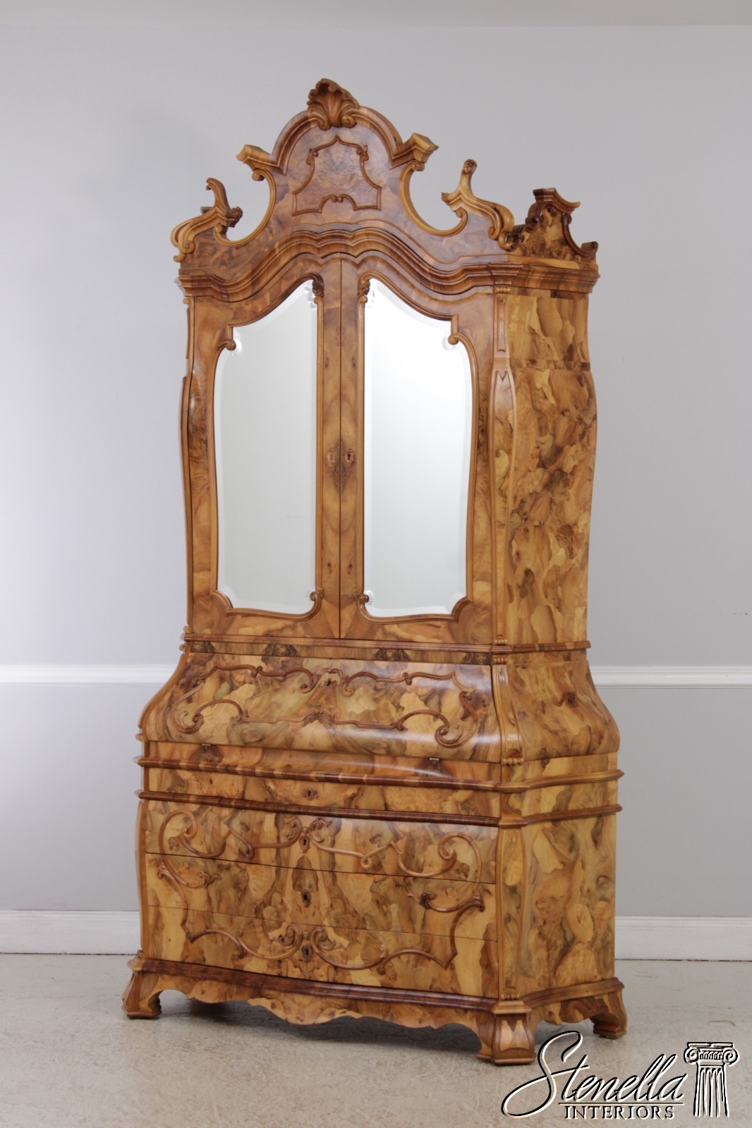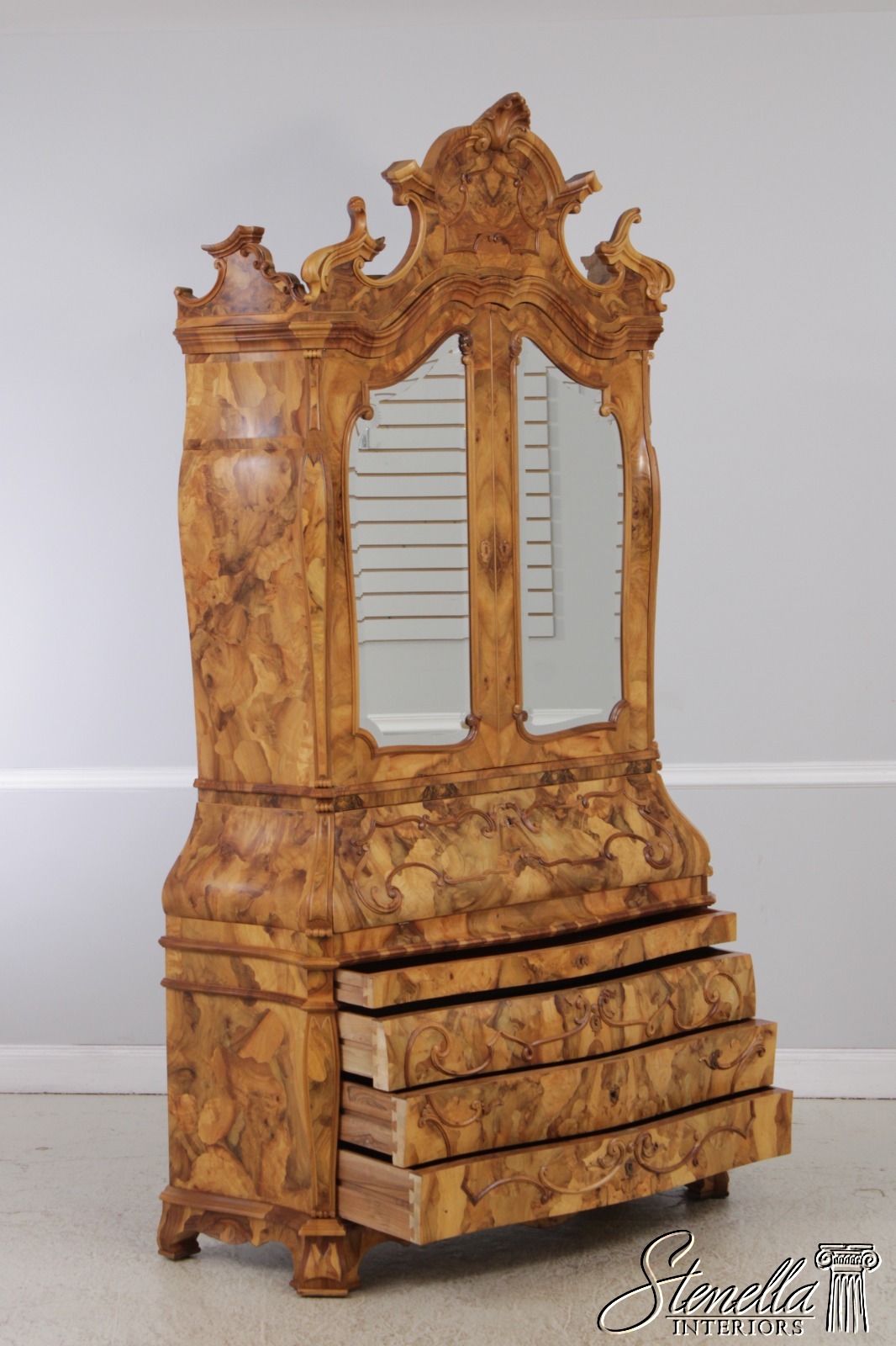 Details: Mirrored Doors Beveled Glass Dovetailed Drawer Construction Fine Carved Details High Quality Construction Large Impressive Cabinet Nice Inlay Work Throughout Traditional Style Three-Piece Construction Multiple Cubby Storage Nice Fitted Interior Ornate Details Throughout Key Locking With Key Gorgeous Olive Wood Construction