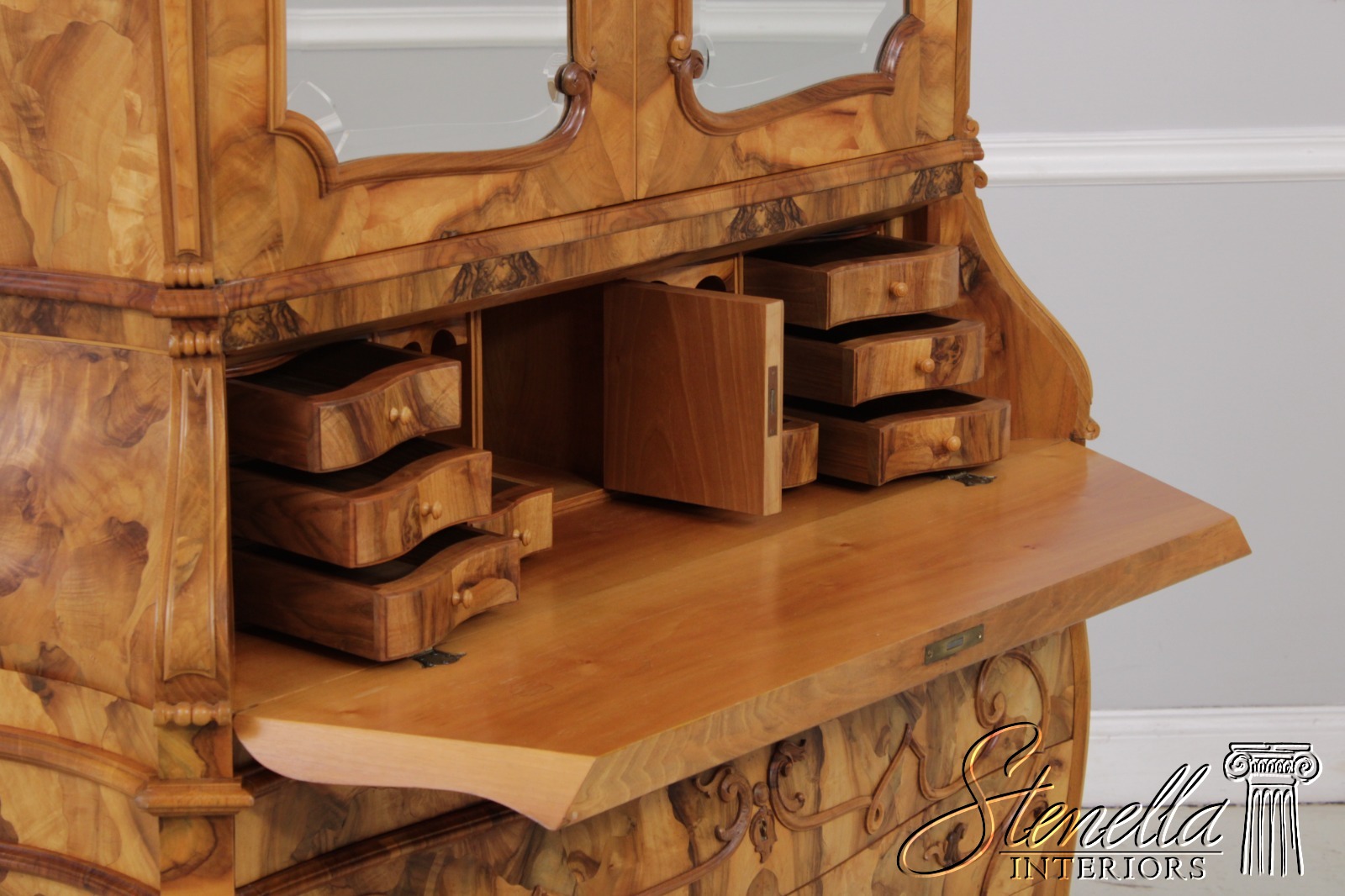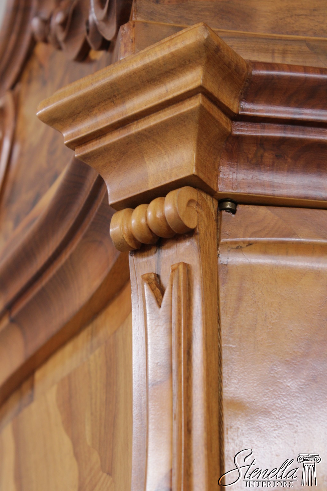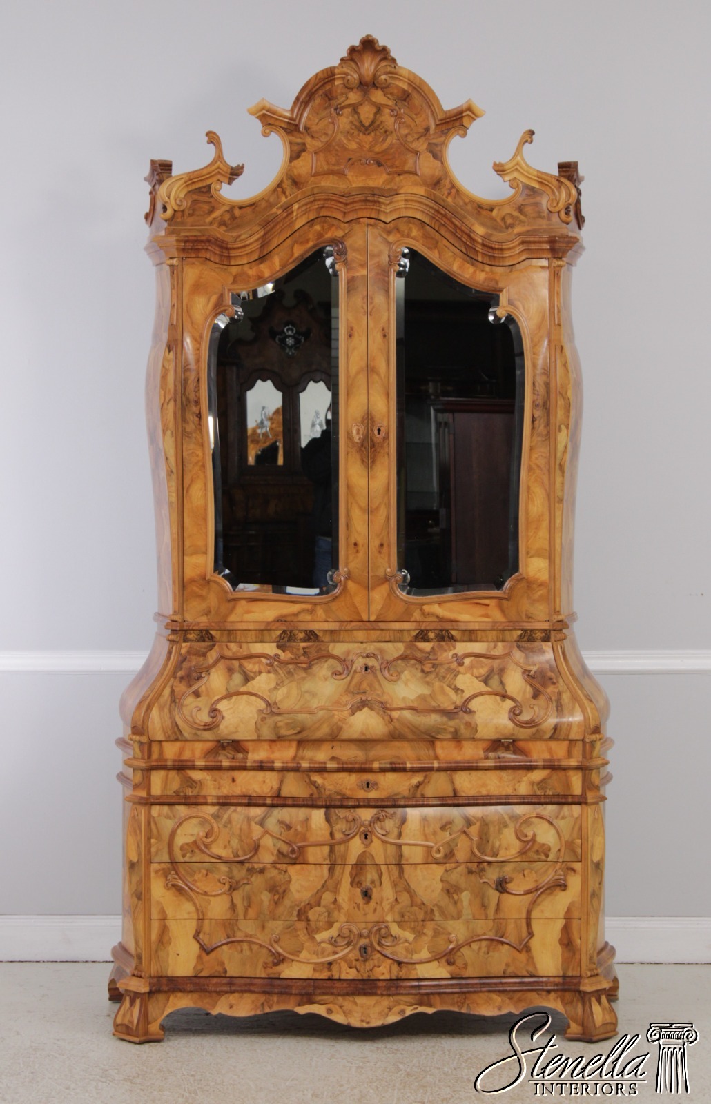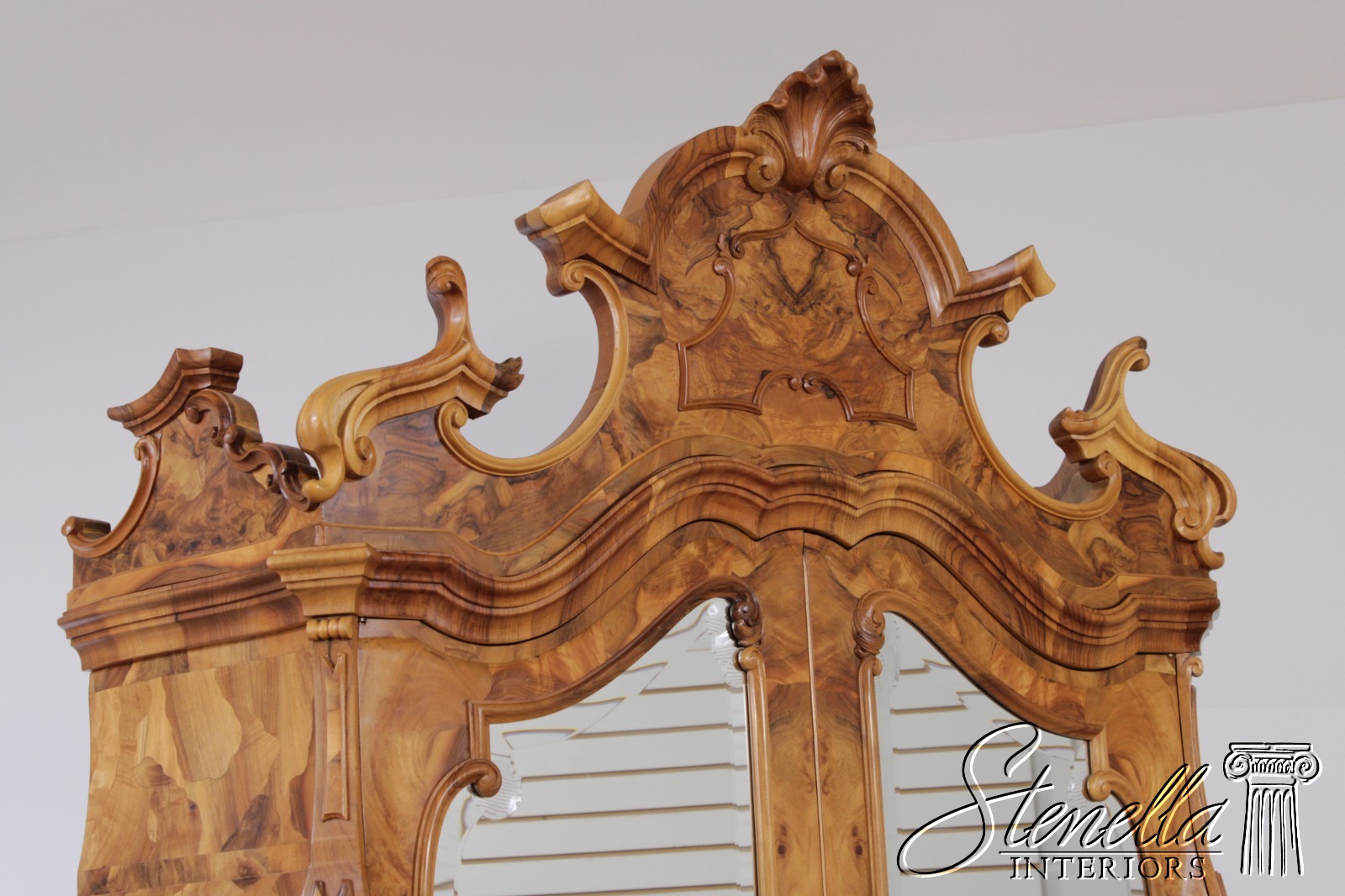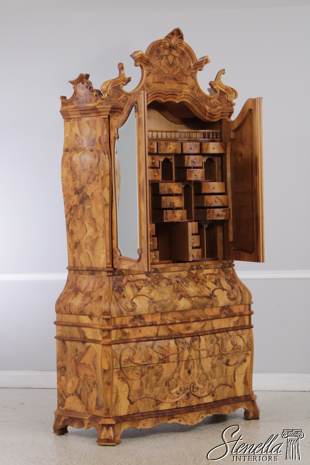 Details: Mirrored Doors Beveled Glass Dovetailed Drawer Construction Fine Carved Details High Quality Construction Large Impressive Cabinet Nice Inlay Work Throughout Traditional Style Three-Piece Construction Multiple Cubby Storage Nice Fitted Interior Ornate Details Throughout Key Locking With Key Gorgeous Olive Wood Construction