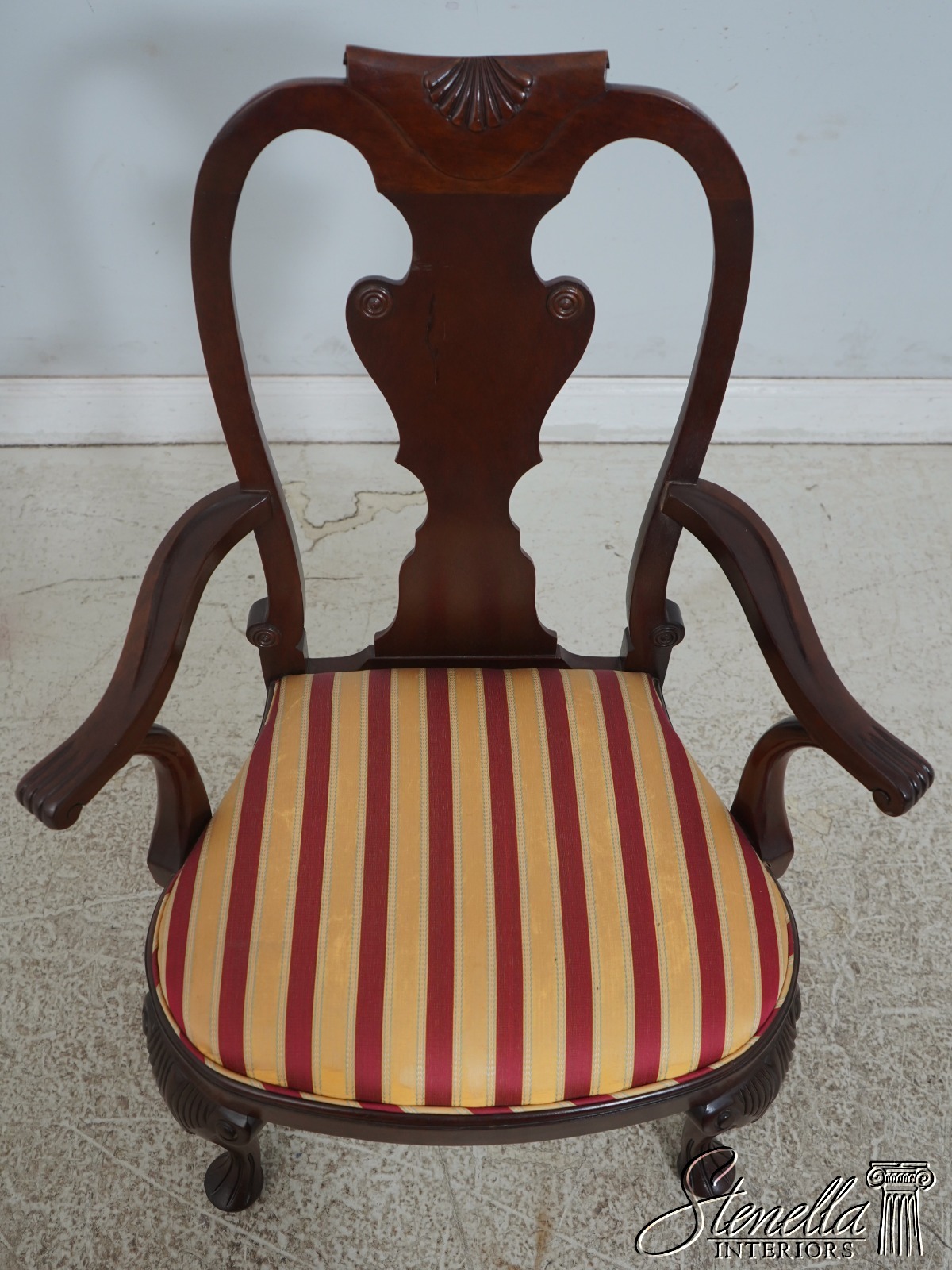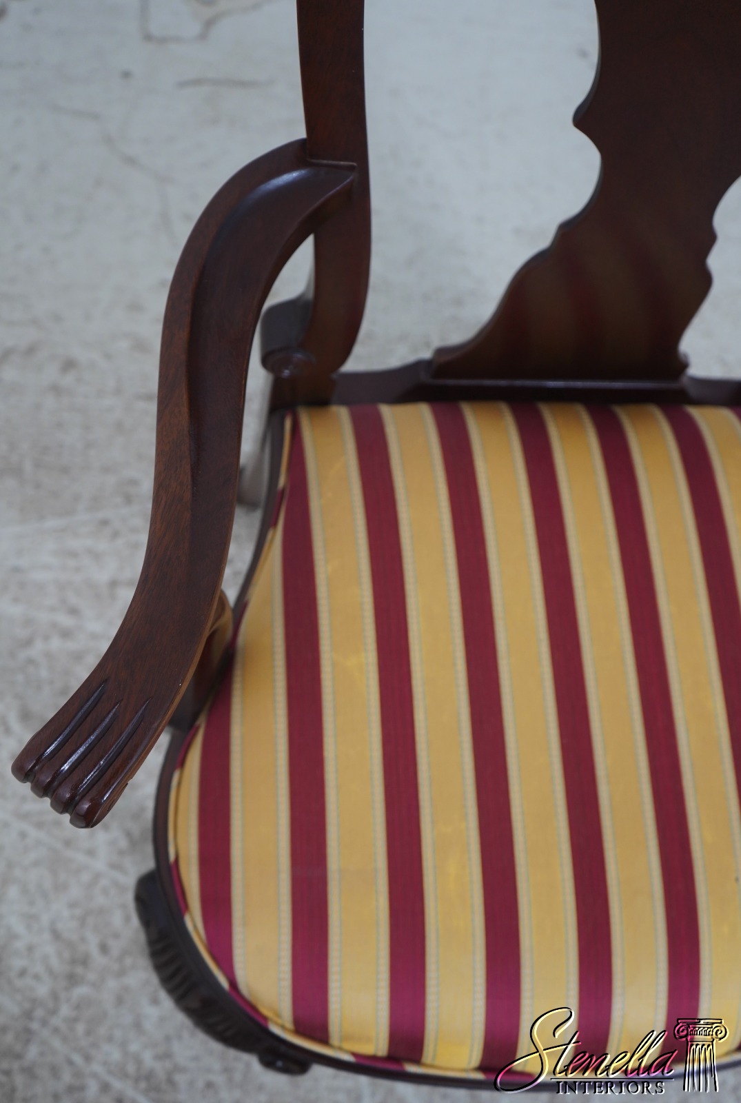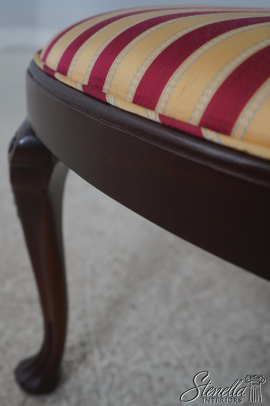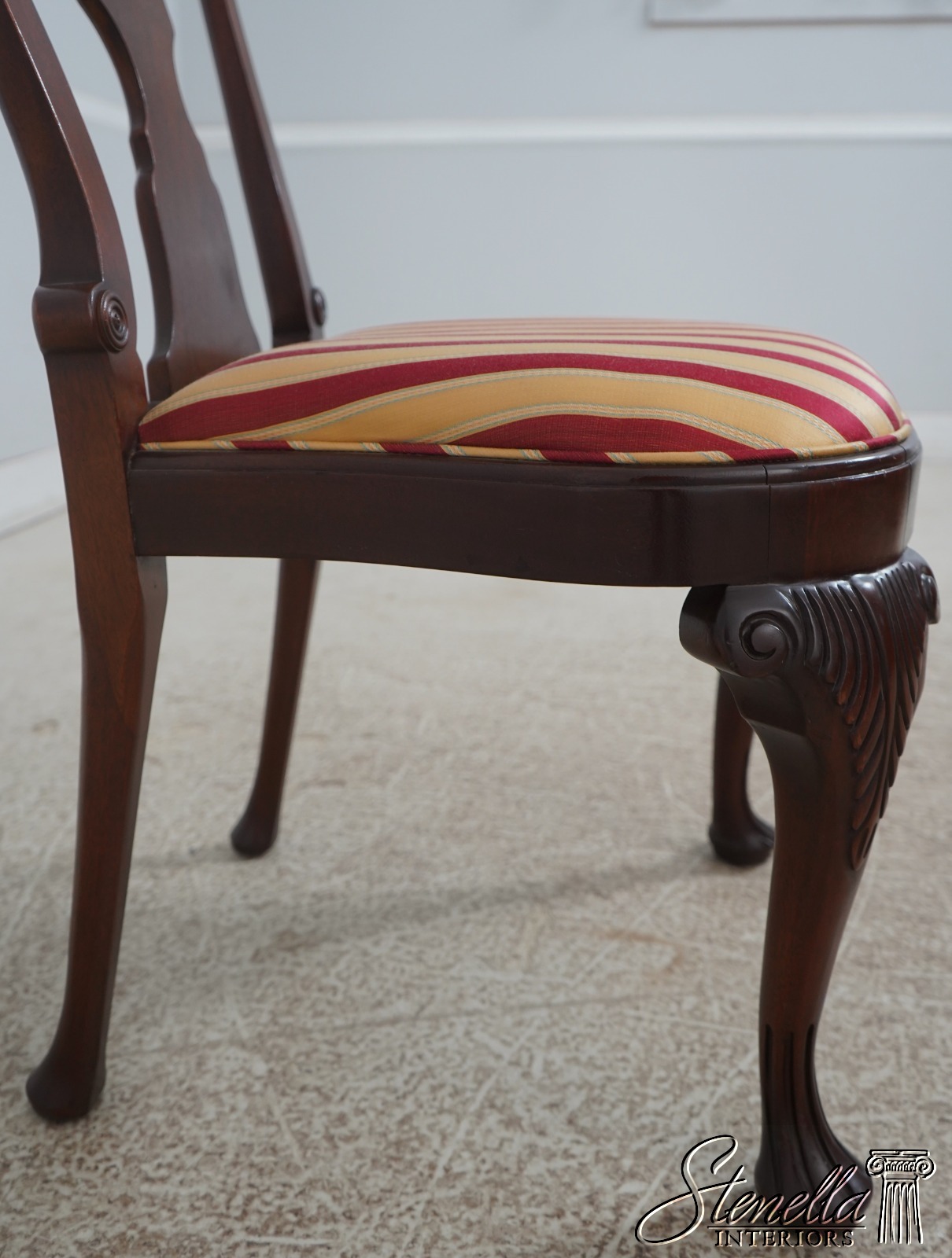 Details: Nice Striped Upholstery w. Minor Light Soiling Quality Construction Queen Anne Legs & Pad Feet Carved Knees Reddish Mahogany Finish Offered @ Fraction Original Retail Cost