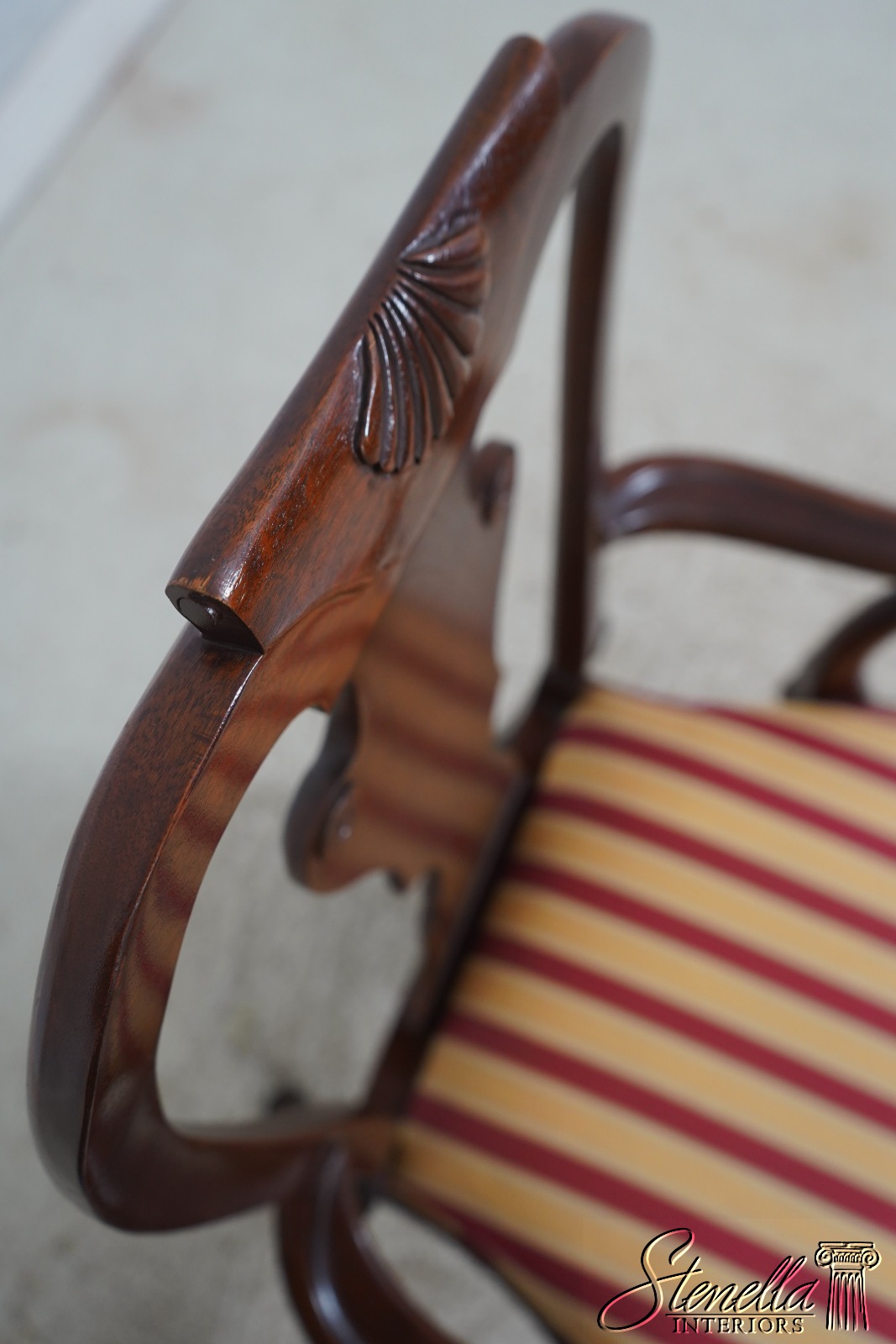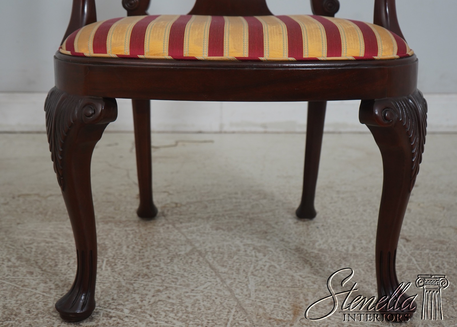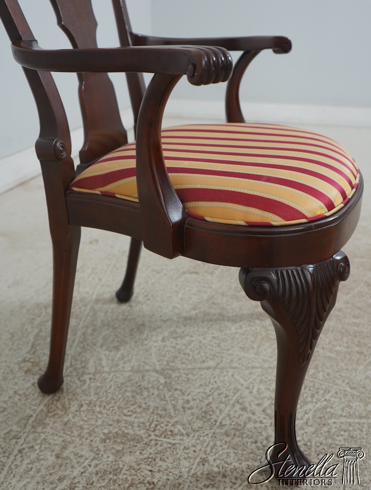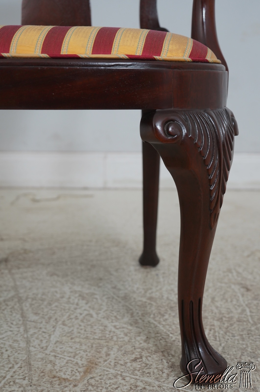 Details: Nice Striped Upholstery w. Minor Light Soiling Quality Construction Queen Anne Legs & Pad Feet Carved Knees Reddish Mahogany Finish Offered @ Fraction Original Retail Cost